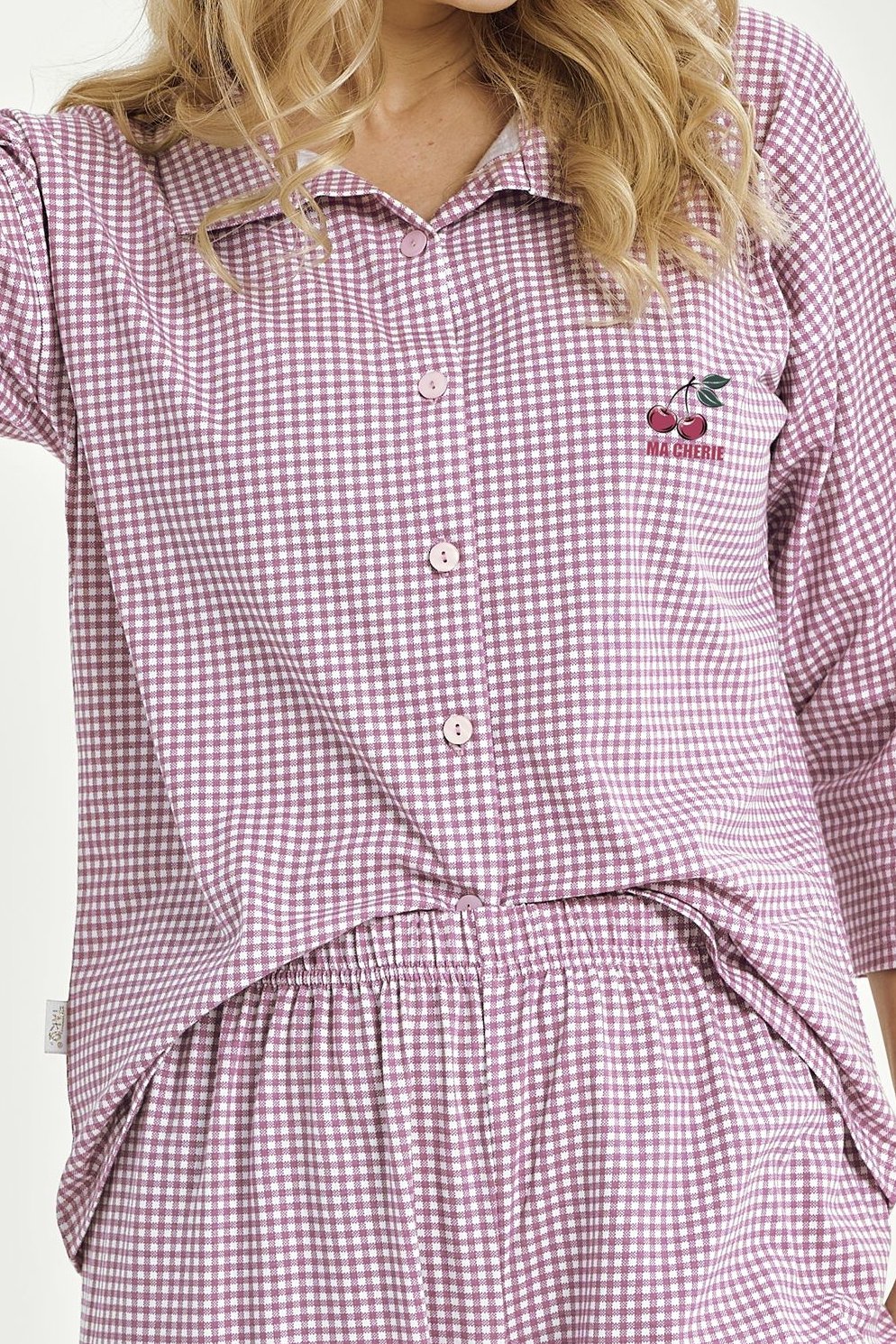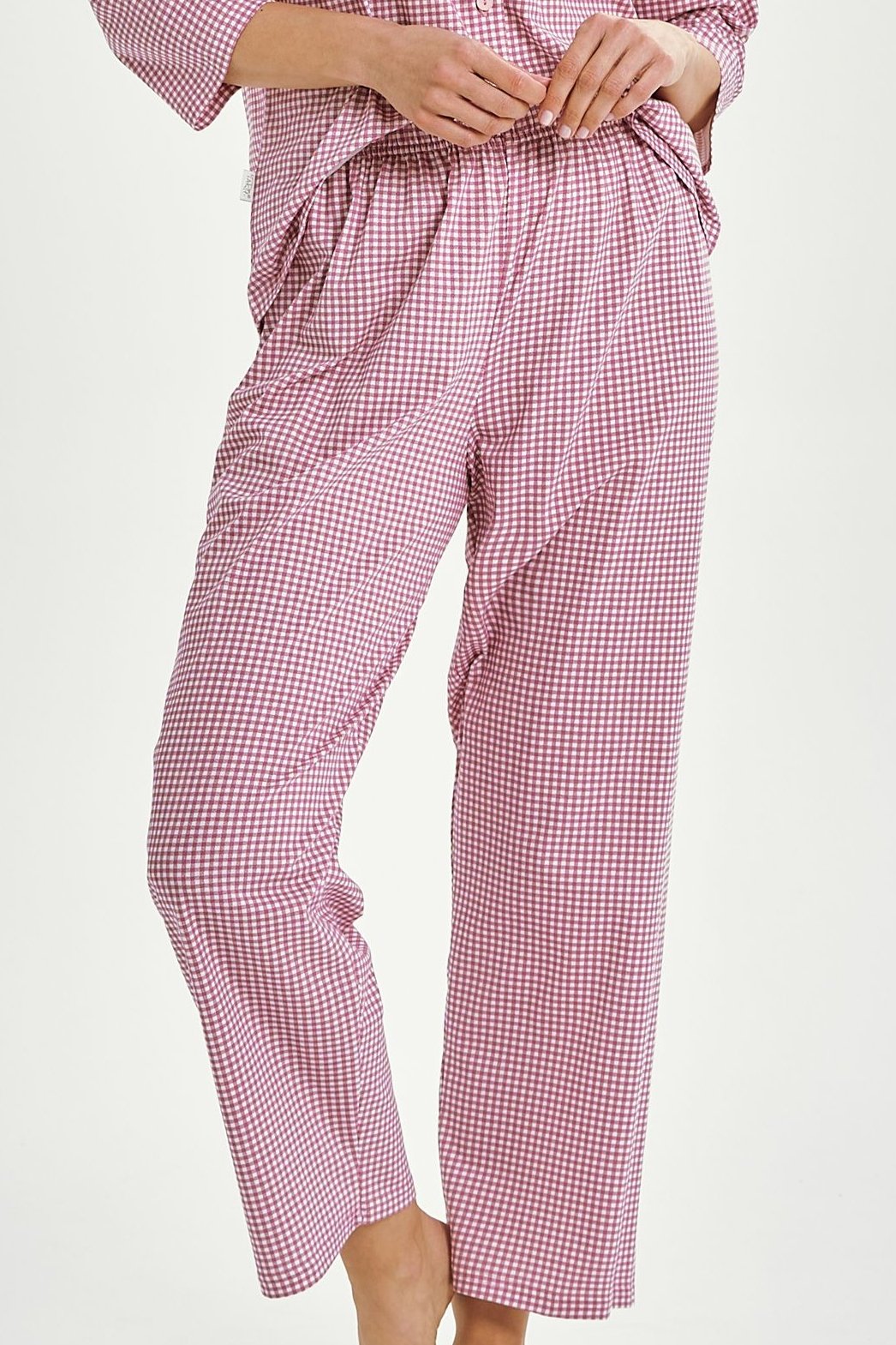 Horní díl ve stylu košile má límeček, 3/4 rukávy a zapínání na knoflíky – díky tomu působí upraveně a zároveň prakticky. Spodní díl tvoří kalhoty s rovným střihem, které neomezují v pohybu a zaručují volnost a pohodlí. V pase pohodlná guma. Kostkovaný motiv v jemných růžových odstínech dodává pyžamu půvabný, ženský charakter. Model Jolie je ideální pro milovnice klasiky, které si potrpí na pohodlí, styl a kvalitní přírodní materiály.