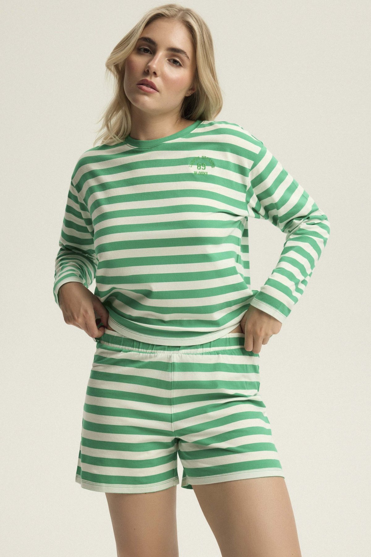 Dámské pyžamo Kelley vyniká svěžím barevným provedením a lehce sportovním charakterem. Kombinuje pohodlí s moderním designem – zeleno-krémové pruhy působí optimisticky, zatímco měkký bavlněný úplet příjemně hladí pokožku. Horní díl s dlouhými rukávy poskytuje teplo a komfort během chladnějších večerů, šortky s elastickým pasem zajišťují naprostou volnost pohybu. Tento komplet se skvěle hodí nejen na spánek, ale i pro lenivé víkendové ráno nebo večerní relax doma. Kelley je důkazem, že pohodlí a styl mohou jít ruku v ruce.
