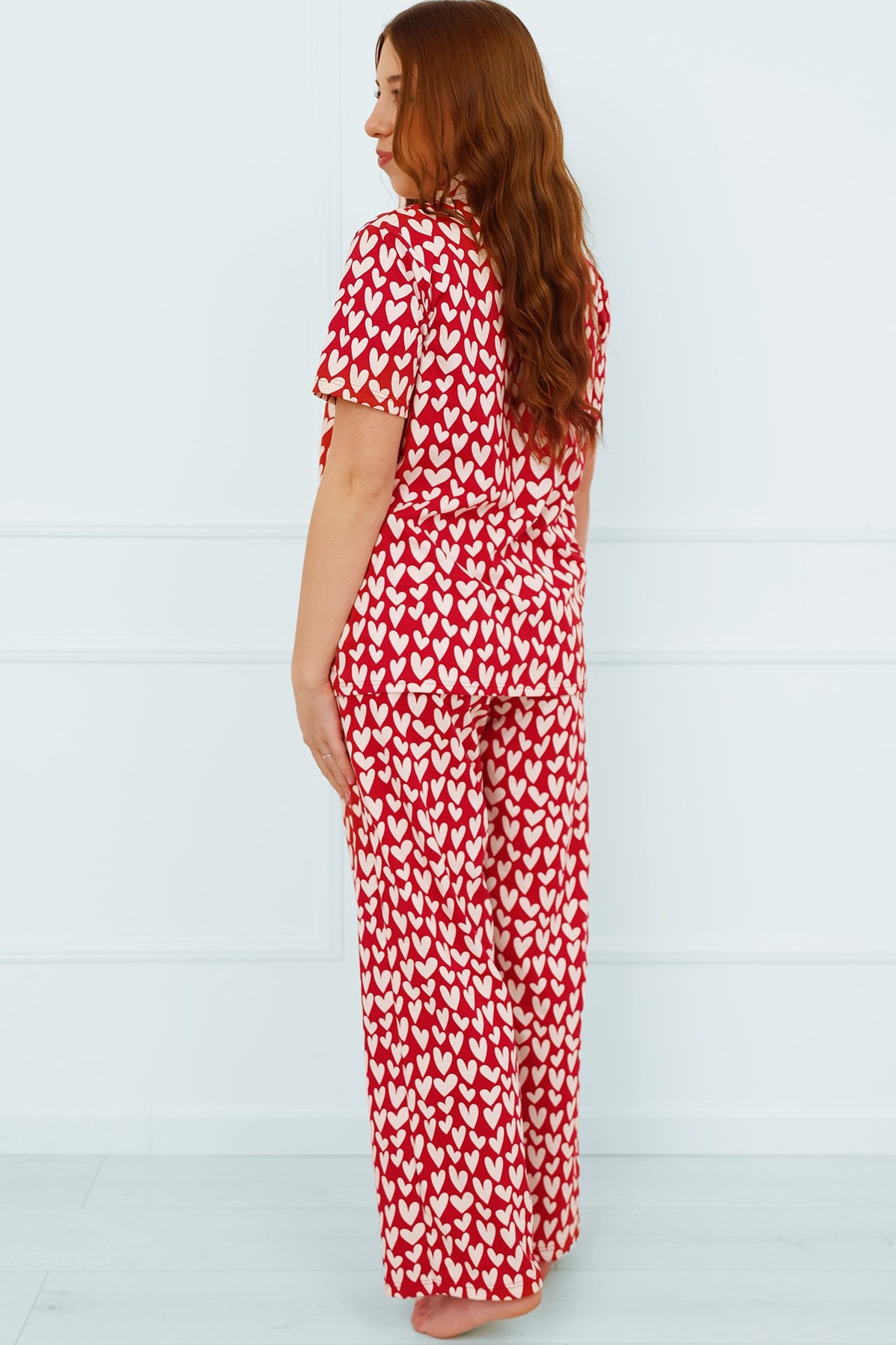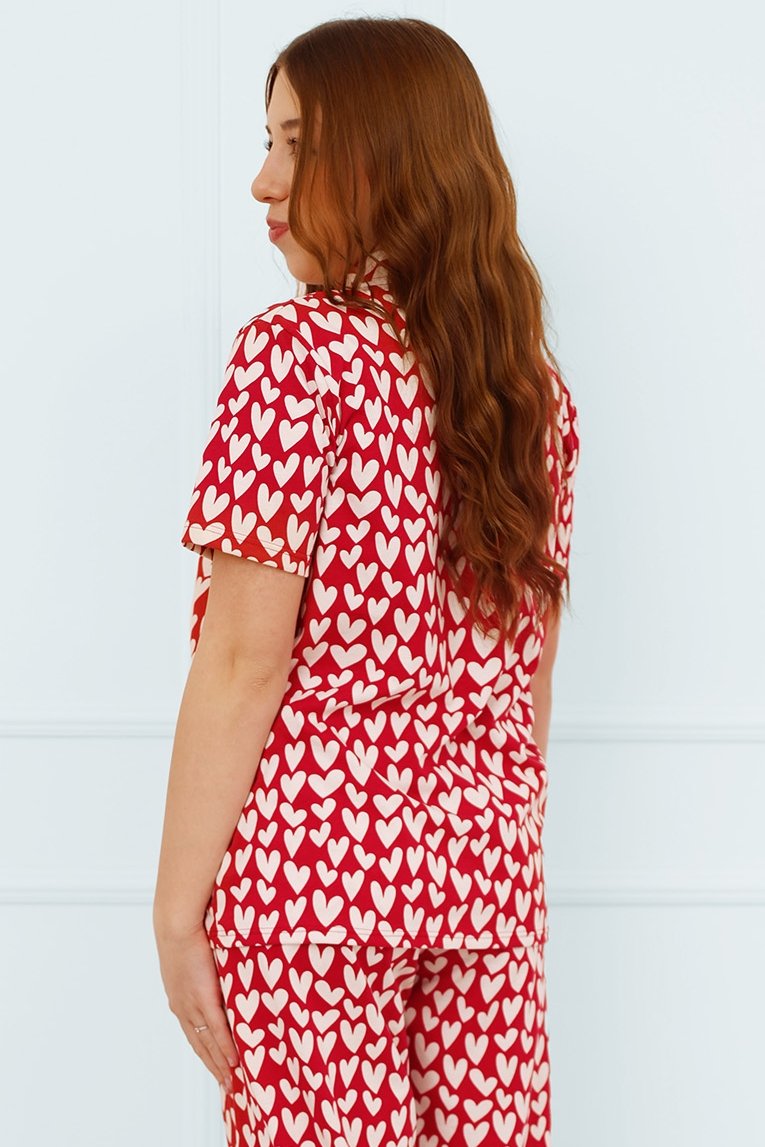 Košile s krátkým rukávem má praktické celopropínací zapínání na knoflíčky a je doplněna klasickým límečkem, který zdobí jemná bílá paspulka. Dlouhé kalhoty s volnějšími, širokými nohavicemi se postarají o volnost pohybu a pohodlné nošení. Díky elastickému pasu s měkkou gumou a dvěma bočním kapsám jsou kalhoty nejen praktické, ale i maximálně pohodlné. Celek doplňuje romantický vzor srdíček, díky němuž se pyžamo stává stylovým kouskem, který využijete nejen na spaní, ale i pro domácí relax.