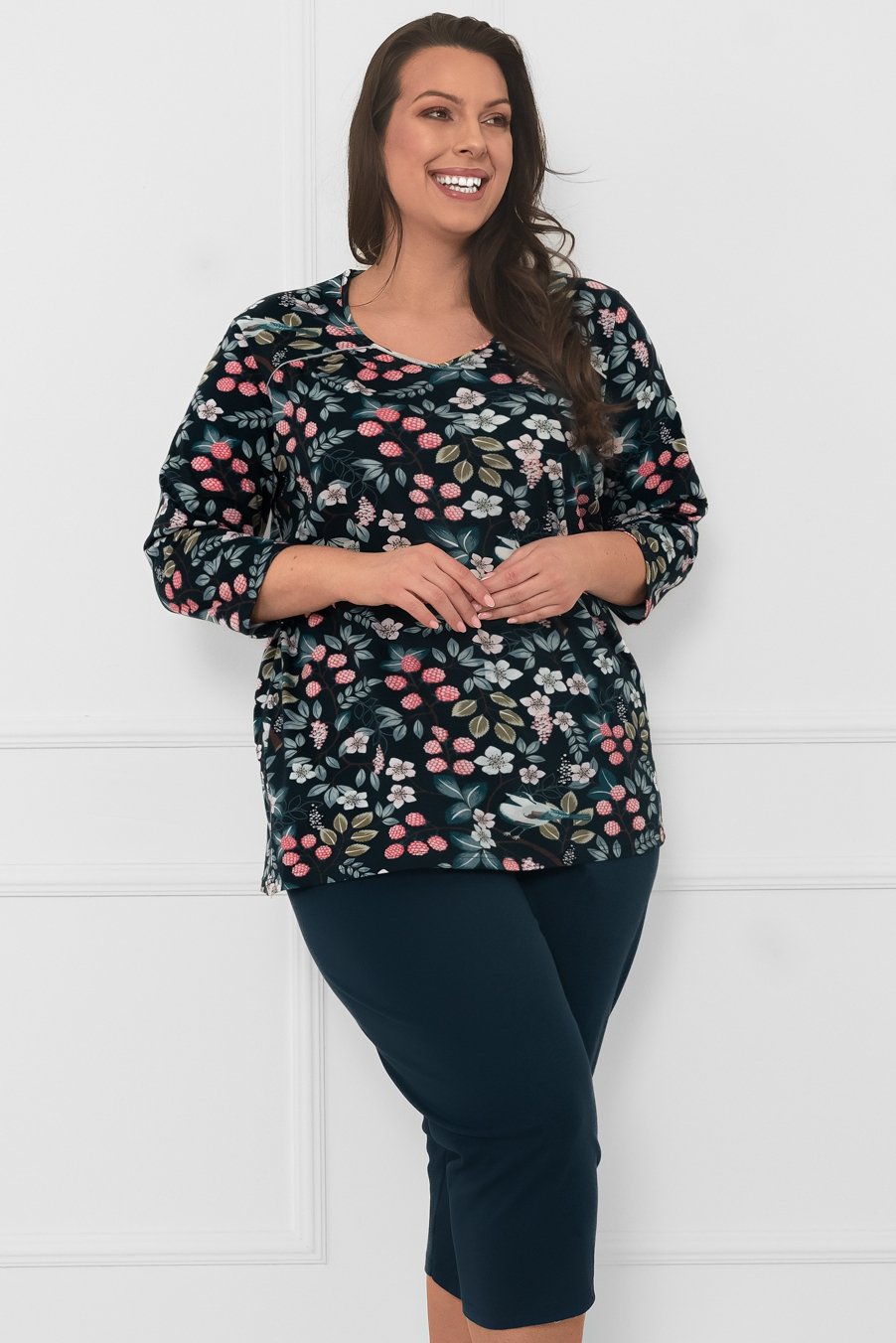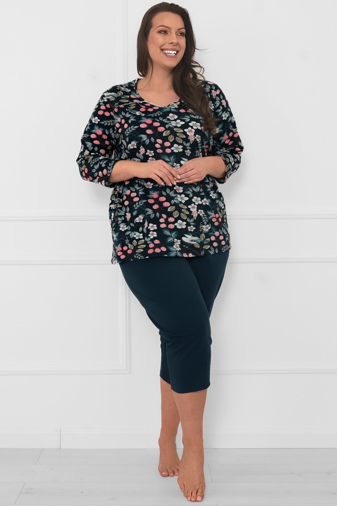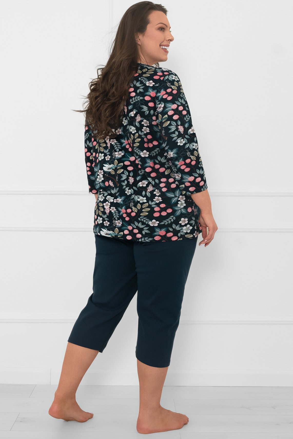 Dámské pyžamo Lucja je ideální pro ženy, které milují eleganci a pohodlí v jednom. Halenka s výstřihem do V a 3/4 rukávy působí žensky, jemné řasení dodává modelu nádech lehkosti. Květinový vzor na tmavém podkladu vytváří atraktivní kontrast, zatímco jednobarevné kalhoty ve 3/4 délce zaručují volnost pohybu i během spánku. Měkká guma v pase netlačí. Pyžamo je vyrobené z kvalitní bavlny, která je prodyšná, příjemná na dotek a ideální pro celoroční nošení.