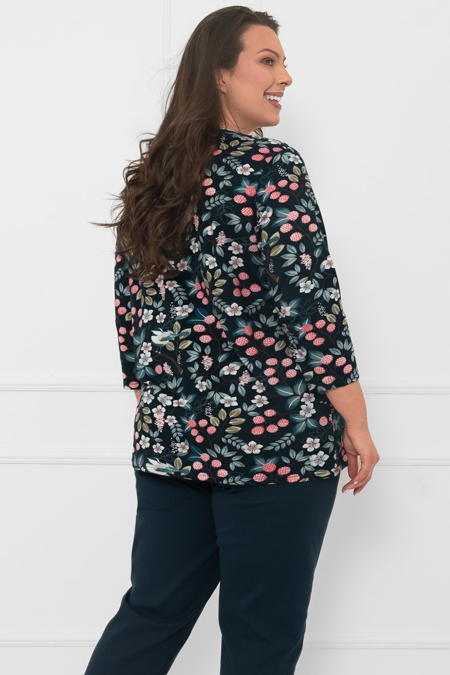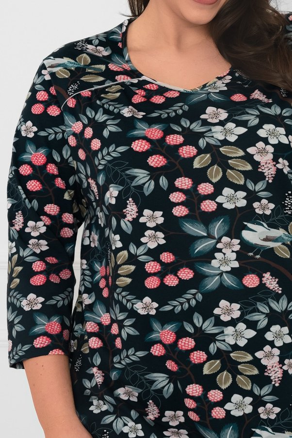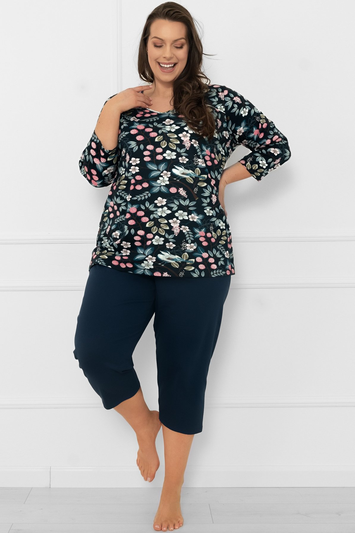 Dámské pyžamo Lucja je ideální pro ženy, které milují eleganci a pohodlí v jednom. Halenka s výstřihem do V a 3/4 rukávy působí žensky, jemné řasení dodává modelu nádech lehkosti. Květinový vzor na tmavém podkladu vytváří atraktivní kontrast, zatímco jednobarevné kalhoty ve 3/4 délce zaručují volnost pohybu i během spánku. Měkká guma v pase netlačí. Pyžamo je vyrobené z kvalitní bavlny, která je prodyšná, příjemná na dotek a ideální pro celoroční nošení.