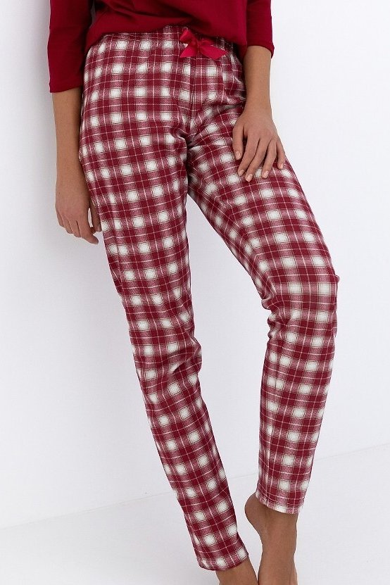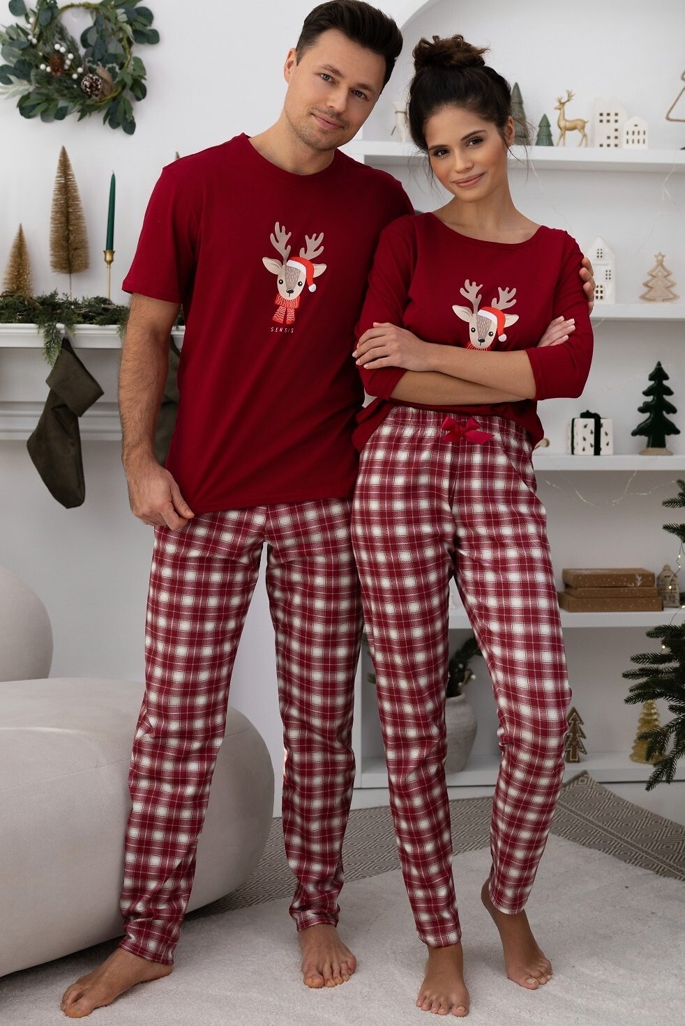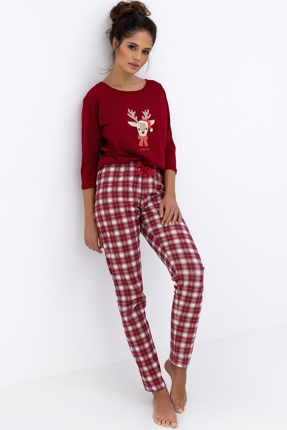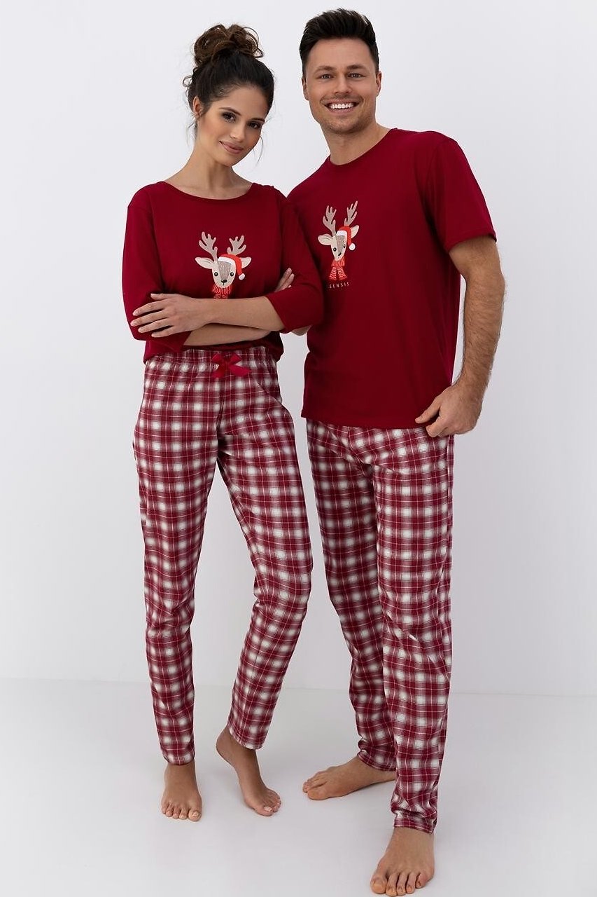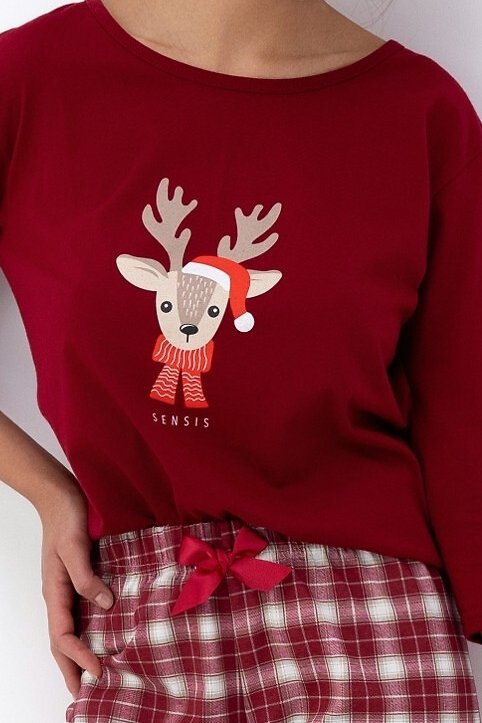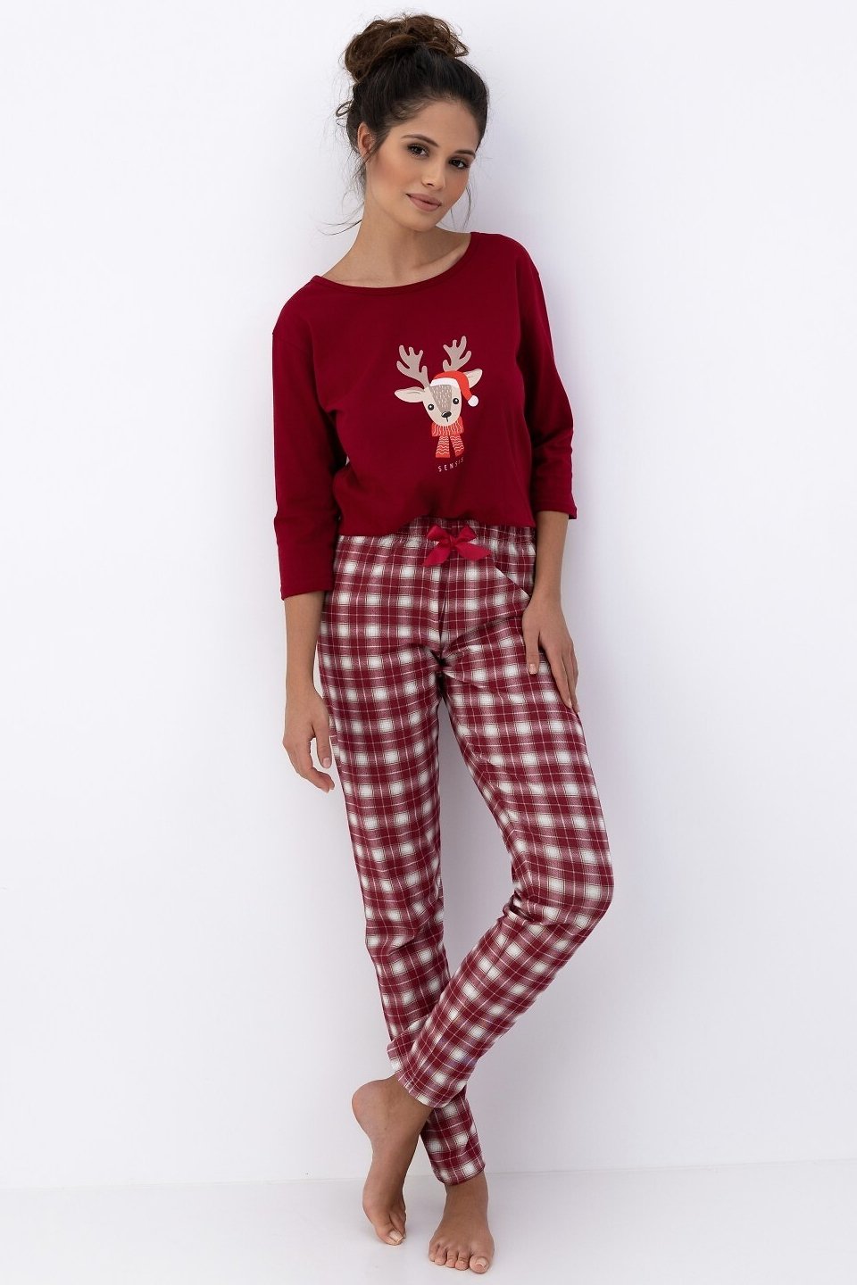 Horní díl s 3/4 rukávy zdobí roztomilý vánoční motiv, který navodí příjemnou atmosféru domova. Dlouhé kostkované kalhoty doplňuje pružný pas se saténovou mašličkou, což zajišťuje dokonalé pohodlí i jemný ženský detail. Měkká bavlna poskytuje hřejivost a prodyšnost, díky čemuž je pyžamo skvělé nejen na spaní, ale i na relax během chladných večerů.