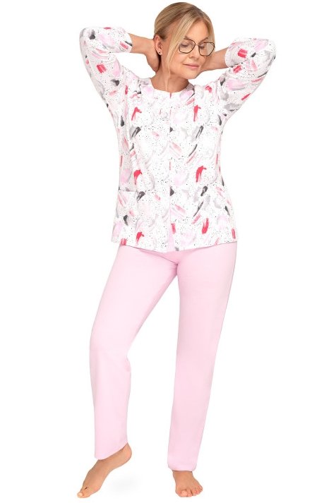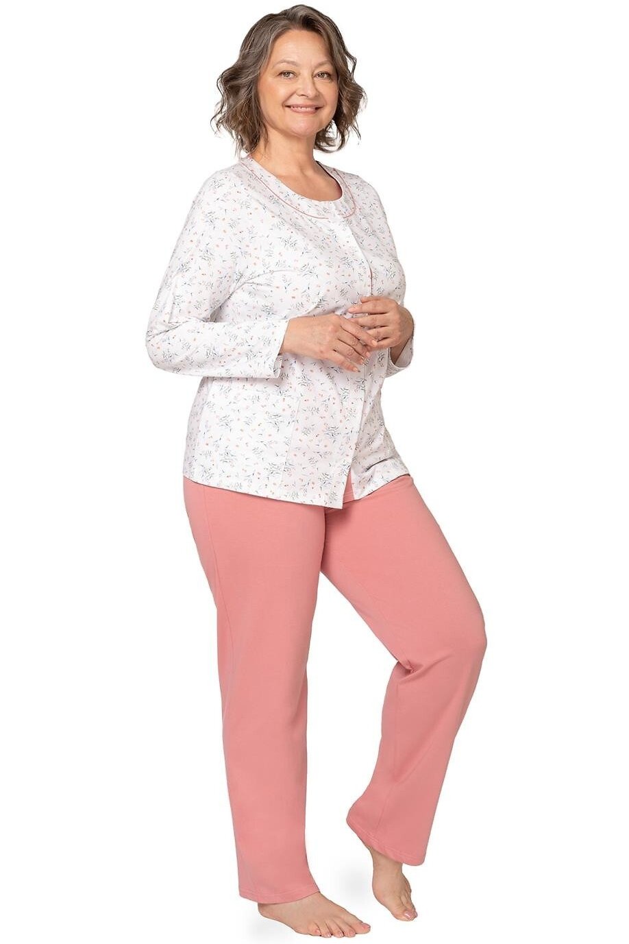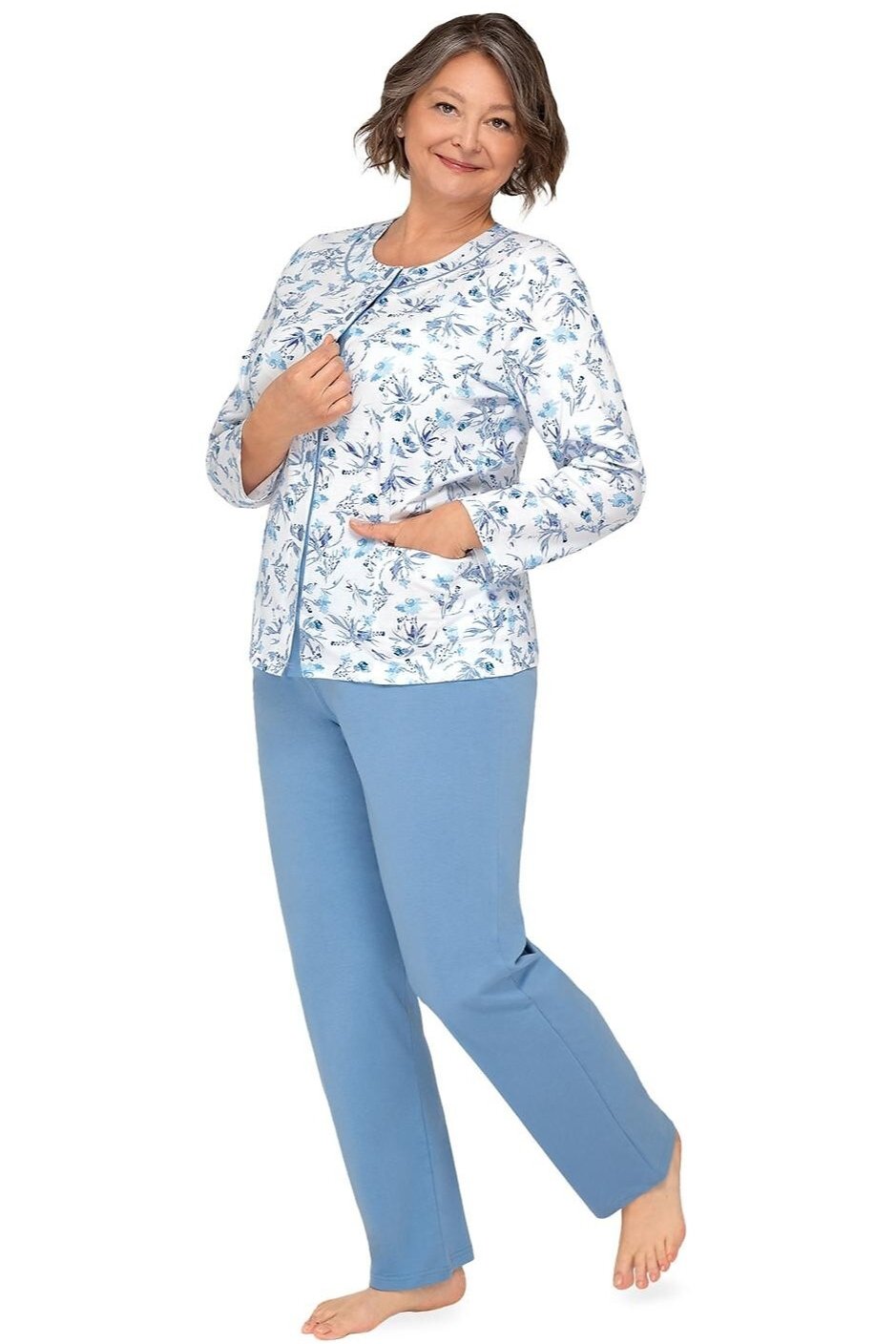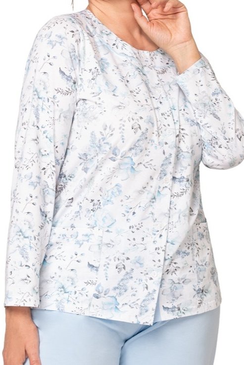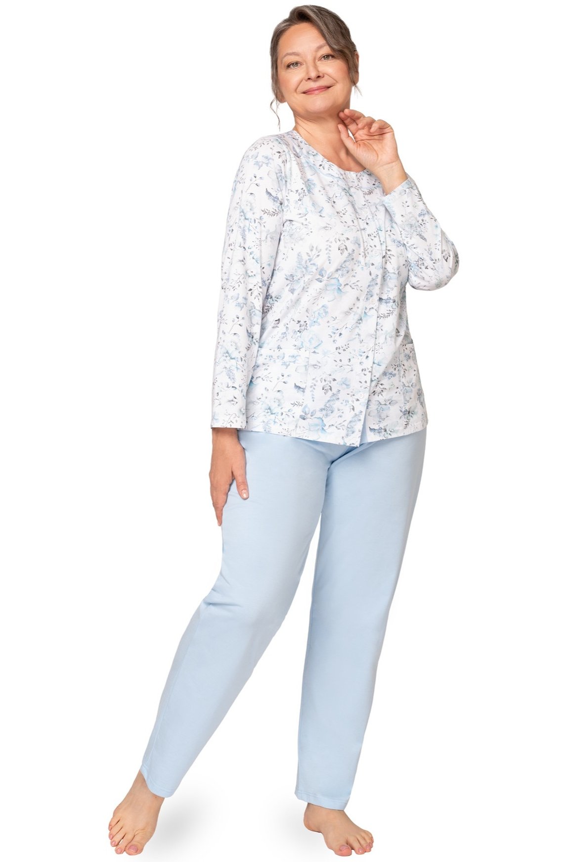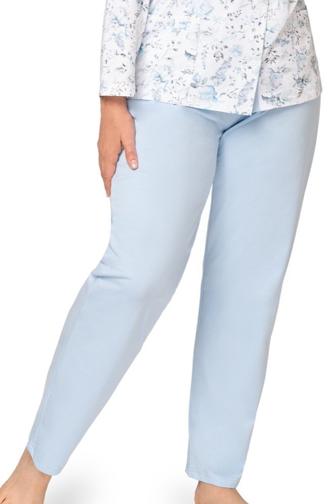 Ušité z kvalitní bavlny. Materiál je měkký, prodyšný a jemný k pokožce. Vrchní díl s dlouhým rukávem má plné zapínání na knoflíky. Stylový vzor působí žensky a dodává modelu šmrnc, kulatý výstřih podtrhuje klasický vzhled. Dlouhé kalhoty v jednobarevném provedení doplňuje pohodlná guma v pase, která se přizpůsobí postavě a poskytuje volnost pohybu.