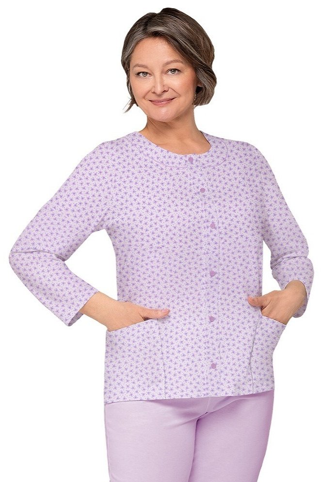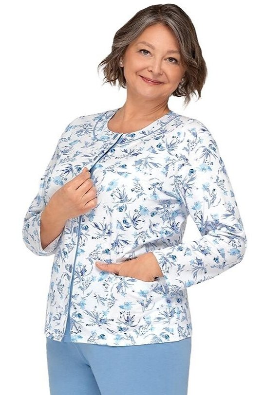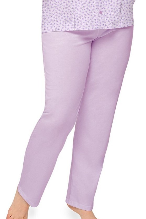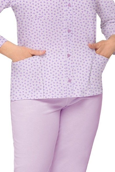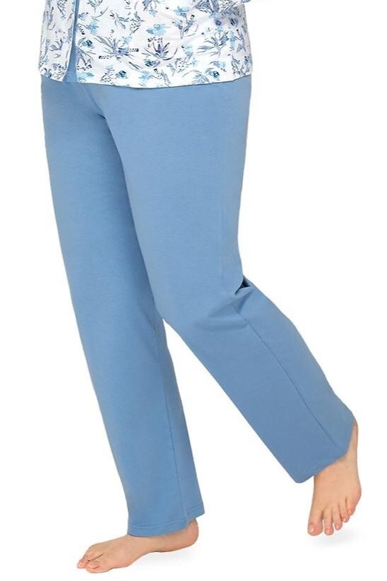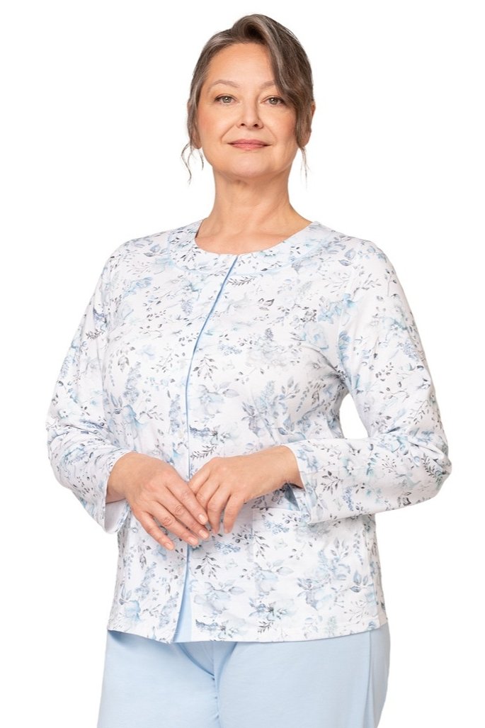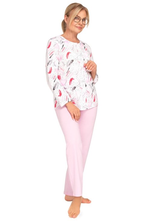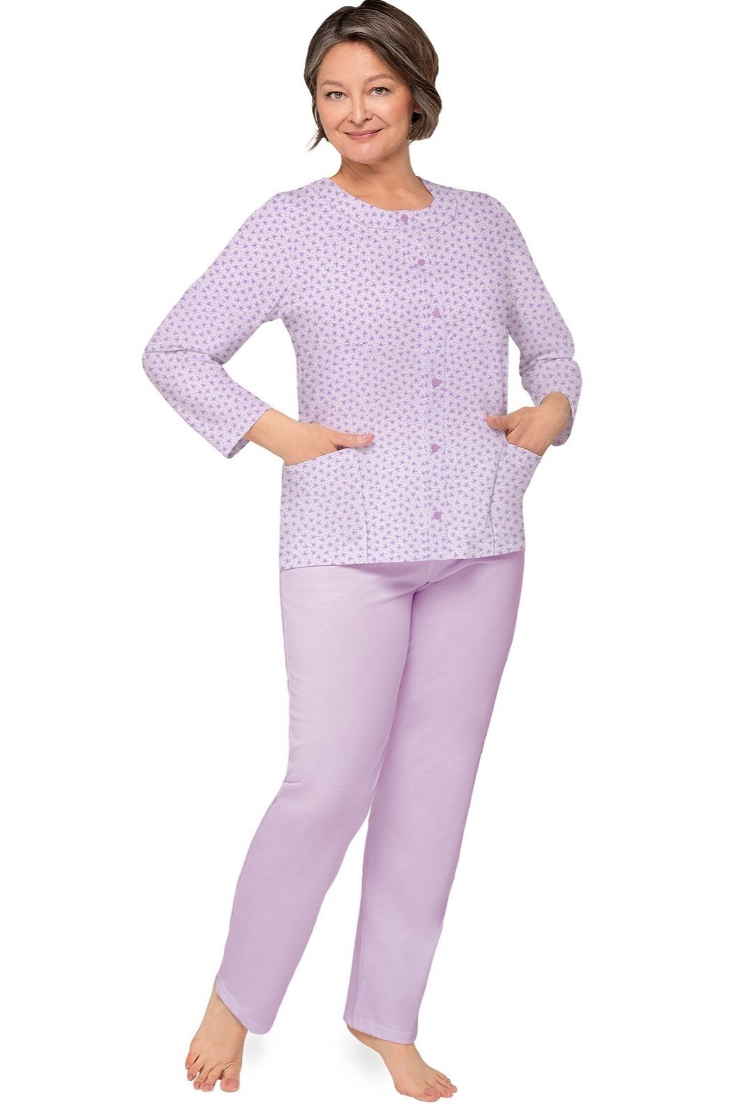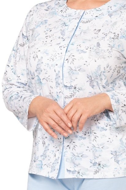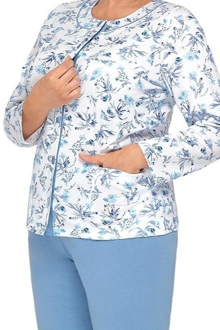 Ušité z kvalitní bavlny. Materiál je měkký, prodyšný a jemný k pokožce. Vrchní díl s dlouhým rukávem má plné zapínání na knoflíky. Stylový vzor působí žensky a dodává modelu šmrnc, kulatý výstřih podtrhuje klasický vzhled. Dlouhé kalhoty v jednobarevném provedení doplňuje pohodlná guma v pase, která se přizpůsobí postavě a poskytuje volnost pohybu.