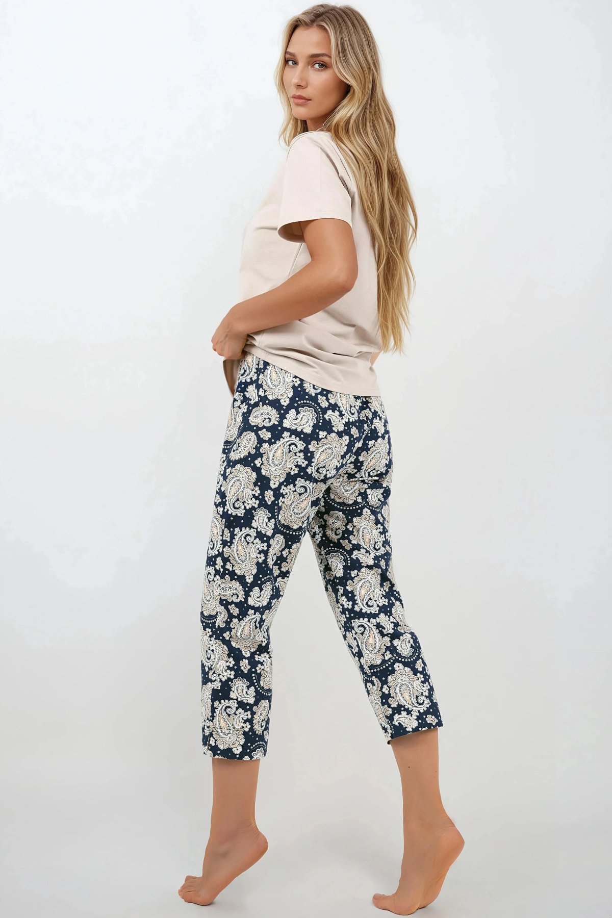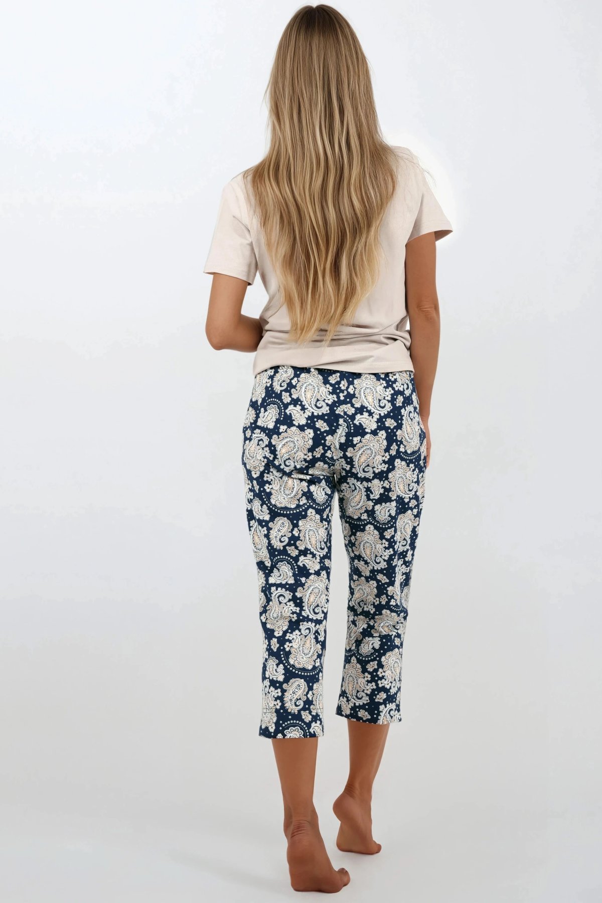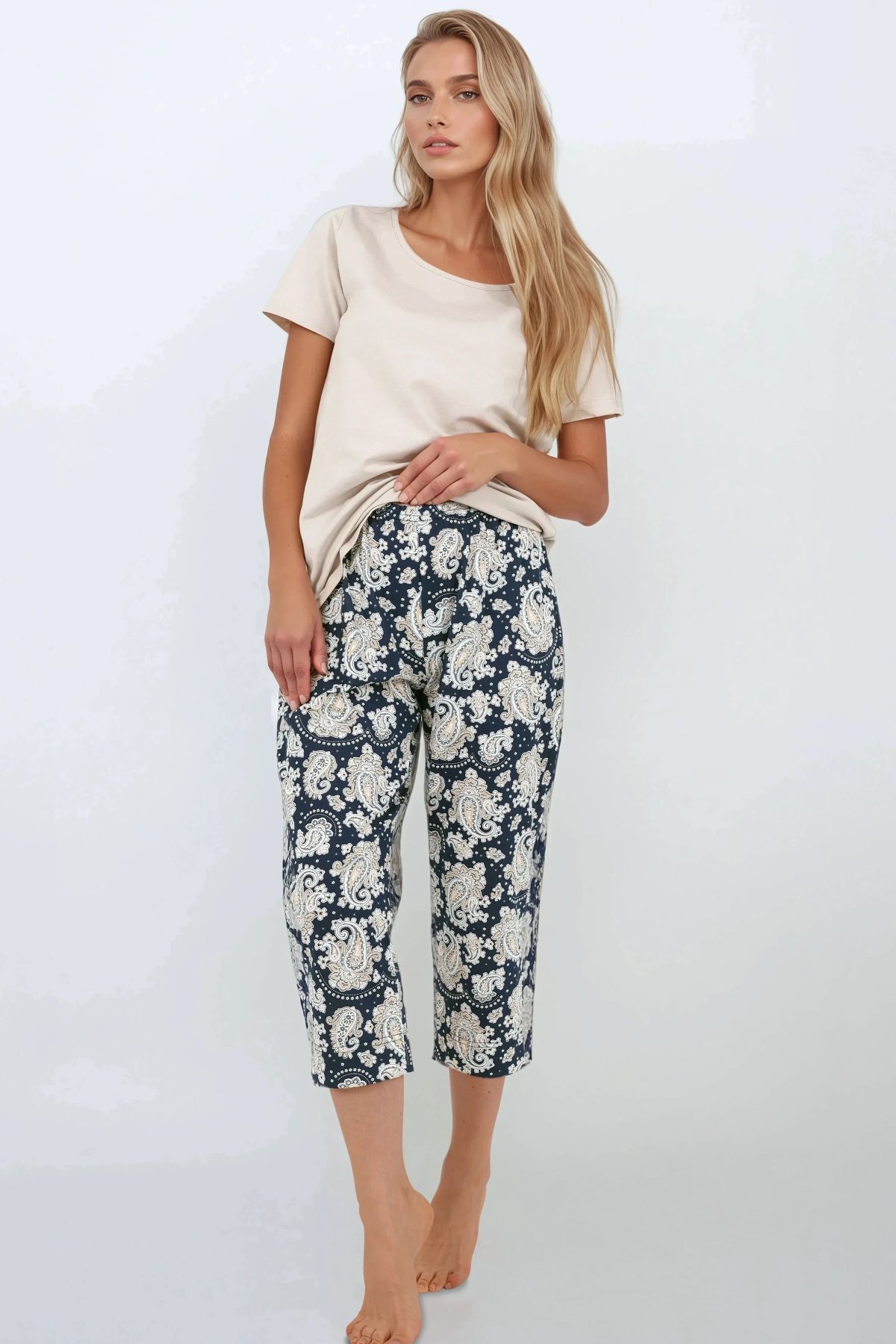 Toto dvoudílné dámské pyžamo přináší ideální rovnováhu mezi pohodlím a elegancí. Lehký vrchní díl s krátkými rukávy a kulatým výstřihem je ušitý z měkké bavlny s příměsí elastanu, která se dokonale přizpůsobí postavě a zaručuje volnost pohybu. Spodní díl tvoří tříčtvrteční kalhoty s módním paisley vzorem, rovnými nohavicemi a elastickým pasem pro maximální komfort. Materiál je prodyšný, hypoalergenní a šetrný k pokožce, takže zaručuje příjemný pocit během celé noci. Díky svému univerzálnímu stylu se pyžamo skvěle hodí i jako pohodlný homewear pro domácí relax.