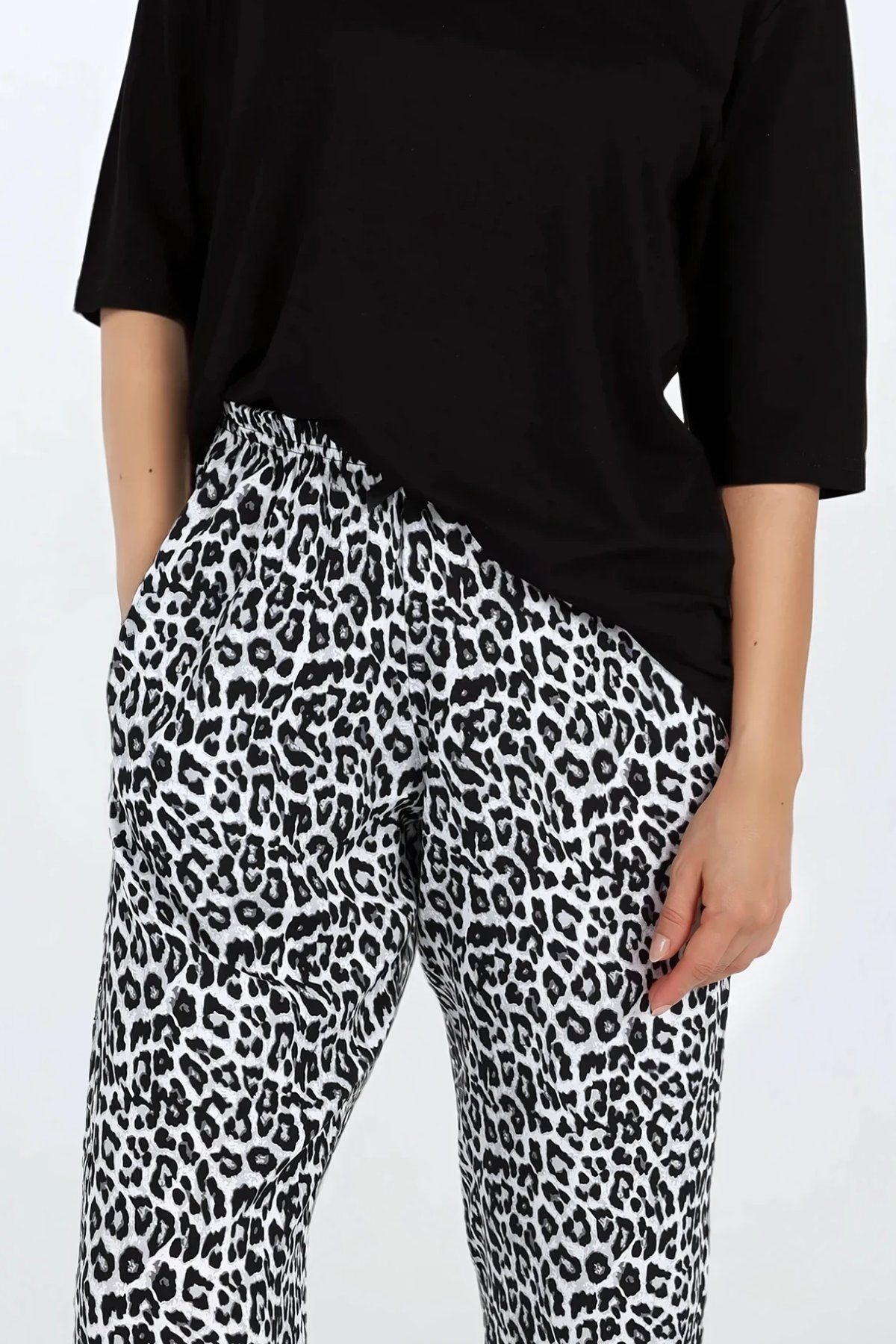 Tento stylový dvoudílný komplet kombinuje pohodlí s moderní elegancí. Volnější černý top s tříčtvrtečními rukávy a decentním kulatým výstřihem působí ležérně, ale zároveň žensky. Kalhoty s originálním leopardím potiskem mají volný střih, kapsy po stranách a pružný pas, který zajišťuje maximální komfort při nošení. Měkká viskózová tkanina příjemně chladí, je prodyšná a šetrná k pokožce. Tento komplet se skvěle hodí nejen jako pyžamo, ale také jako stylový homewear pro chvíle pohody doma — ideální pro ženy, které chtějí vypadat dobře i v relaxačních chvílích.