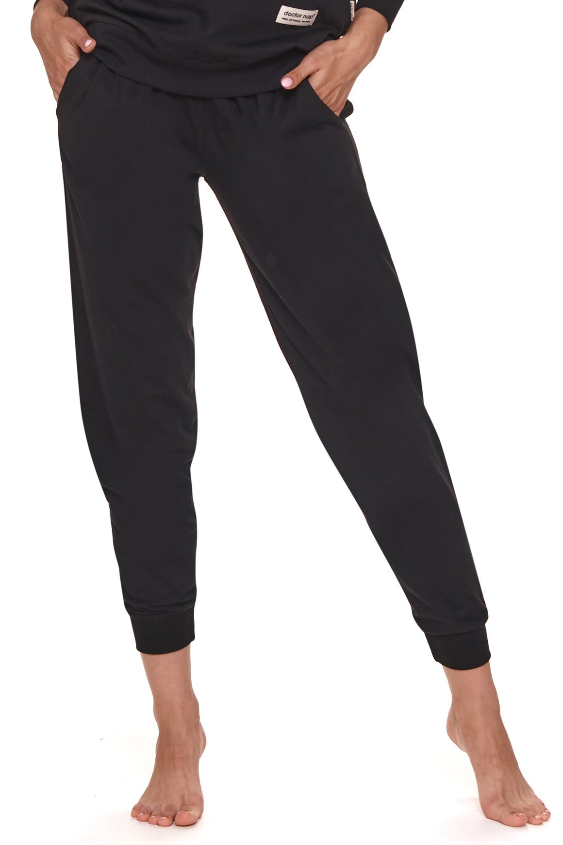 Kalhoty mají dlouhé nohavice, dvě postranní kapsy a v pase je všita guma stejně jako na konci nohavic.