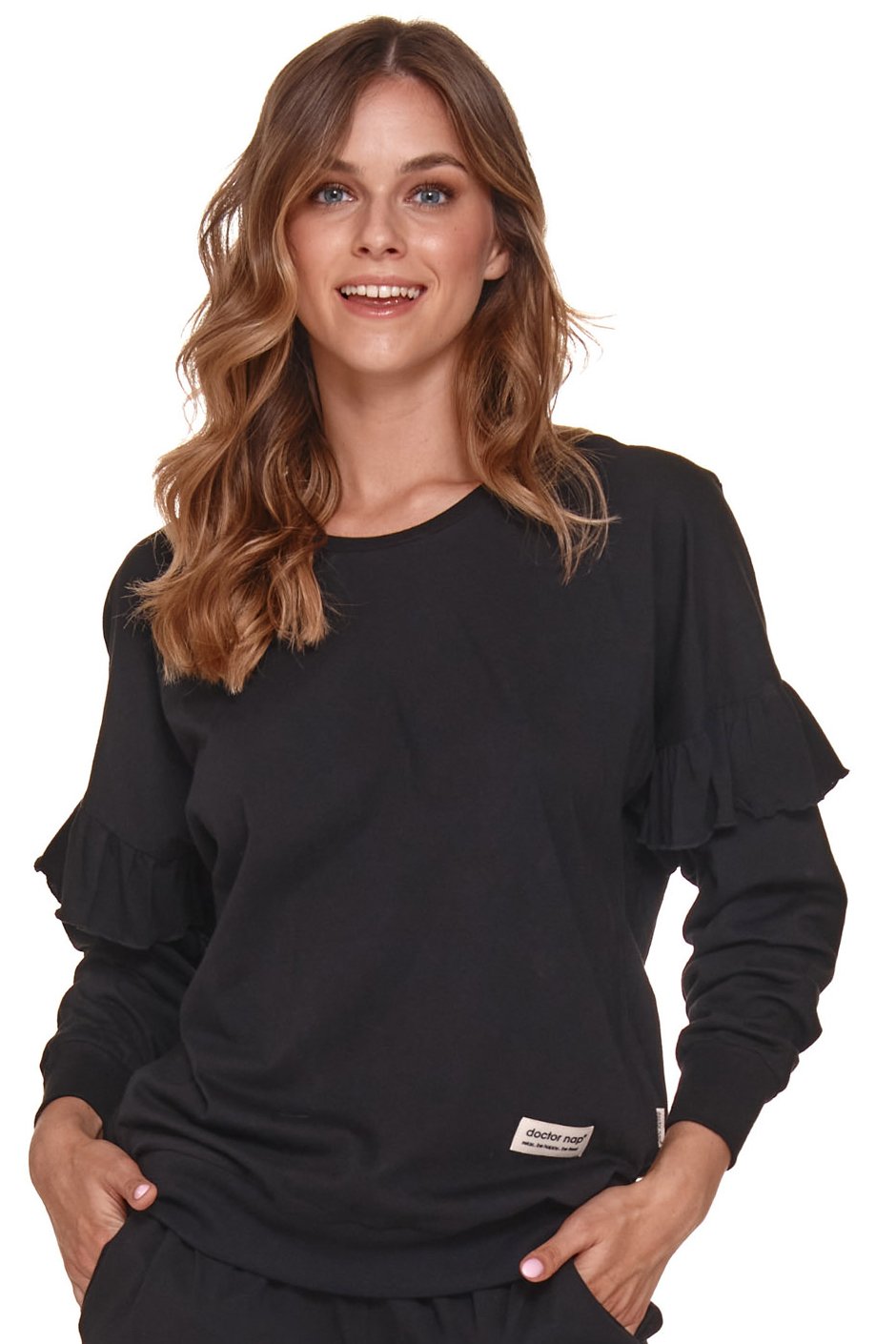 Tričko má dlouhý rukáv, kulatý výstřih a v oblasti paží se nachází volánky, které tímto detailem nádherně dominuje celému výrobku.