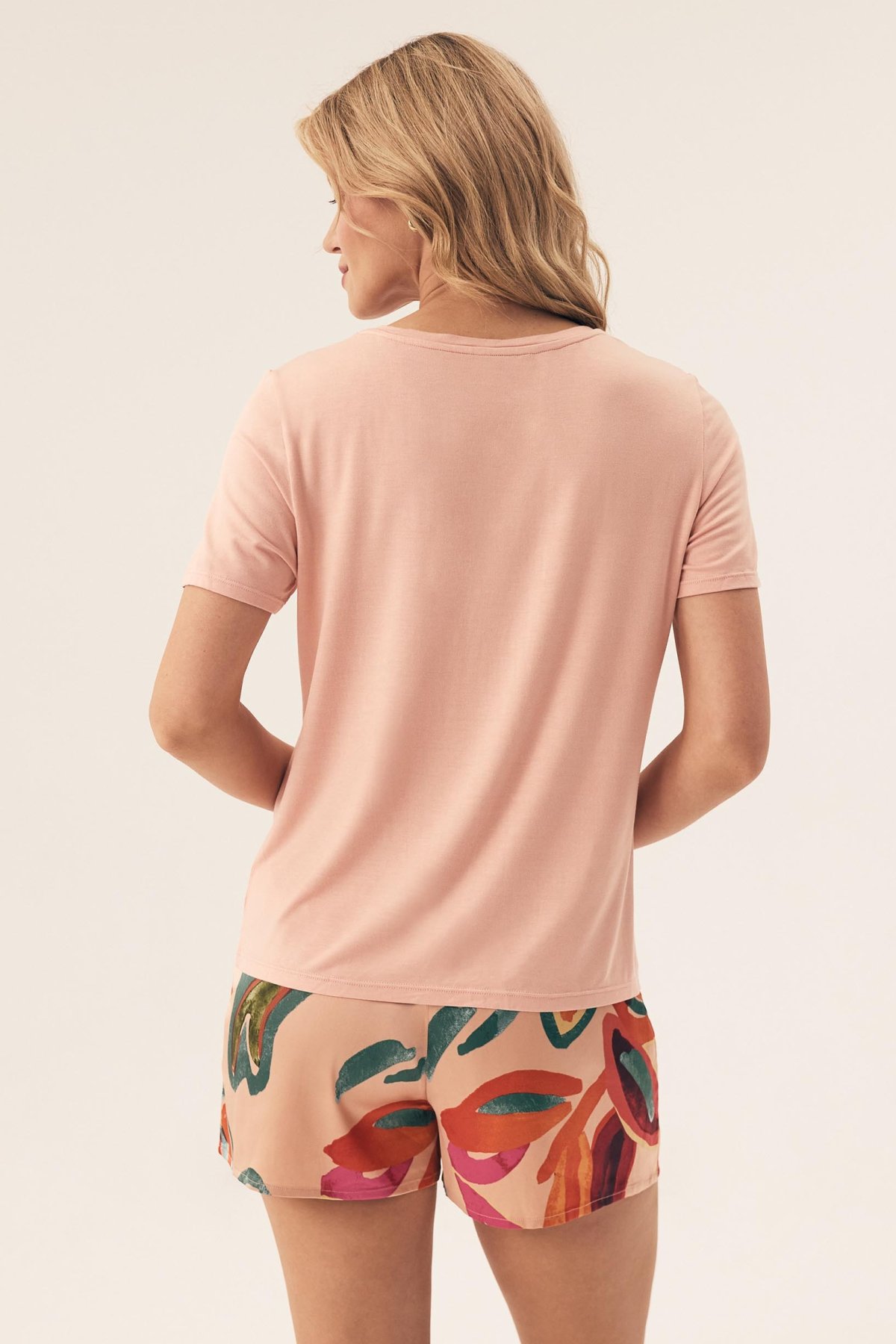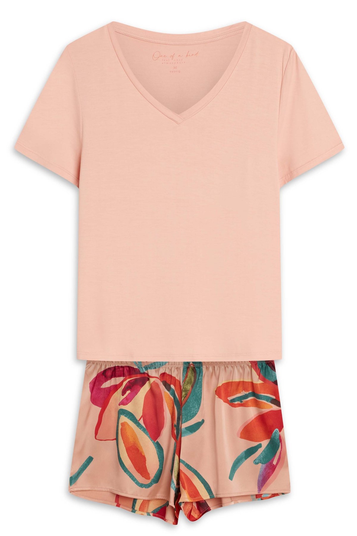 Dámské pyžamo Rascal spojuje pohodlný střih s nápaditým designem. Horní díl tvoří hladké tričko s krátkým rukávem, volnějším střihem a ženským výstřihem do V, který působí jemně a lichotivě. Spodní díl doplňují lesklé šortky s originálním potiskem, které celému kompletu dodávají výrazný a moderní vzhled. Kontrast mezi jednobarevným topem a vzorovanými šortkami vytváří atraktivní celek, který zaujme na první pohled. Elastický pas se dobře přizpůsobí postavě a přispívá k pohodlí při večerním odpočinku i během spánku. Díky podílu viskózy je top příjemný na dotek, zatímco lehký materiál šortek podtrhuje jejich splývavost a jemný lesk.