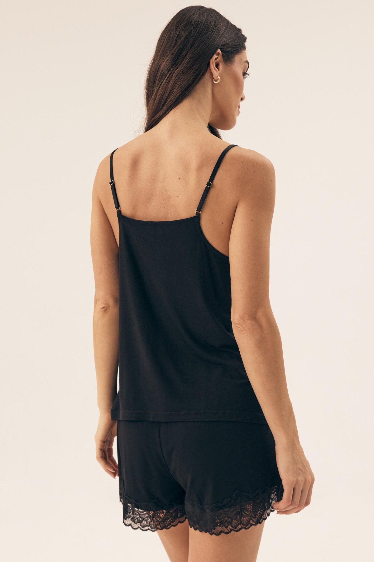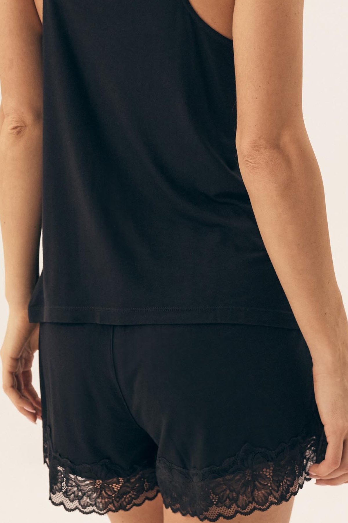 Top na tenkých nastavitelných ramínkách s krajkovým výstřihem do V decentně zvýrazní dekolt a dodá celku elegantní nádech. Volnější šortky jsou zakončené také krajkou, která plynule navazuje na materiál a vytváří jemný, harmonický vzhled. Elastický pas se příjemně přizpůsobí postavě bez nepříjemného tlaku. Viskóza je na dotek hebká a zajišťuje pohodlí i prodyšnost.