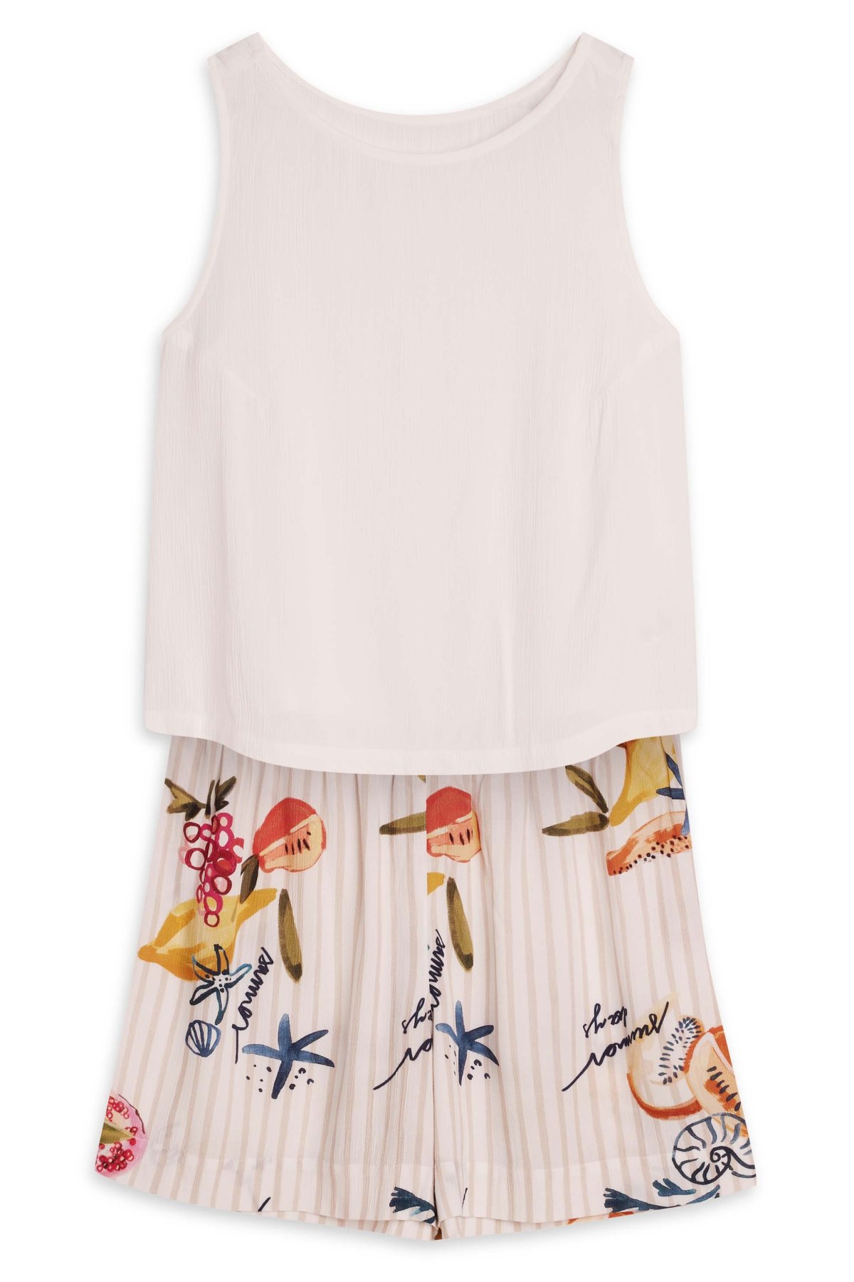 Top je ušitý z měkké žebrované tkaniny s matným vzhledem. Má volnější střih a jemně zaoblený výstřih, takže působí uvolněně a příjemně se nosí. Šortky z lehké plisované tkaniny zdobí ovocno-rostlinný motiv na krémovém podkladu. Svislé proužky dodávají modelu lehkost a nenápadný rytmus. Komplet se hodí jako pyžamo i jako domácí outfit na horké dny.