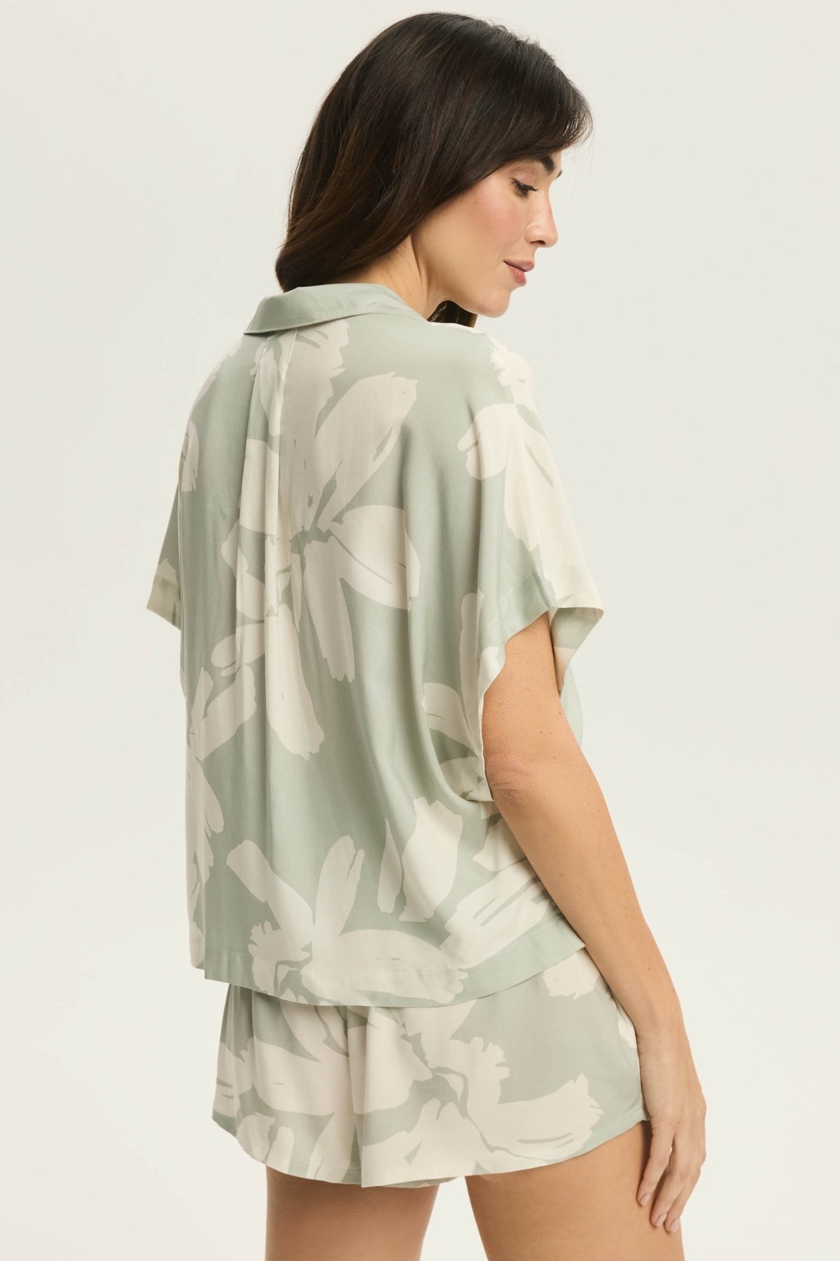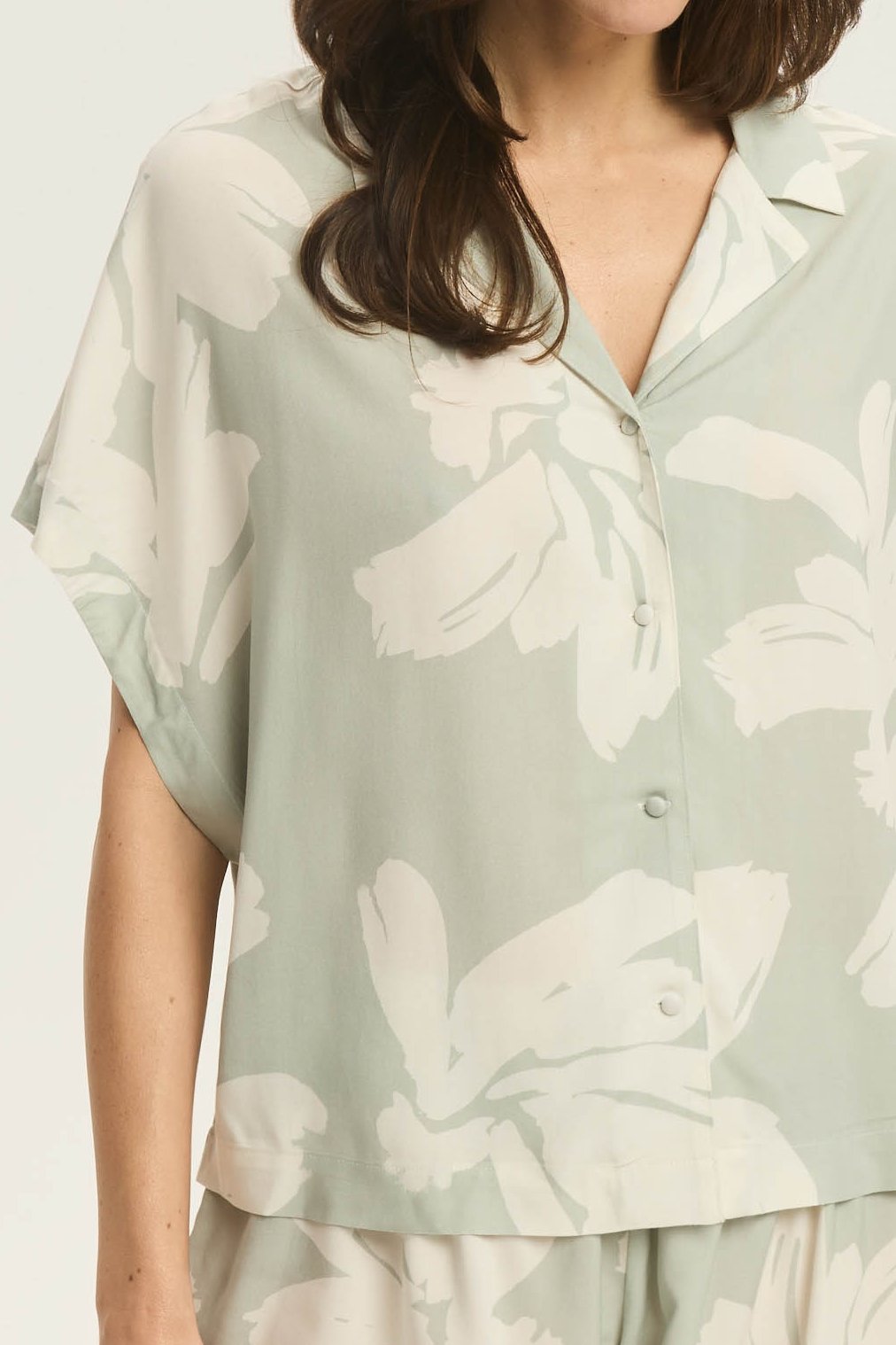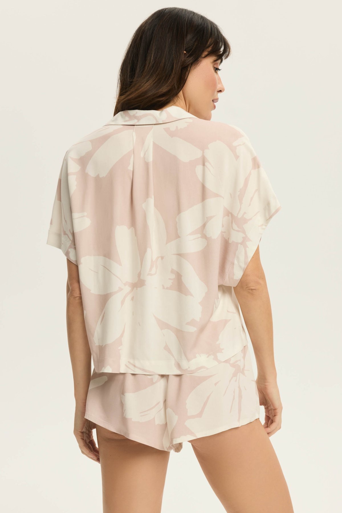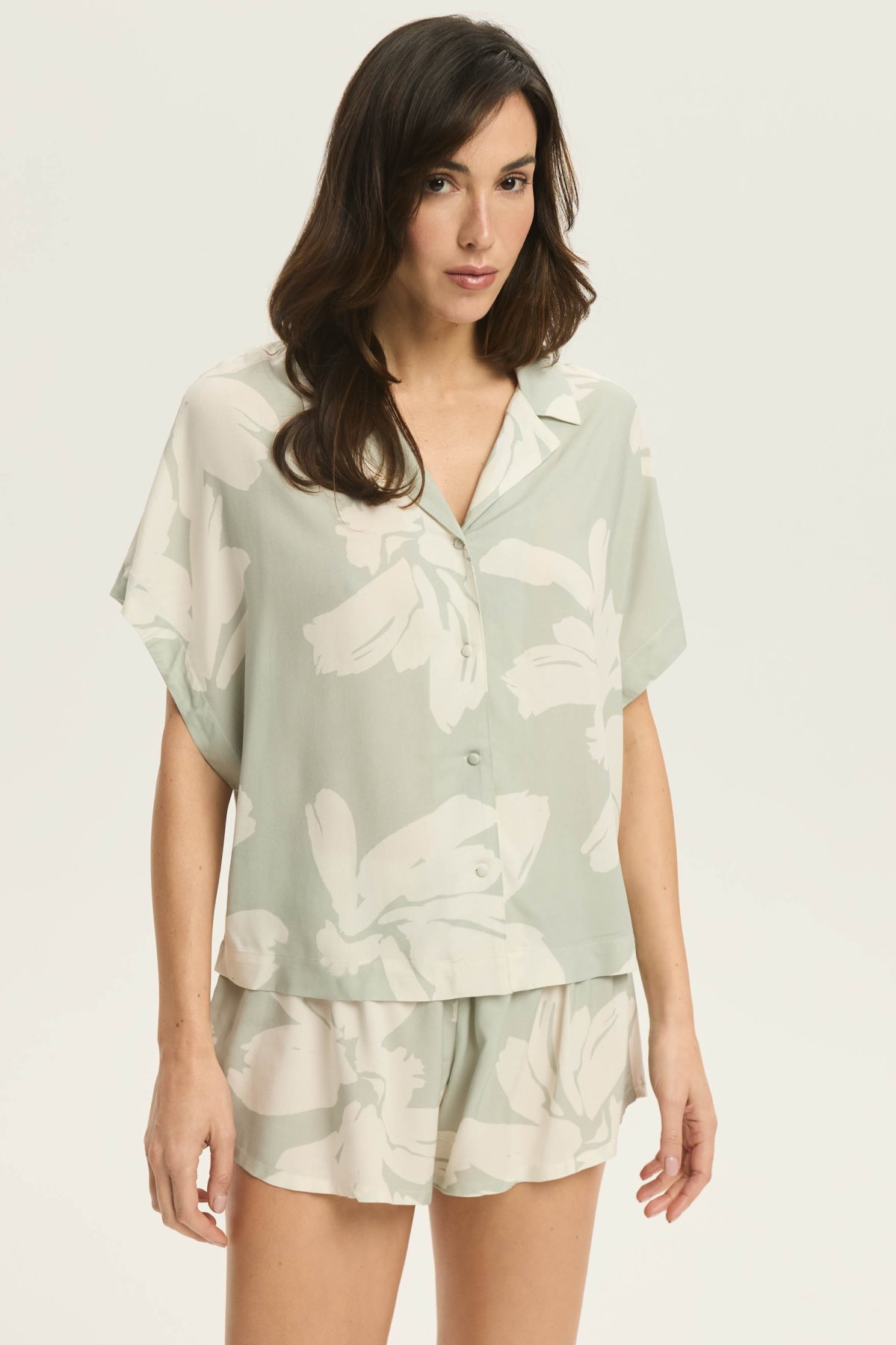Volná košile s krátkým rukávem a klasickým límečkem působí elegantně i uvolněně zároveň, zatímco šortky s elastickým pasem poskytují volnost pohybu a komfort při spánku i ranní relaxaci. Subtilní potisk ve stylu malířských tahů dodává celé soupravě umělecký nádech a ženskou delikátnost. Pyžamo Roya je dokonalým spojením stylu, lehkosti a pohodlí.