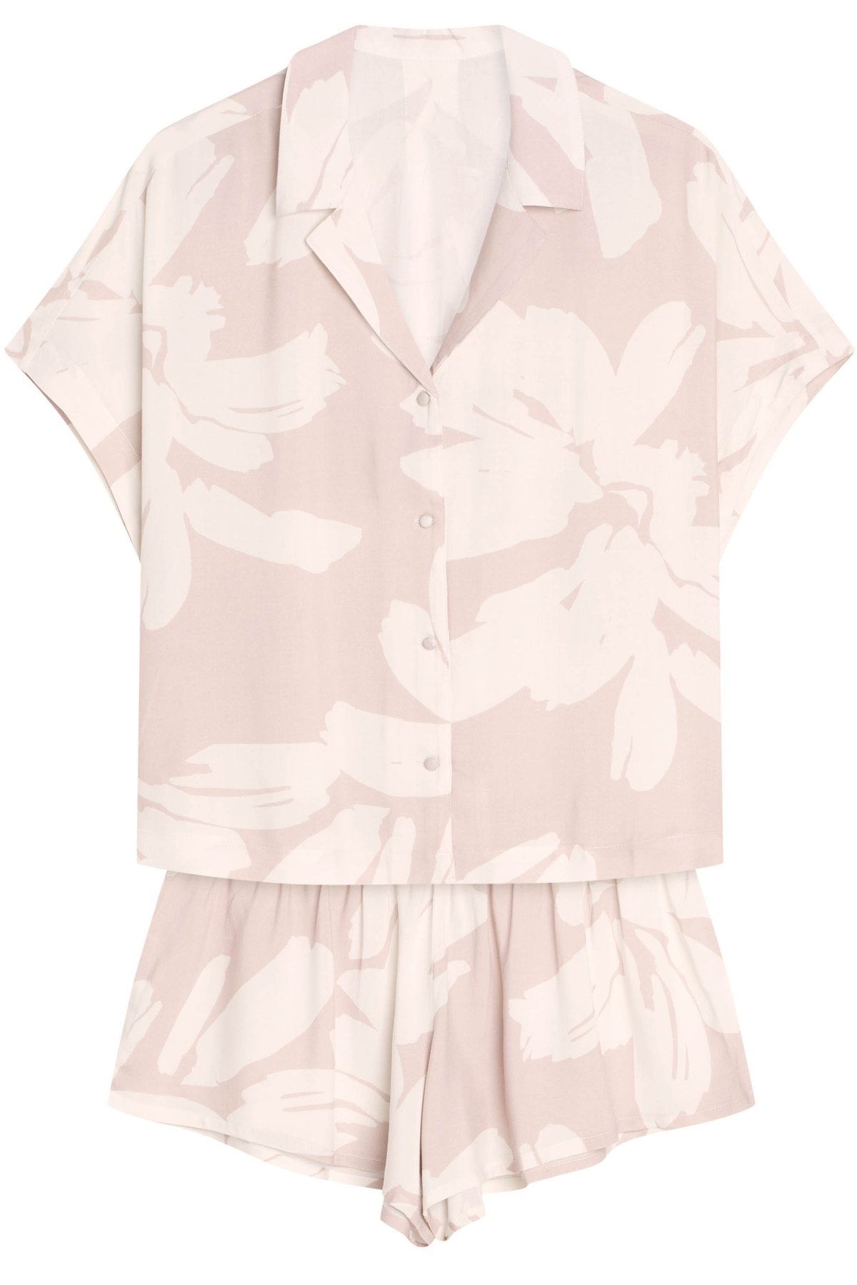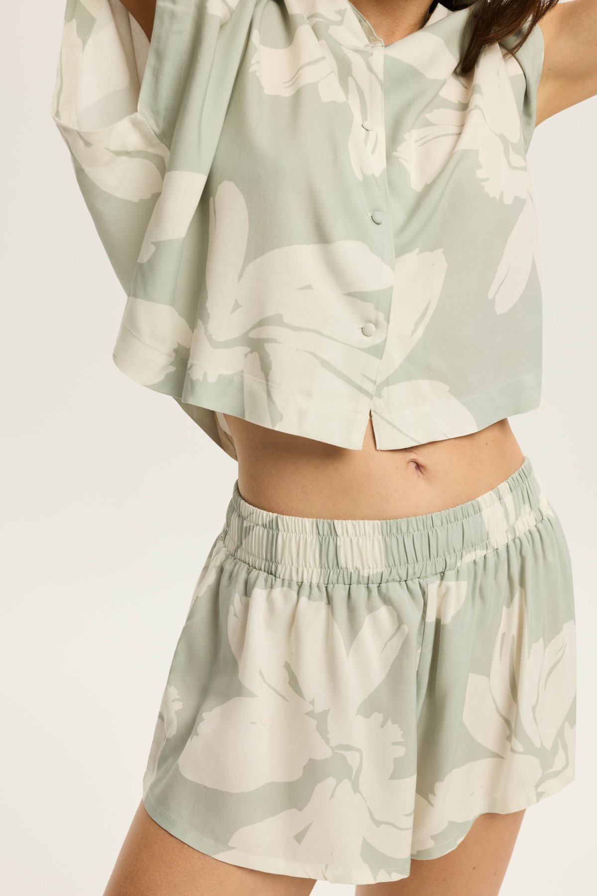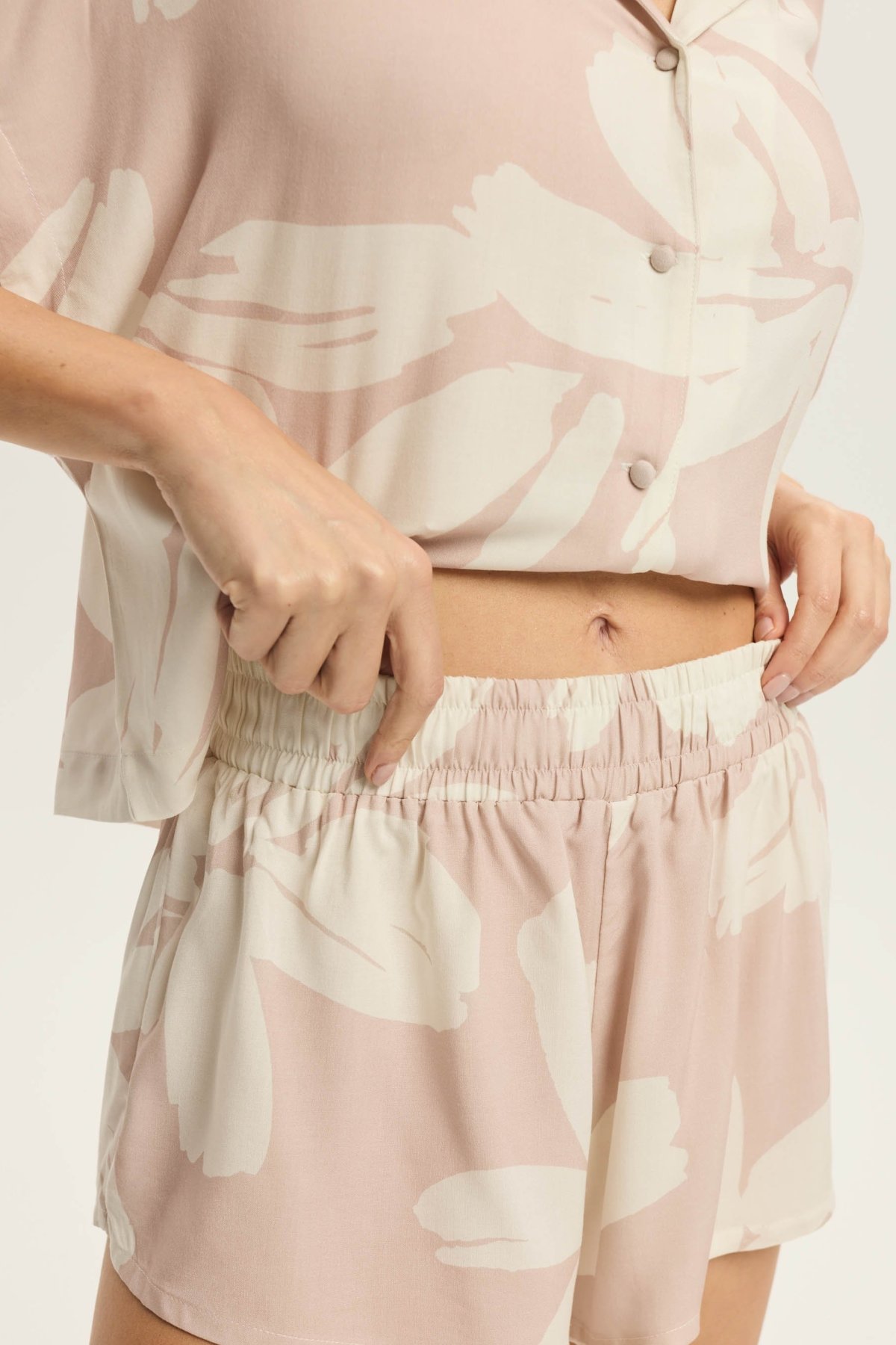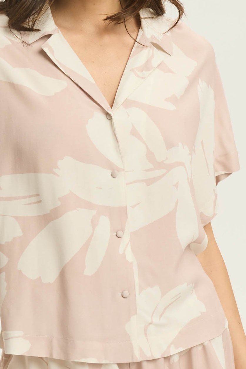 Volná košile s krátkým rukávem a klasickým límečkem působí elegantně i uvolněně zároveň, zatímco šortky s elastickým pasem poskytují volnost pohybu a komfort při spánku i ranní relaxaci. Subtilní potisk ve stylu malířských tahů dodává celé soupravě umělecký nádech a ženskou delikátnost. Pyžamo Roya je dokonalým spojením stylu, lehkosti a pohodlí.