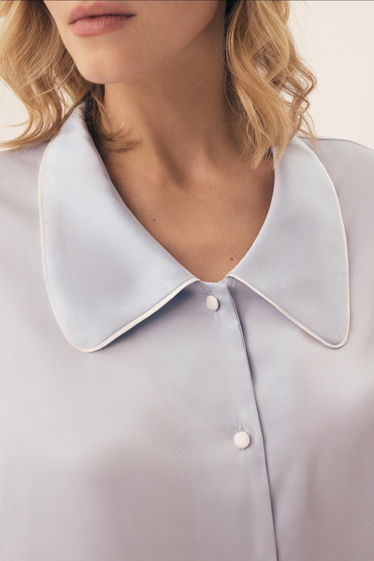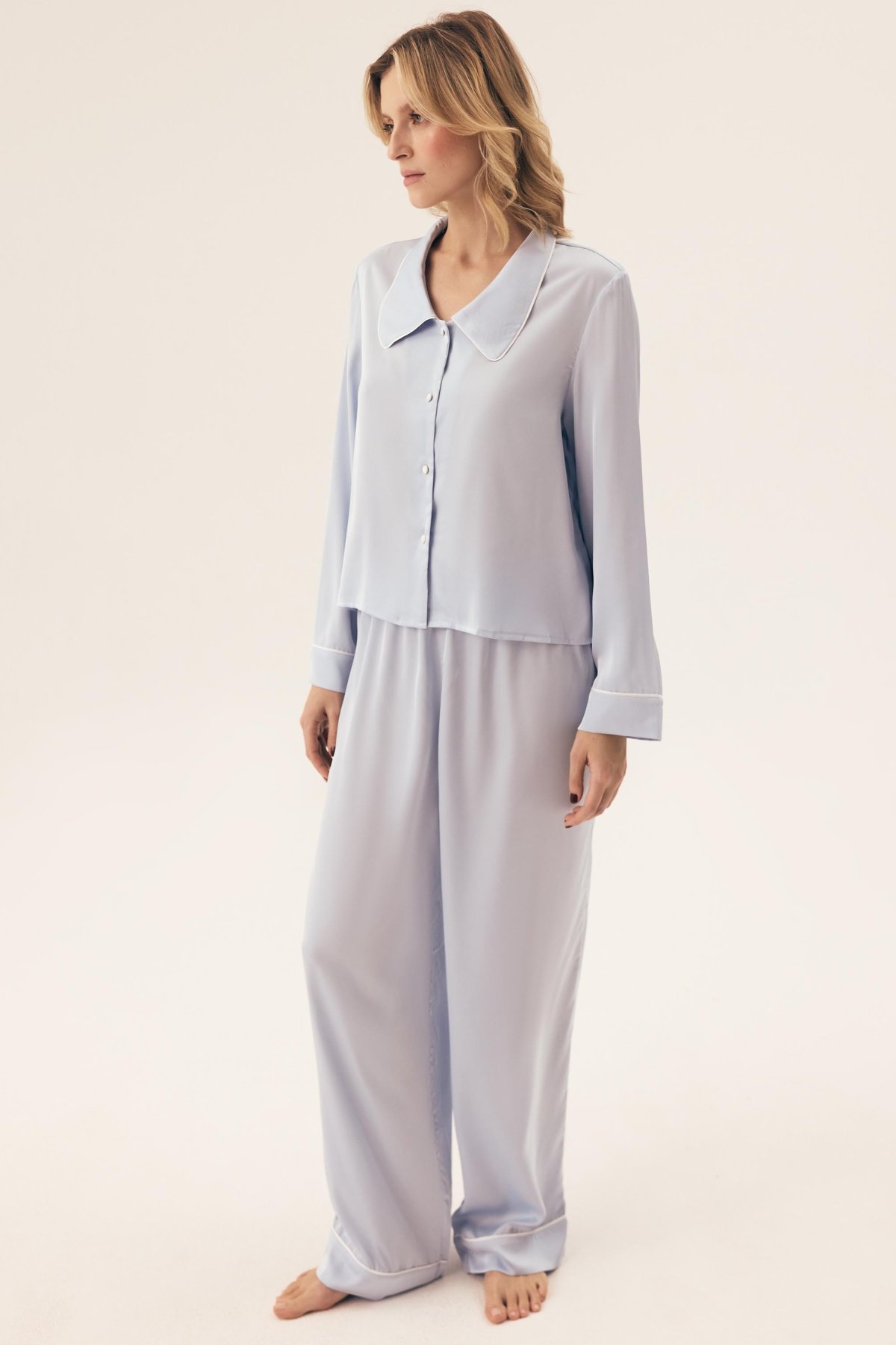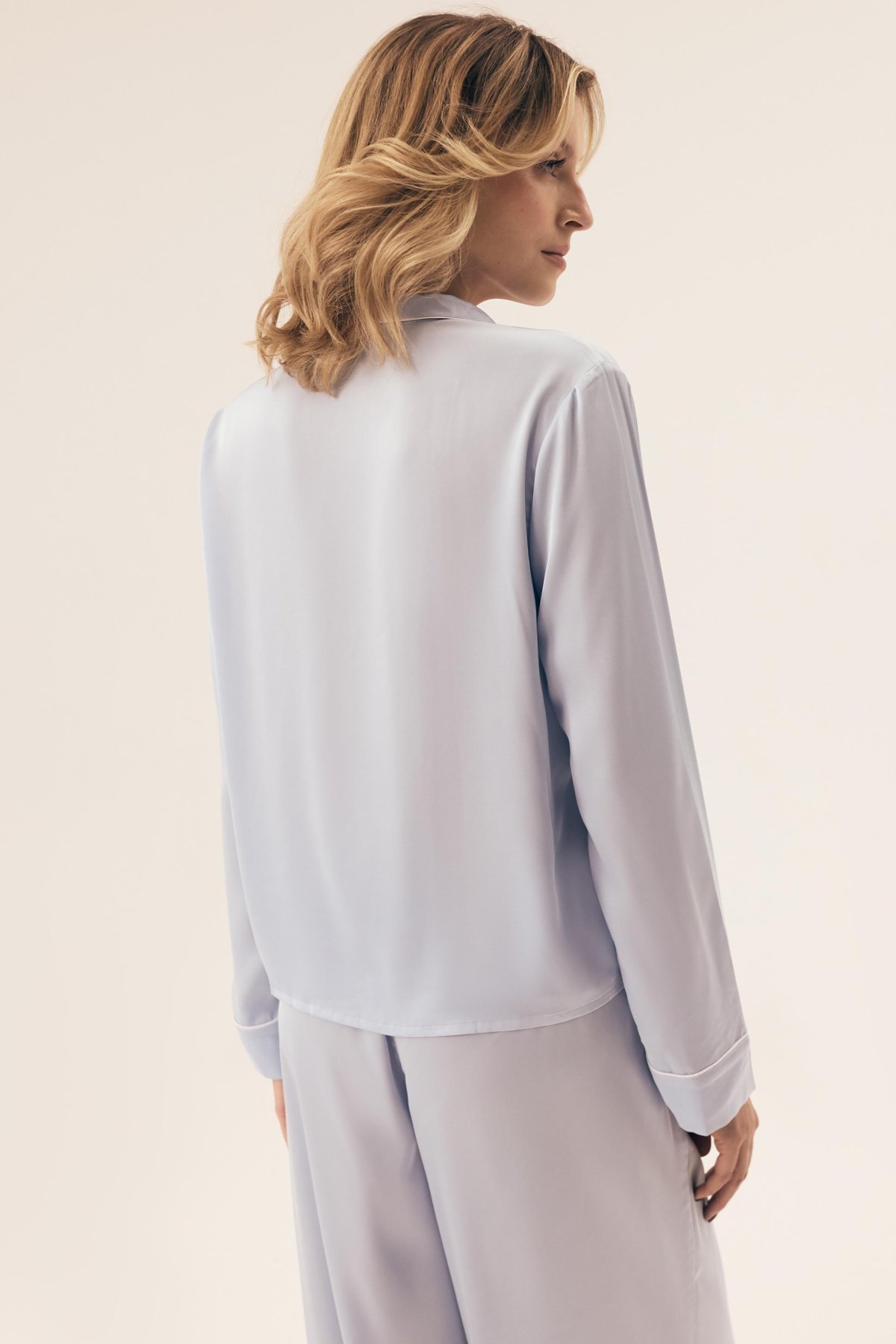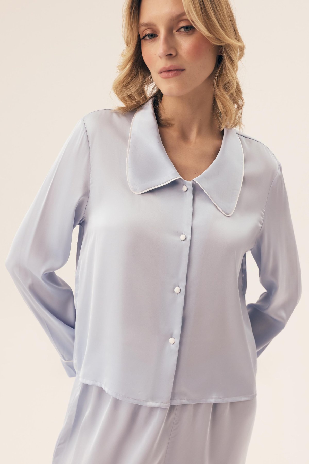 Pyžamo Ryann je poctou klasické eleganci v jemném, pohodlném provedení. Košile se zapíná na drobné lesklé knoflíčky a zaujme výrazně zaobleným límcem s kontrastní paspulkou, která jí dodává osobitý a půvabný vzhled. Lehce rozšířený spodní lem a volnější rukávy vytvářejí vzdušnou, lehkou siluetu. Kalhoty s rovnými širokými nohavicemi měkce splývají po postavě a elastický pas zajišťuje pohodlí bez nepříjemného tlaku. Celý komplet je ušitý z hladké, splývavé látky příjemné na dotek, která spojuje komfort s upraveným vzhledem.
