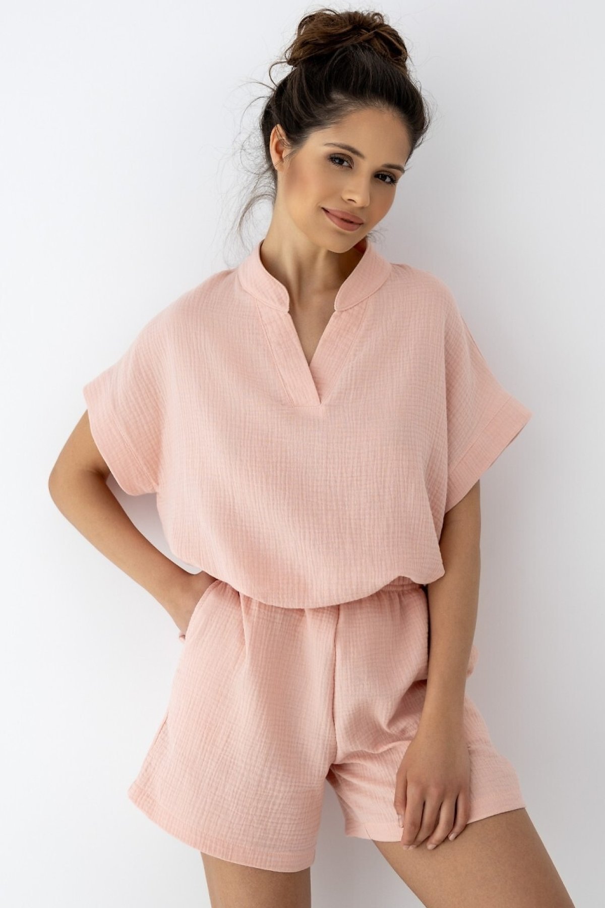 Dámské pyžamo Sensis Sabrina je lehký letní komplet z příjemné mušelínové bavlny. Volnější střih horního dílu s krátkým rukávem a výstřihem do V působí vzdušně a pohodlně při nošení doma i během spánku. Kraťasy s kapsami doplňují celý komplet o praktický detail. Lososový odstín dodává modelu jemný a svěží vzhled. Ideální volba pro teplejší noci, kdy oceníš prodyšný materiál a pohodlný střih.