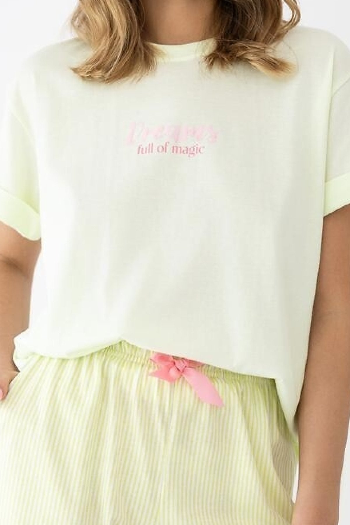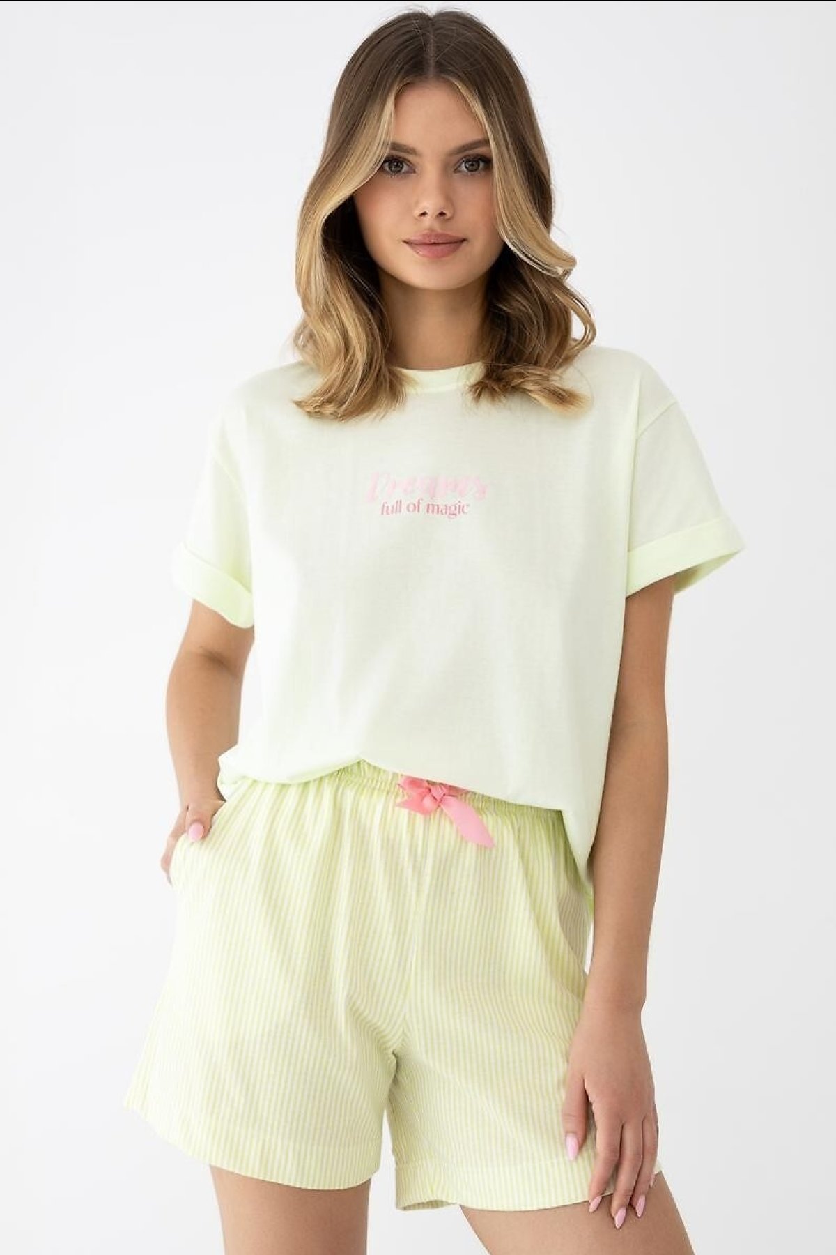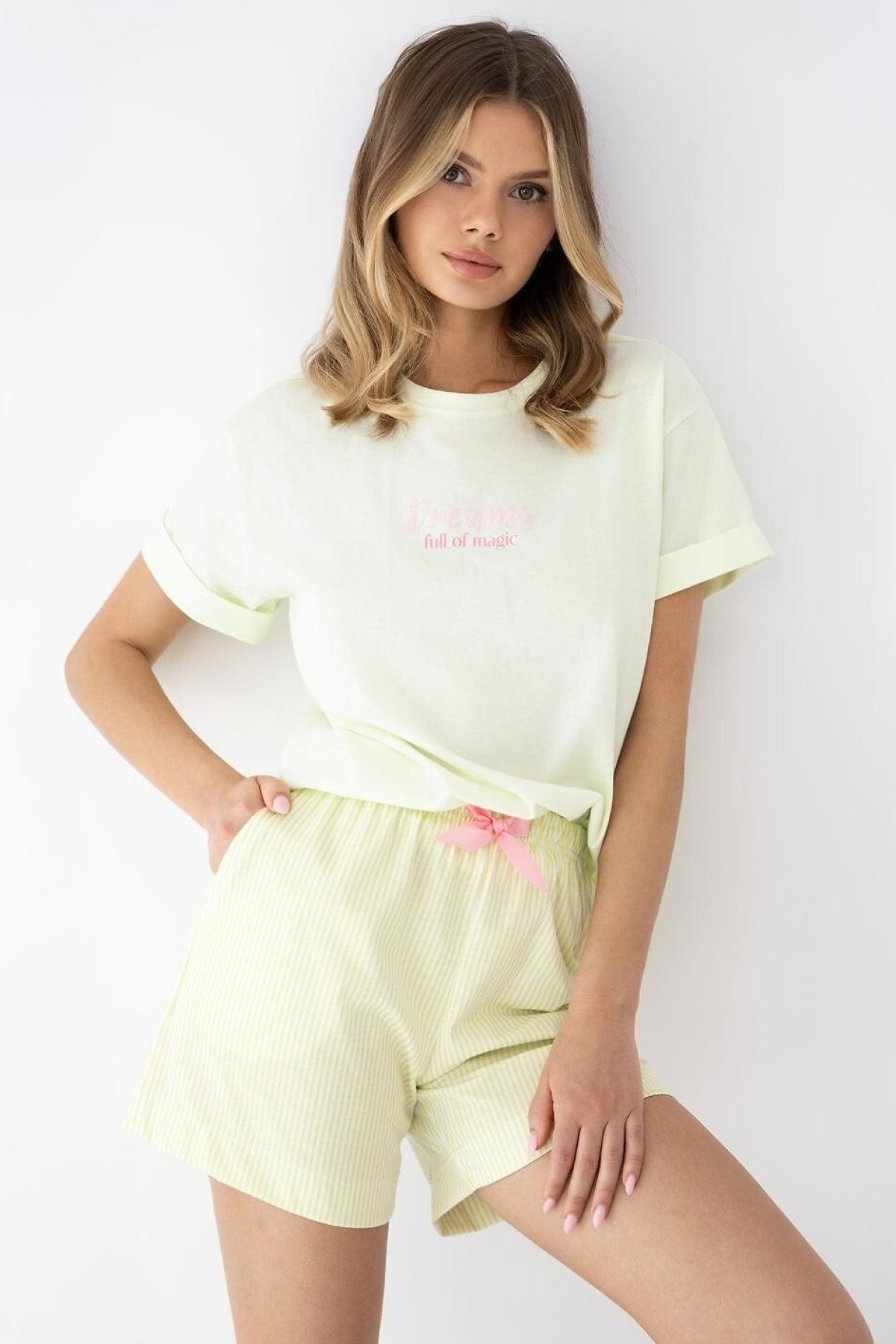 Volnější střih kompletu nechává dostatek pohodlí při spánku i domácím odpočinku. Šortky zdobí mašle v pase, která jemně oživuje celkový vzhled a přidává modelu nenápadný detail. Díky 100% bavlně je materiál příjemný na dotek a vhodný na teplejší období.