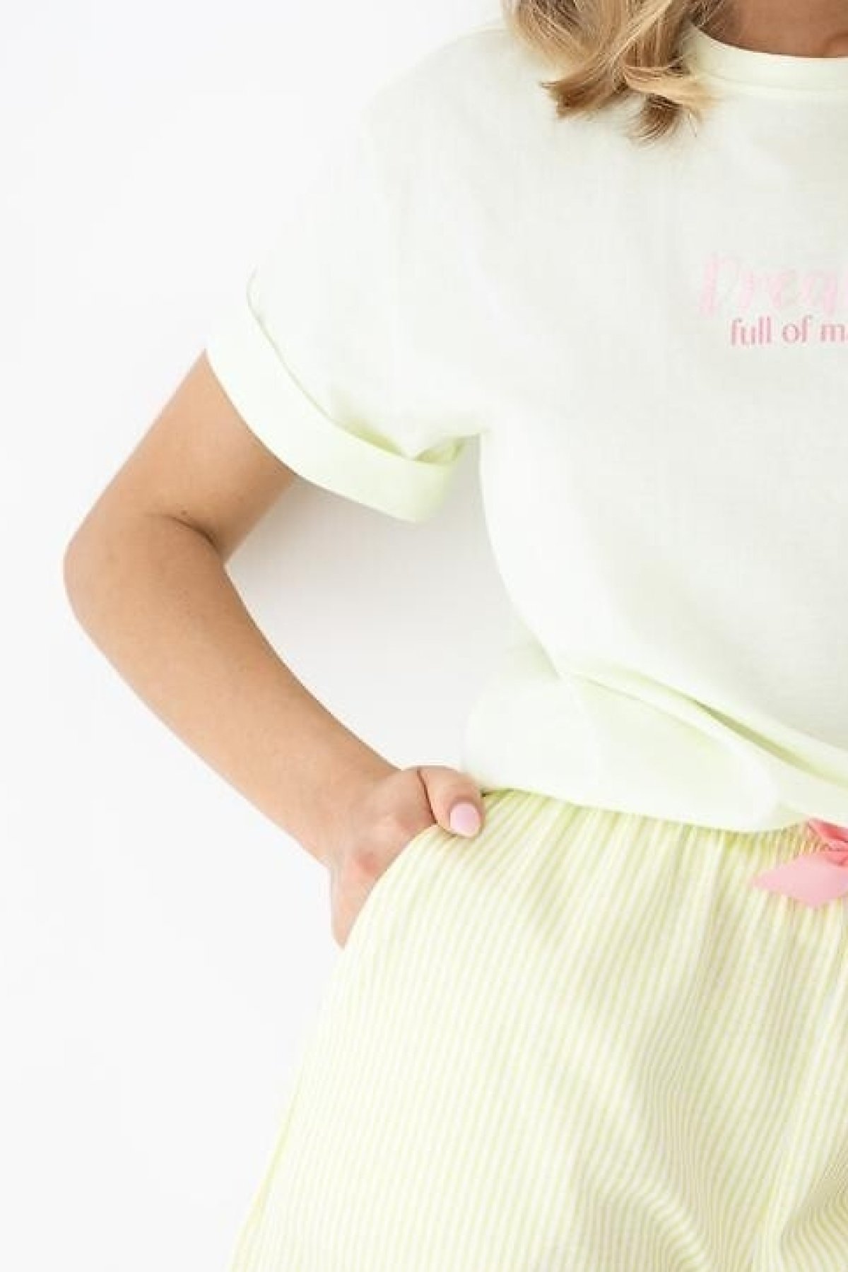 Dámské pyžamo působí lehce, svěže a pohodlně pro každodenní nošení. Tričko s krátkým rukávem a půlkulatým výstřihem má jednoduchý, čistý vzhled, který dobře doplňují krátké šortky s jemným proužkem.