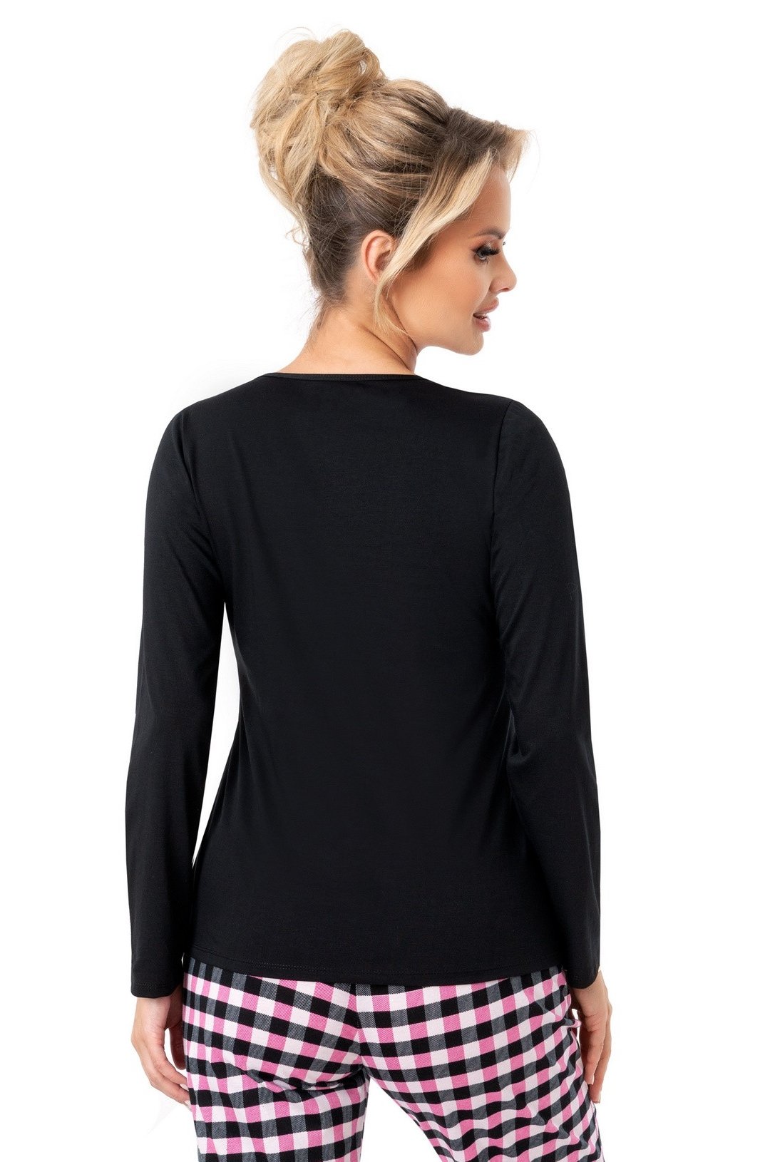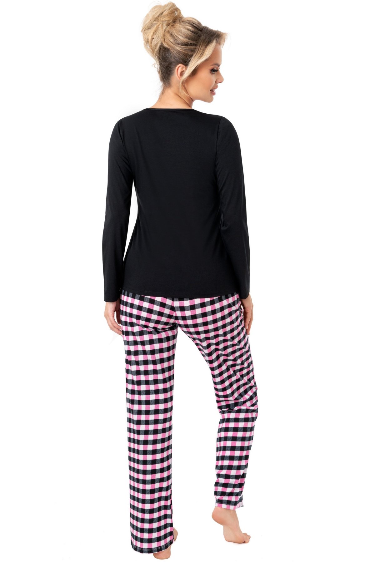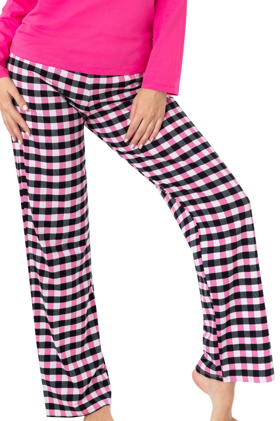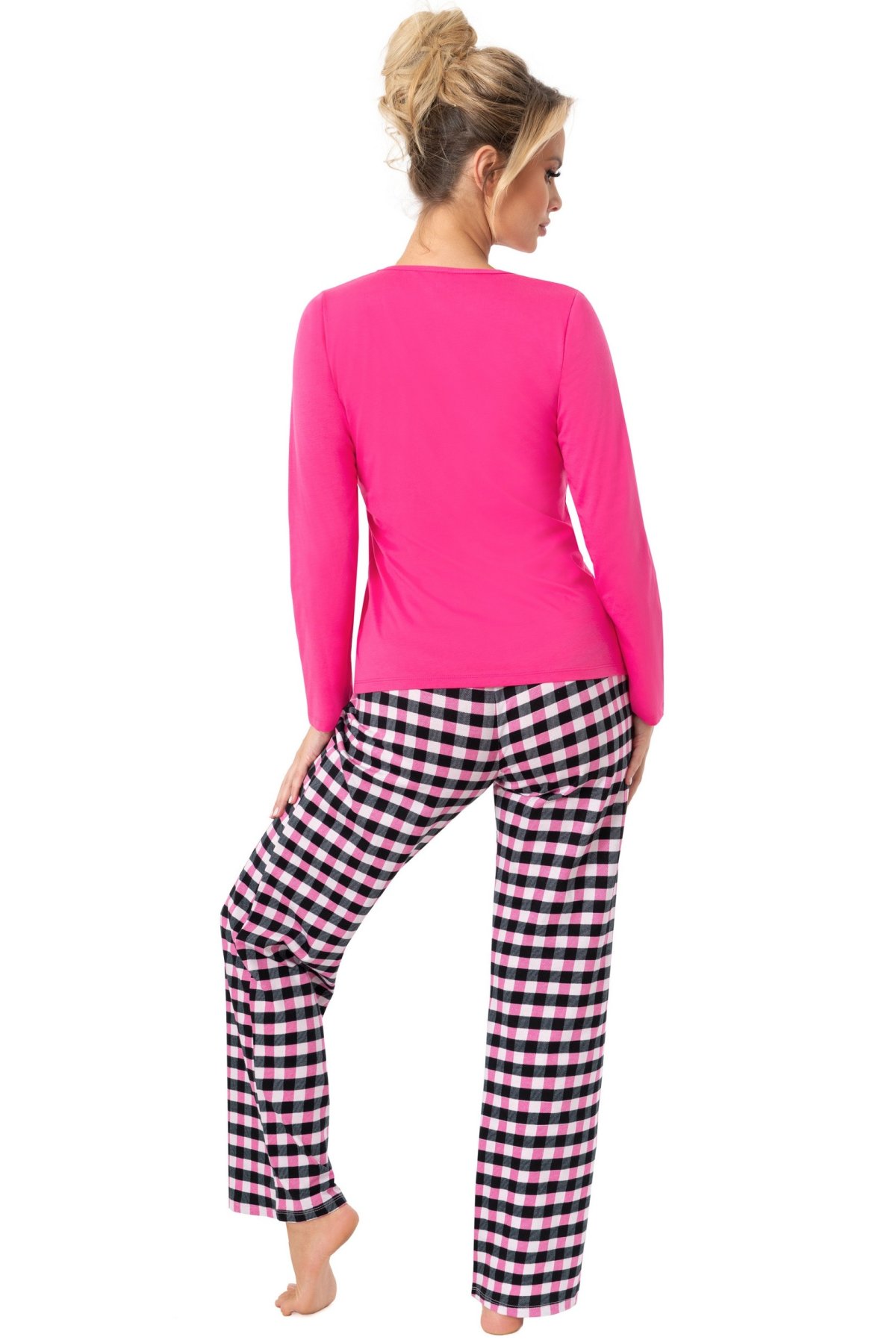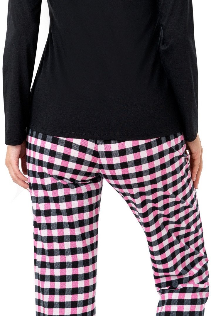 Horní díl je s dlouhým rukávem a kulatým výstřihem, decentní potisk u dekoltu dodává stylový akcent. Dlouhé kostkované kalhoty v klasickém střihu perfektně ladí s jednobarevným trikem a zajišťují komfort i volnost pohybu. Díky bavlněnému materiálu je pyžamo příjemné k pokožce a prodyšné, takže poskytuje pohodlí nejen při spánku, ale i při večerním relaxu doma. Skvělá volba do chladnějších dnů.