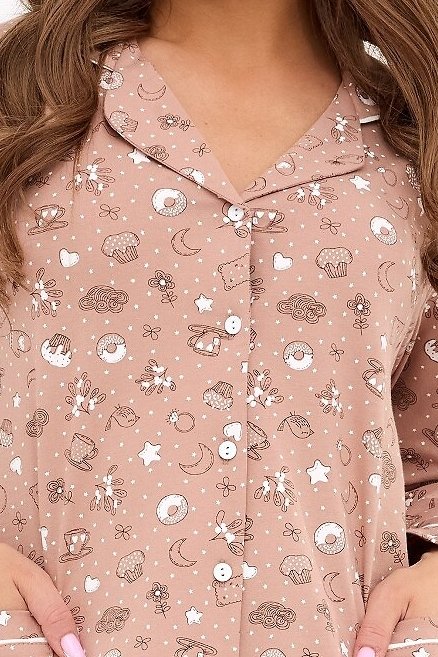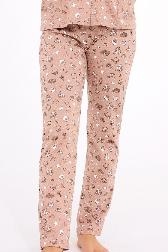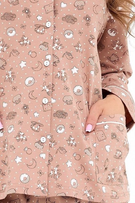 Dámské pyžamo Smile 4 vyniká kombinací pohodlí, kvality a roztomilého designu. Vyrobené z bavlny, nabízí mimořádnou měkkost, prodyšnost a komfort během spánku i domácího odpočinku. Horní díl s dlouhým rukávem, límečkem a zapínáním na knoflíky působí elegantně, zatímco hravý potisk s motivem sušenek dodává pyžamu veselý charakter. Praktické kapsy vám nabízejí prostor na drobnosti nebo zahřátí rukou. Dlouhé kalhoty s elastickým pasem se přizpůsobí postavě a neomezují v pohybu. Ideální volba pro ženy, které chtějí spojit ženský styl, kvalitu a hravý detail v jednom útulném kompletu.