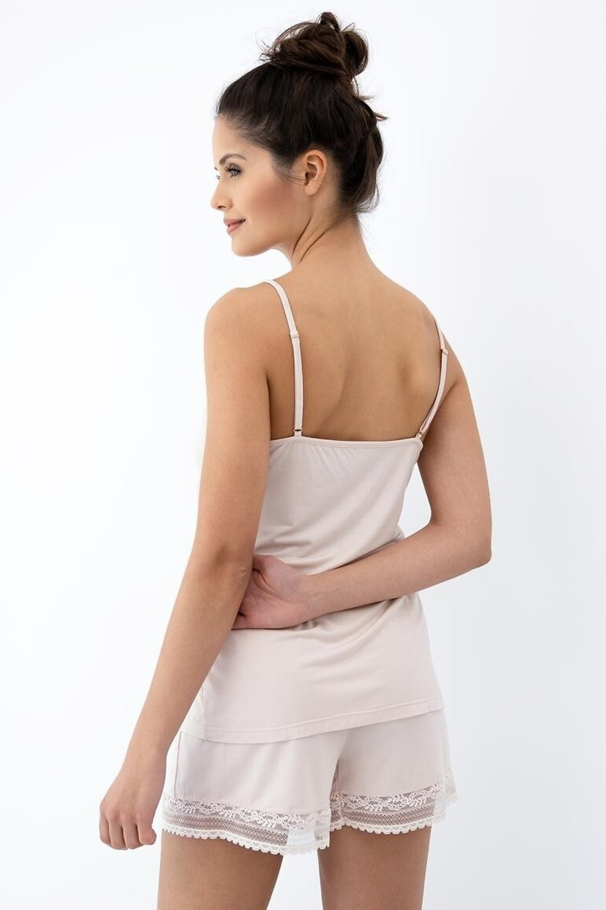 Pyžamo Stella je jemný, ženský komplet, který propojuje pohodlí s lehce elegantním vzhledem. Top na tenkých ramínkách zdobí krajka ve výstřihu, která model zjemňuje a dodává mu vzdušný detail.