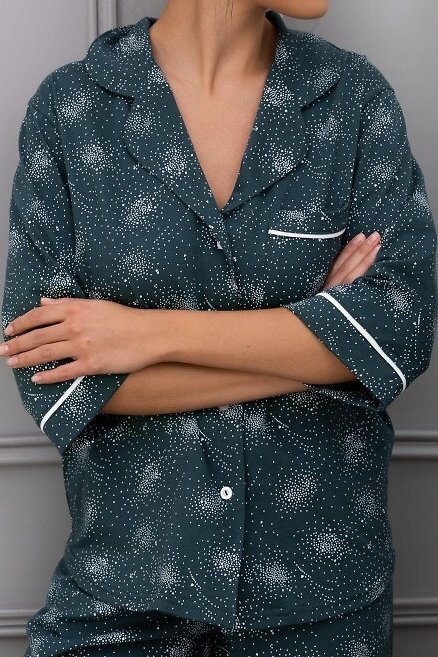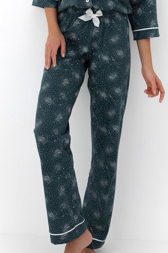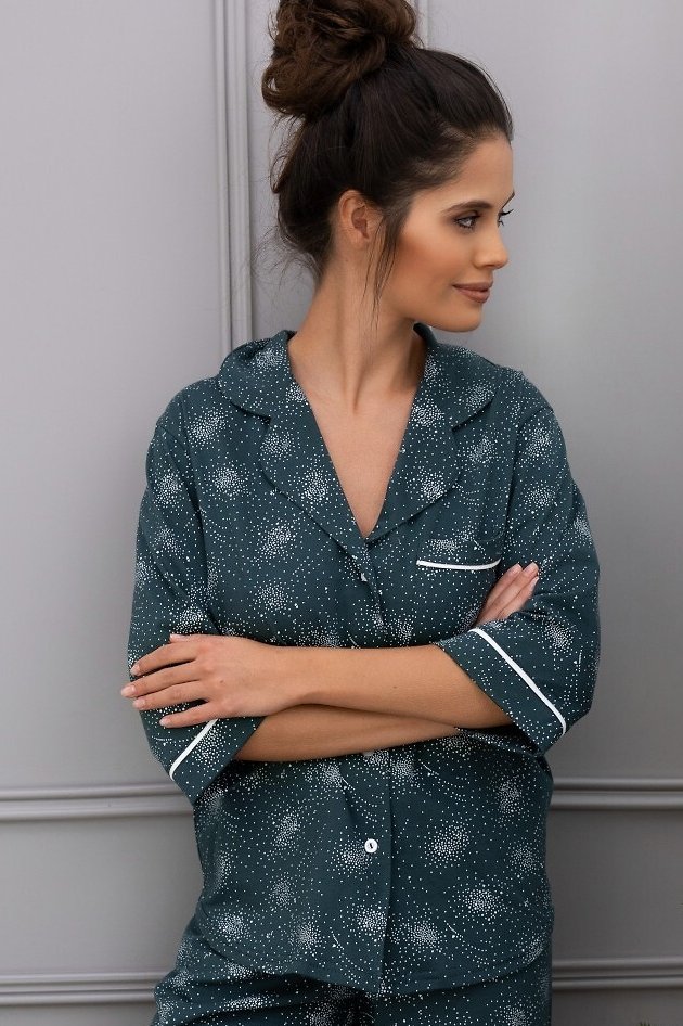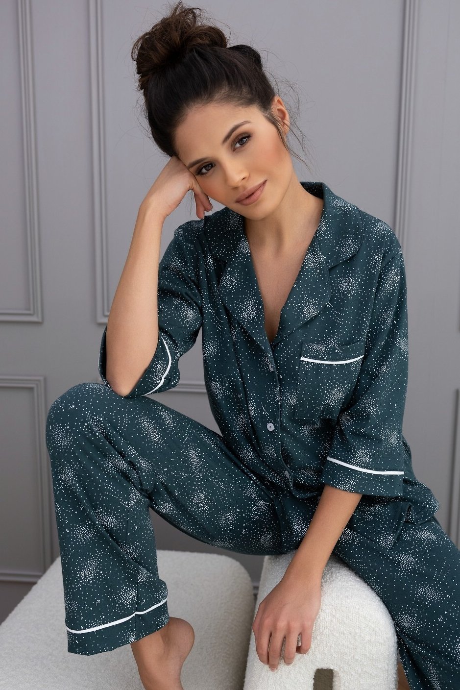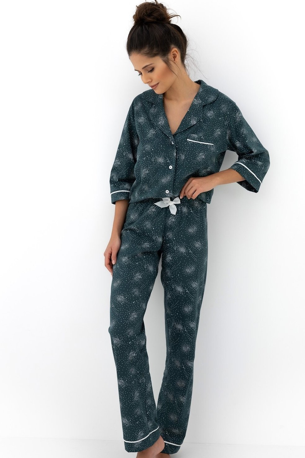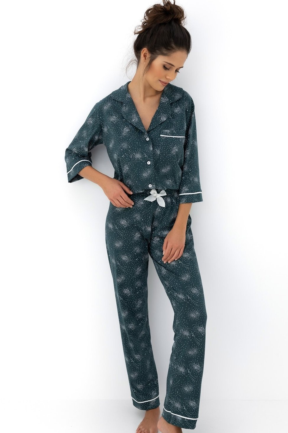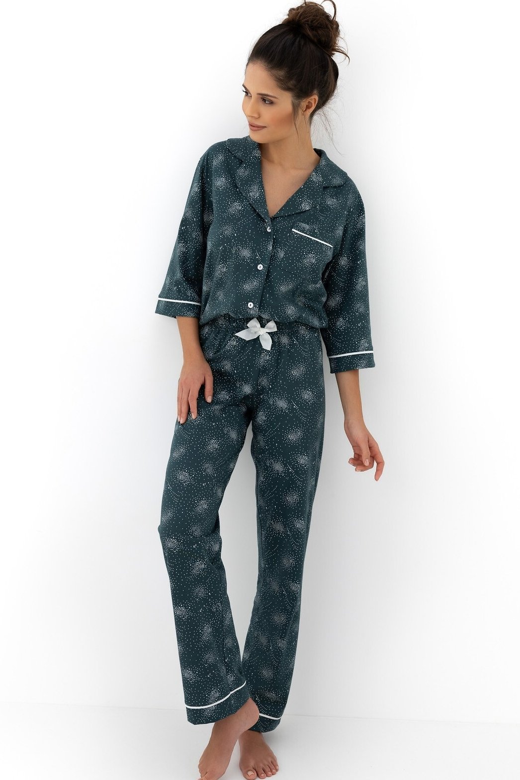 Horní díl s límečkem a 3/4 rukávy působí jemně a upraveně, zatímco dlouhé kalhoty poskytují volnost pohybu i pohodlí během spánku. Elastický pas ozdobený saténovou mašličkou podtrhuje ženský charakter modelu. Ideální dvoudílné pyžamo pro ženy, které hledají klasiku s nádechem jemné elegance.