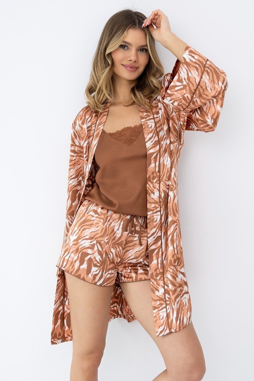 Tenhle dámský set je přesně pro chvíle, kdy chcete spojit pohodlí s výrazným stylem. Košilka na úzká, nastavitelná ramínka se hezky přizpůsobí postavě a krajka u dekoltu dodá celku ženský, elegantní detail. Zvířecí print dělá z kompletu nepřehlédnutelný kousek – výrazný, ale stále nositelný. Volnější šortky jsou příjemné na spaní i domácí pohodu, nikde netlačí a nechávají volnost pohybu. Mašlička v pase už jen podtrhne hravý vzhled. Materiál s příměsí elastanu jemně pruží a drží tvar (97 % polyester, 3 % elastan).