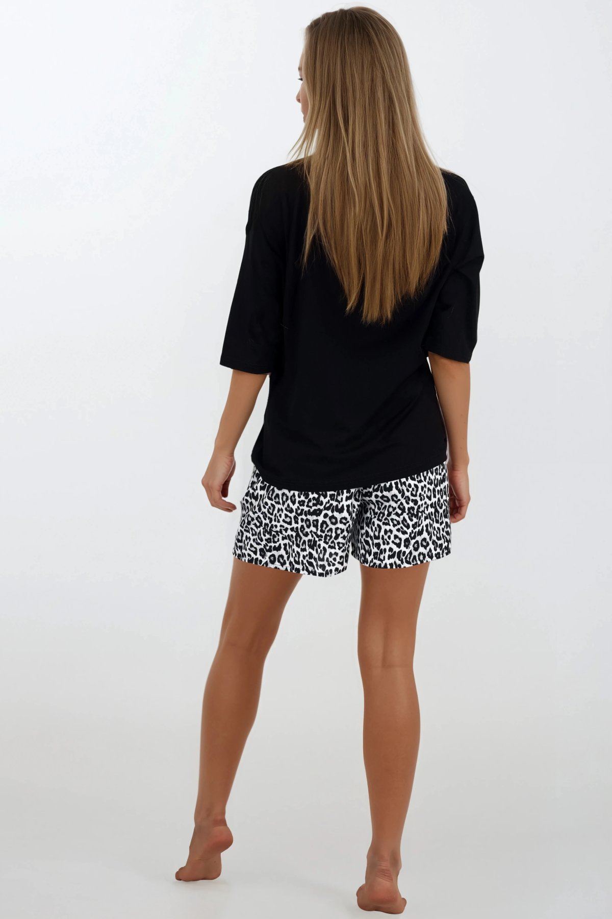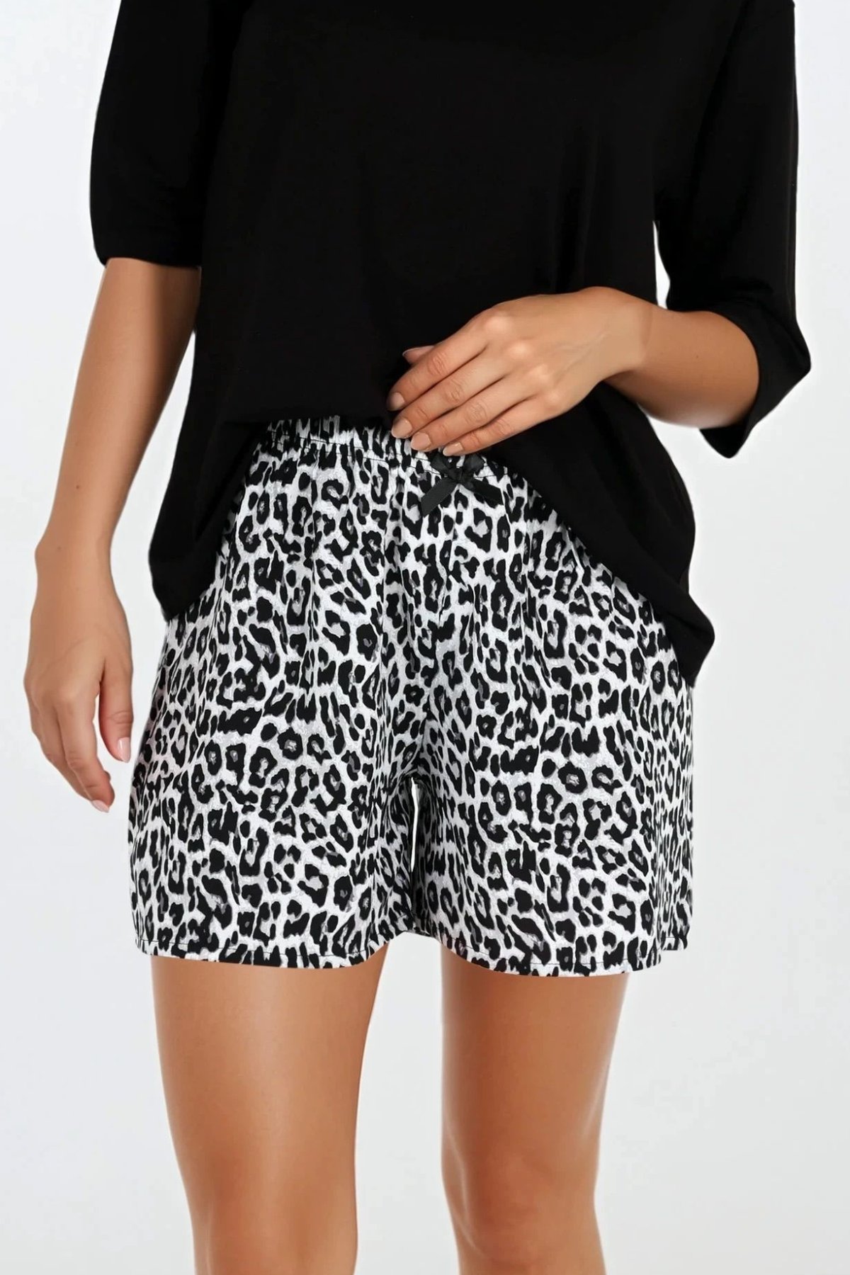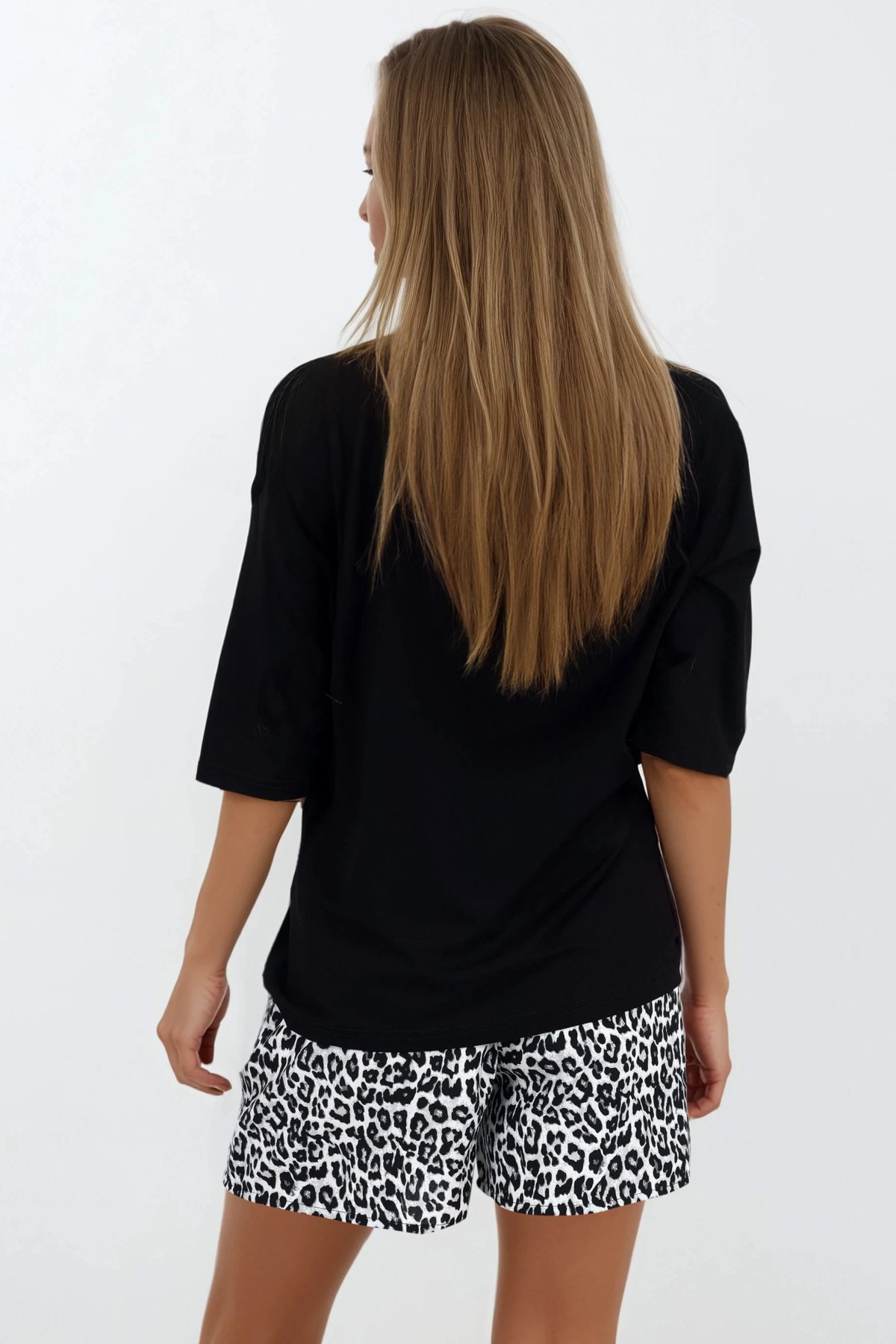Tento dvoudílný dámský komplet spojuje moderní styl s naprostým pohodlím. Černý top s kulatým výstřihem a tříčtvrtečními rukávy má volný, ležérní střih, který lichotí postavě a zajišťuje komfort při nošení. Kontrastní šortky s trendy leopardím vzorem dodávají celému pyžamu elegantně hravý charakter. Elastický pas se dokonale přizpůsobí tělu, zatímco prodyšná viskózová tkanina je příjemná na dotek, jemná k pokožce a zaručuje volné dýchání pokožky během noci. Tento stylový komplet se skvěle hodí nejen na spaní, ale i jako pohodlný domácí outfit pro chvíle odpočinku.