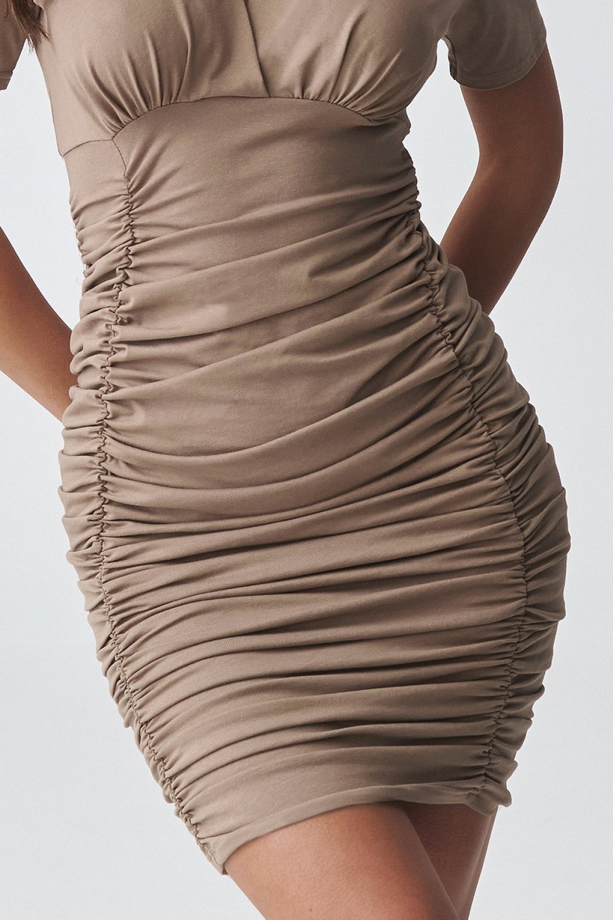 Vypasované mini v odstínu mocca s řasením. Navržené tak, aby zvýraznily siluetu a zároveň zůstaly příjemné na nošení.