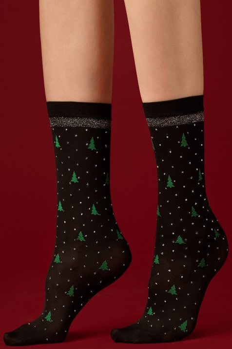 - třpytivé ponožky s drobnými stříbrnými tečkami a vánočními stromečky