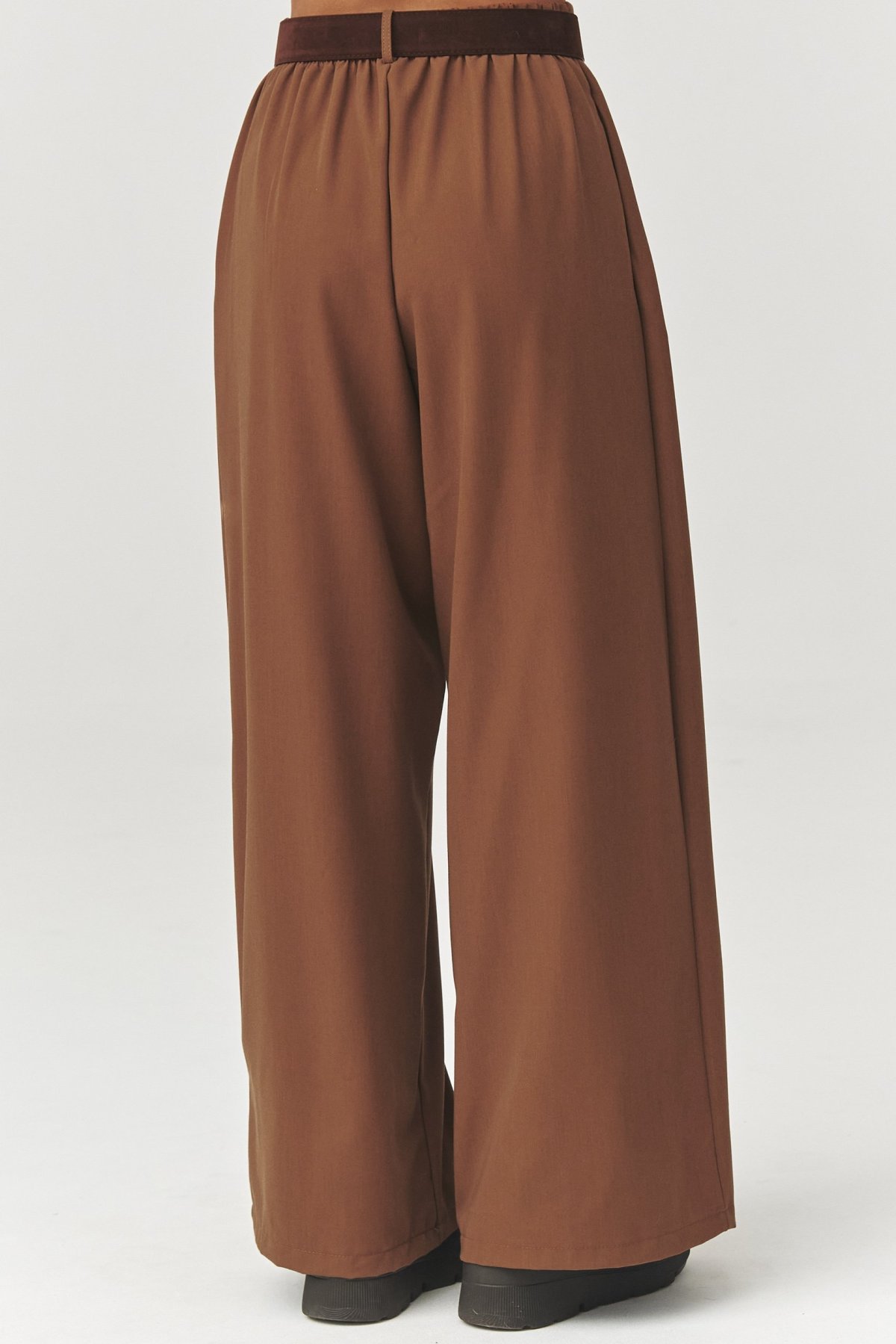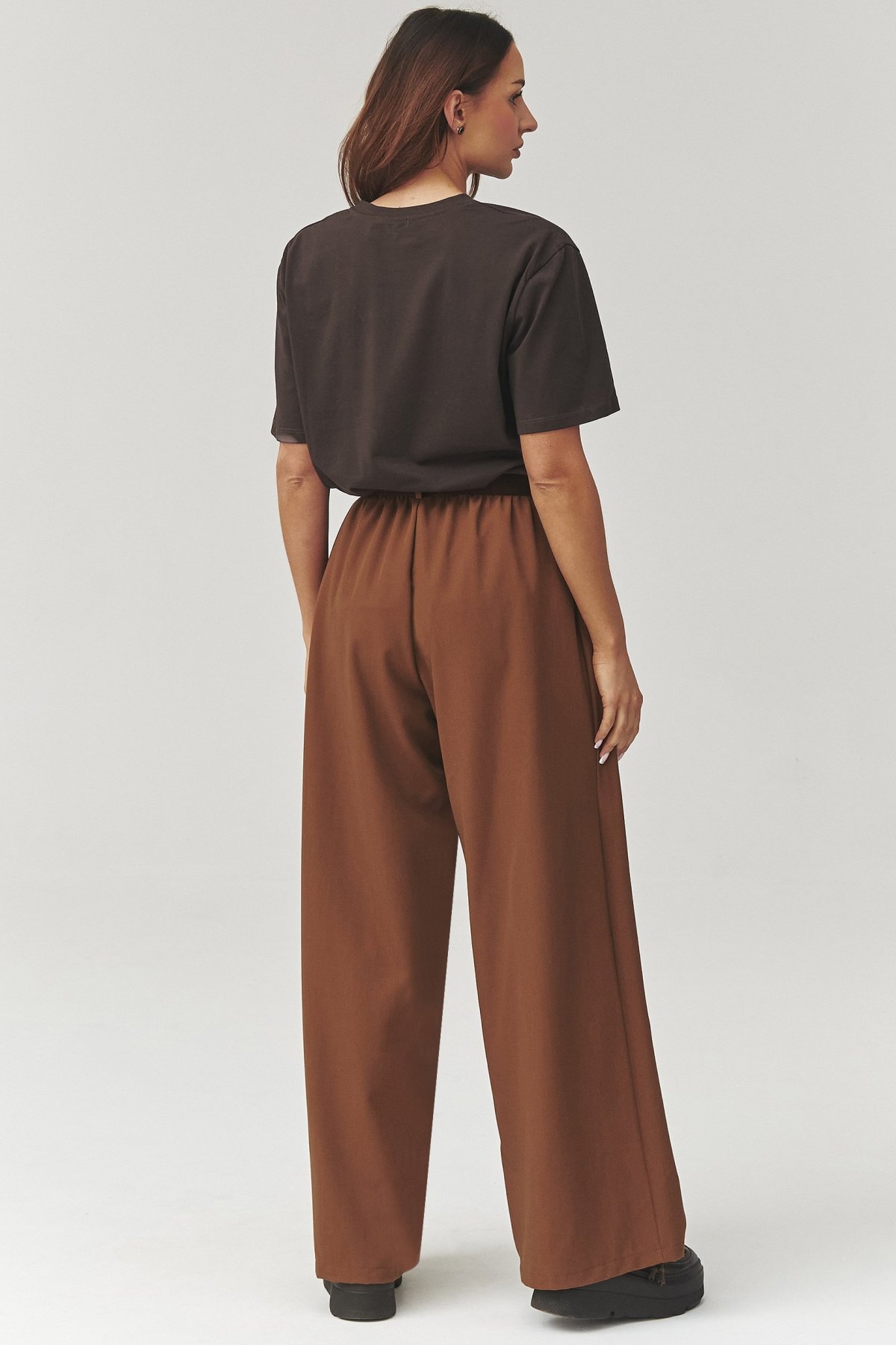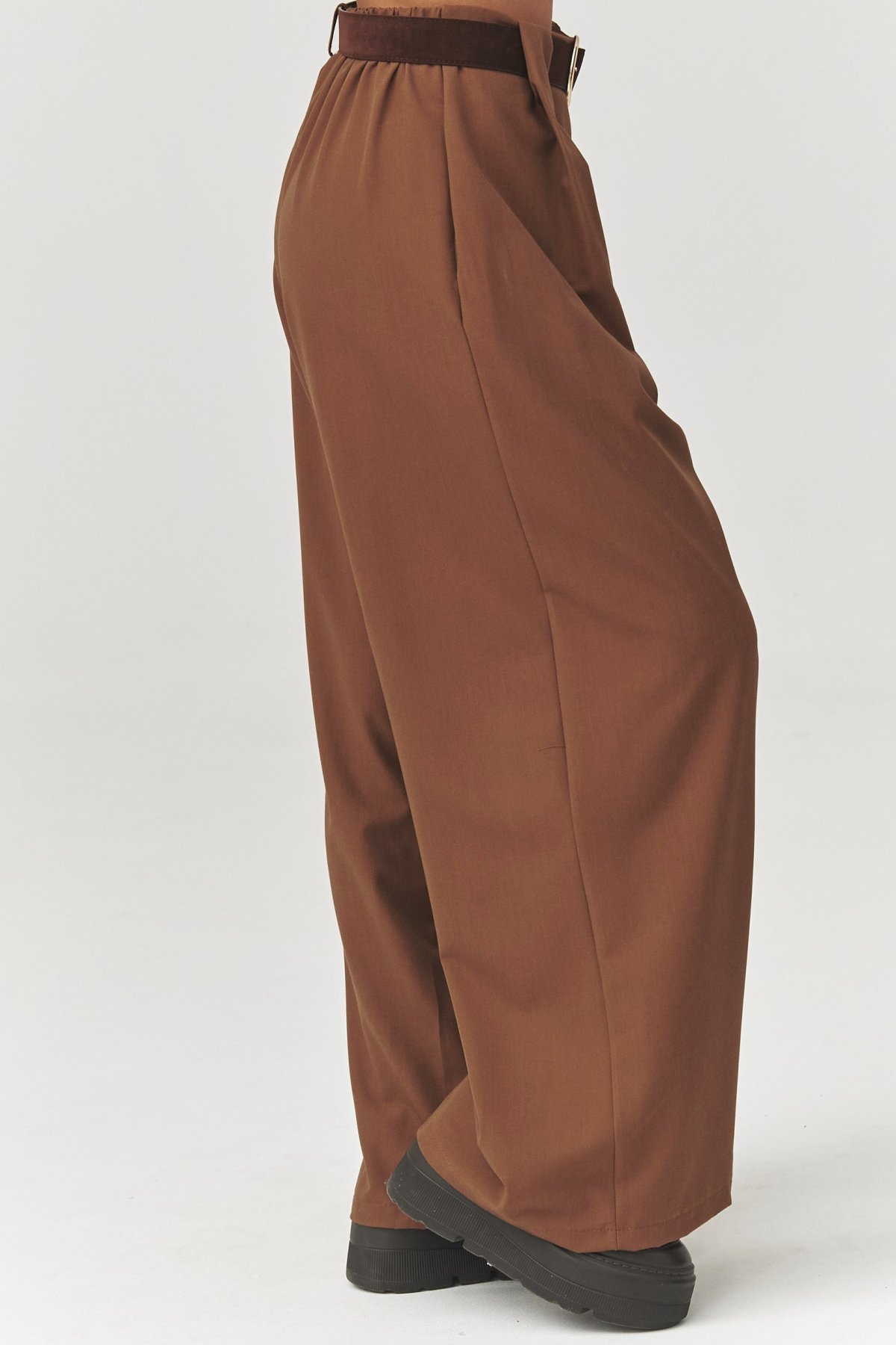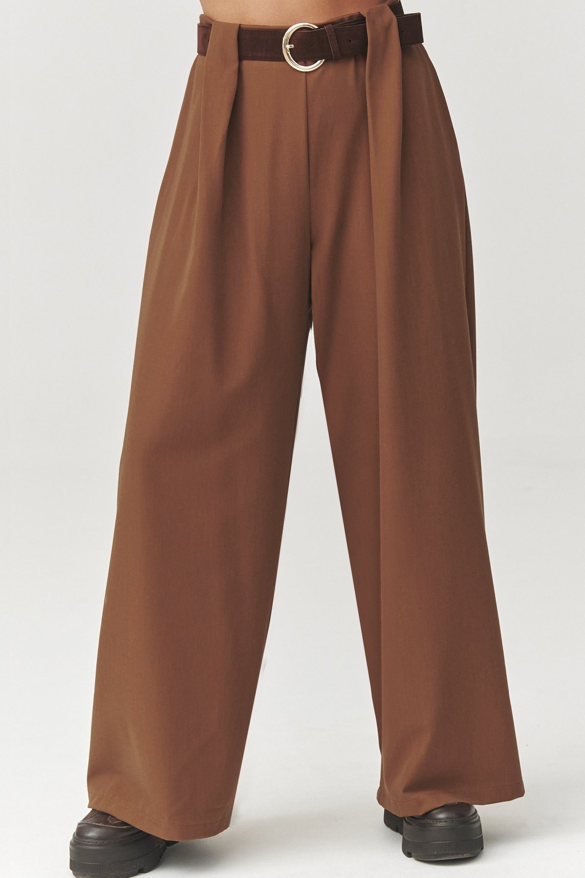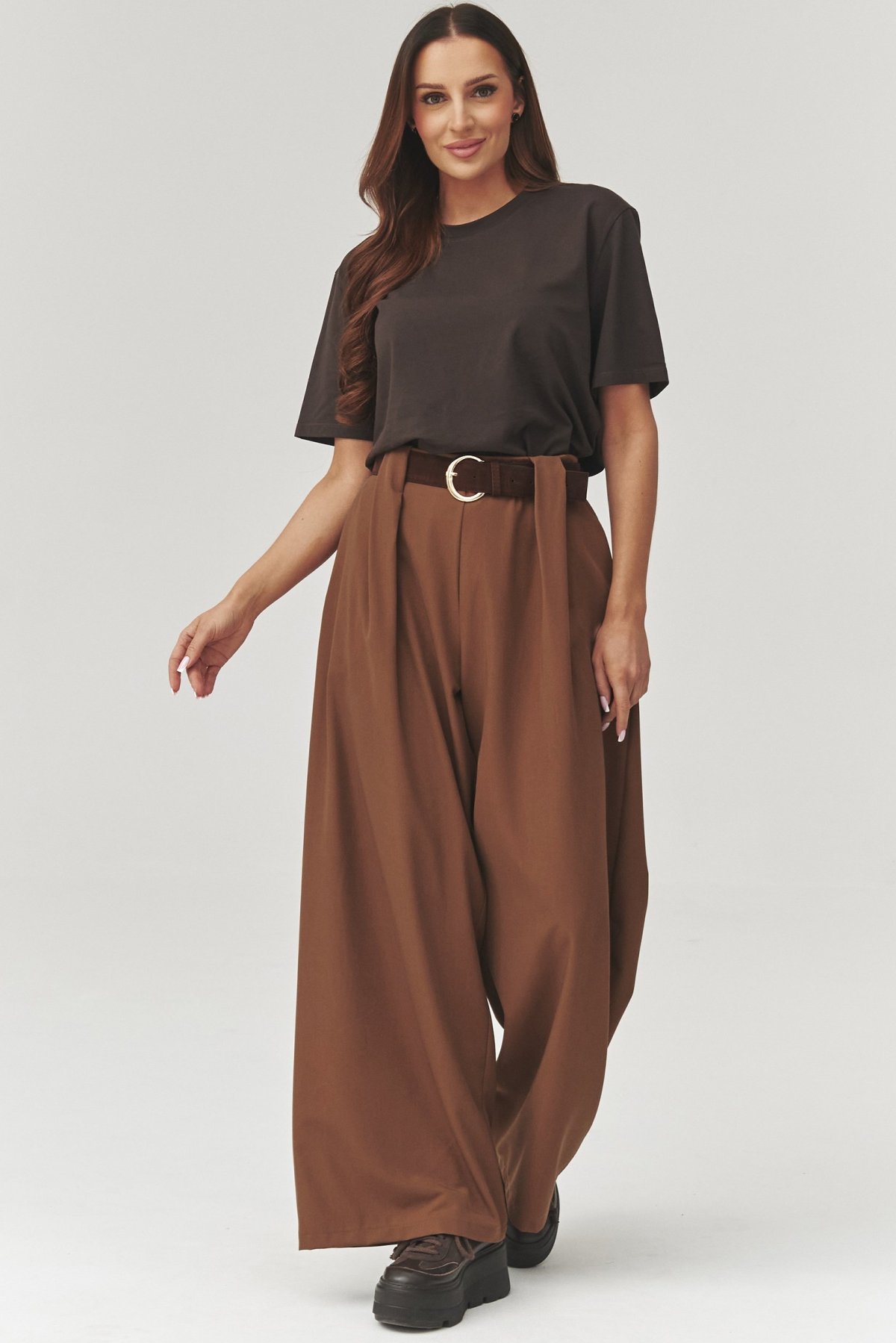 Elegantní široké kalhoty hnědé barvy spojují nadčasovou eleganci s maximálním komfortem. Díky vysokému pasu a jemným záhybům v přední části krásně zvýrazňují siluetu a opticky prodlužují nohy. Lehký, kvalitní materiál se příjemně nosí a perfektně padne jak k formálním, tak každodenním outfitům. Stylový doplněk v podobě pásku s kovovou sponou dodává modelu moderní charakter. Kalhoty se skvěle kombinují s košilí, elegantním sakem nebo pleteným svetrem. Ideální pro kancelář, schůzku i večerní setkání. Tento model je symbolem ženského šarmu a pohodlí v jednom.