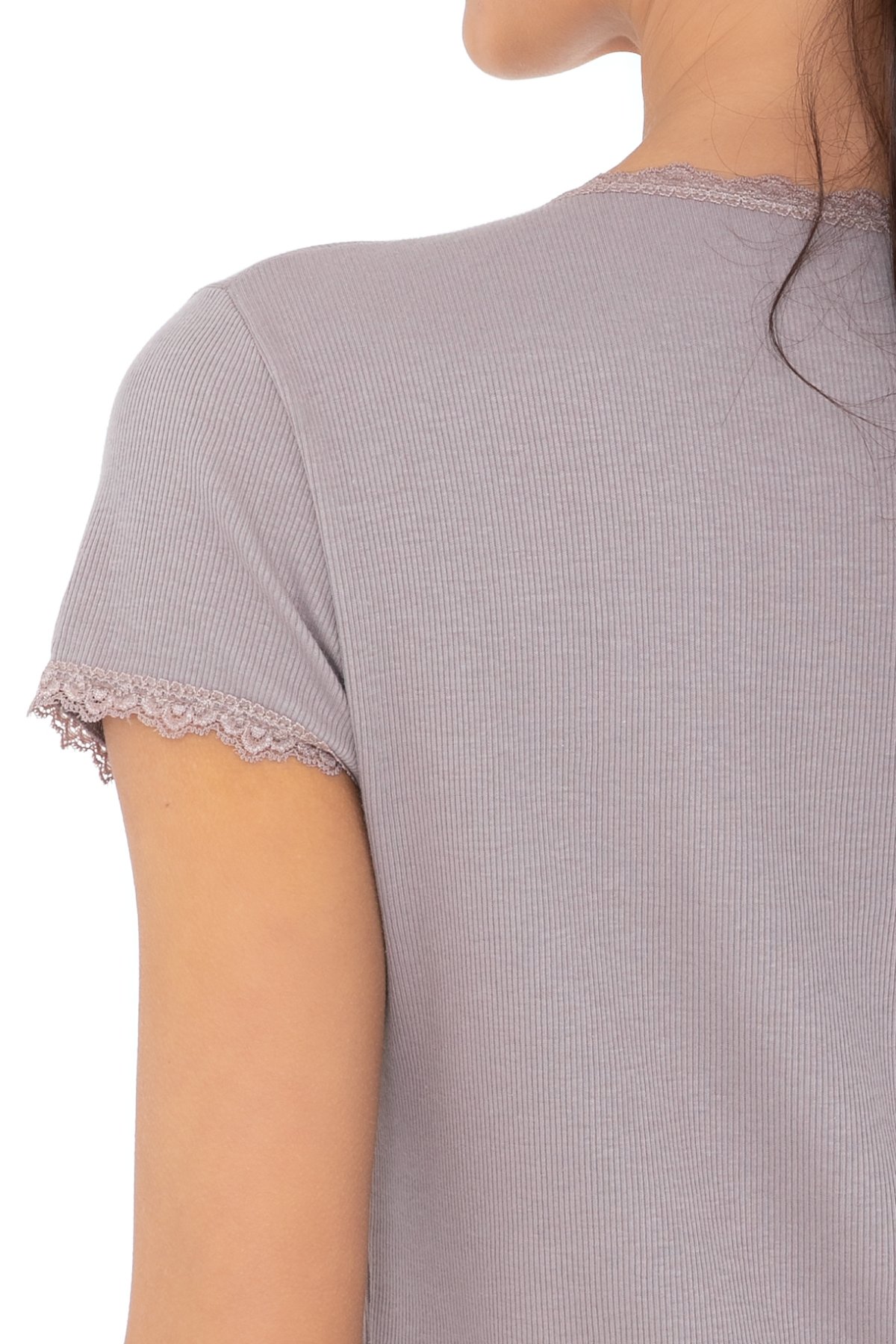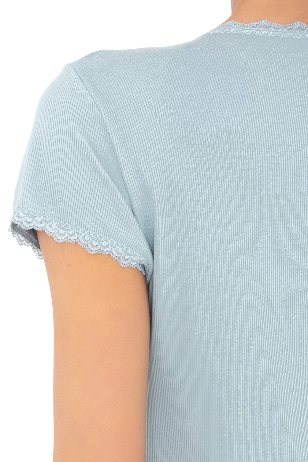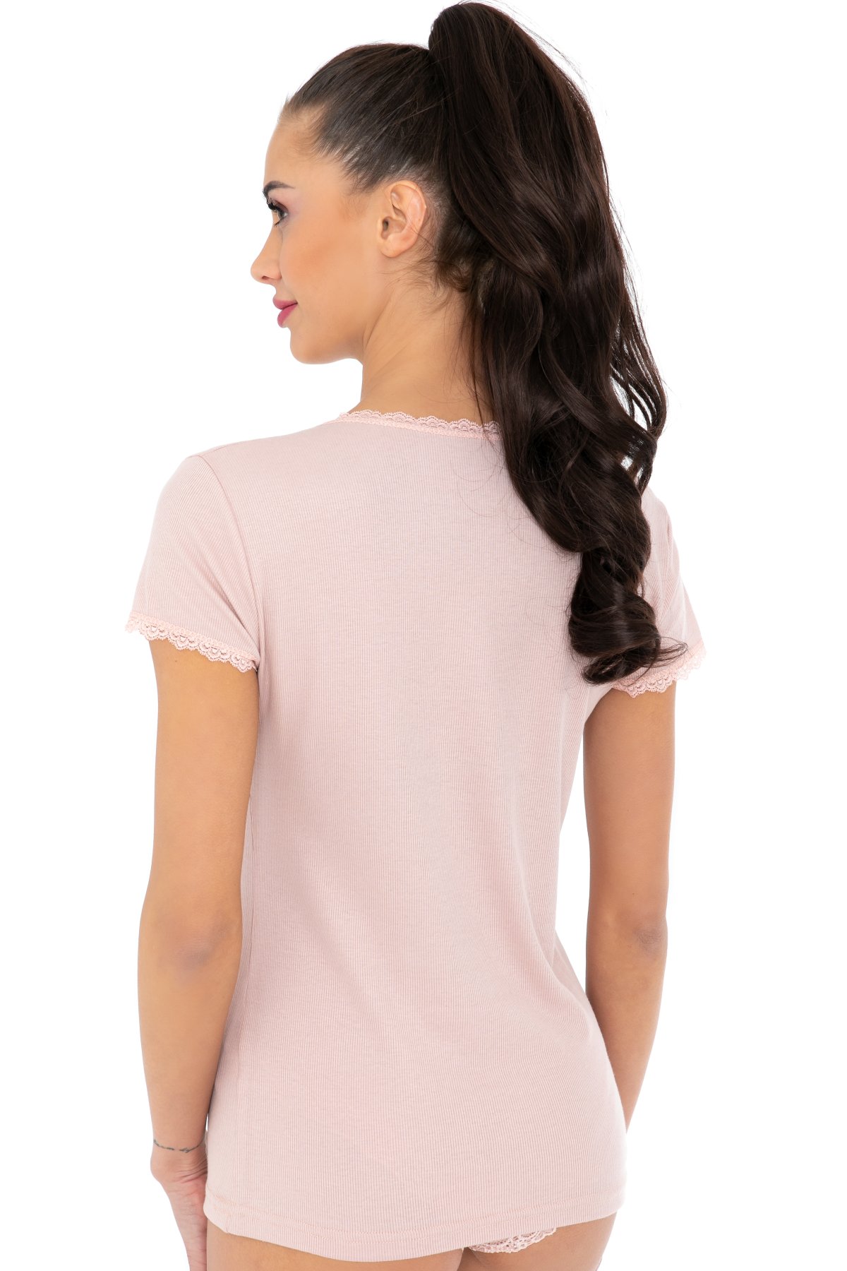 Dámské tričko z jemné žebrované bavlny je pohodlným a stylovým základem každodenního šatníku. Materiál je měkký, prodyšný a příjemný na dotek, takže se skvěle nosí po celý den. Krátké rukávy a kulatý výstřih působí žensky a univerzálně, zatímco jemná krajka kolem výstřihu a rukávů dodává modelu elegantní nádech. Tričko se snadno kombinuje – hodí se jako spodní vrstva pod svetr či sako, ale i k samostatnému nošení. Dostupné v několika decentních barvách.