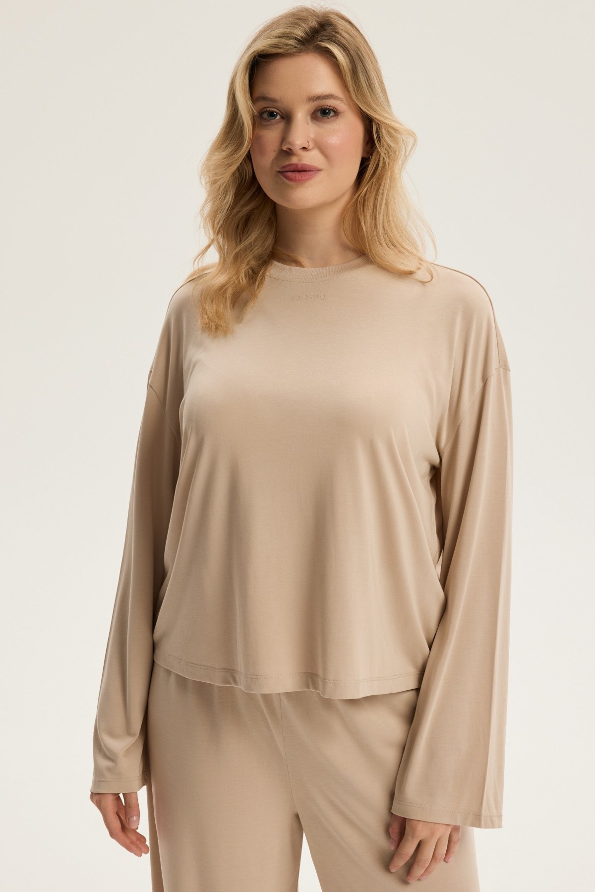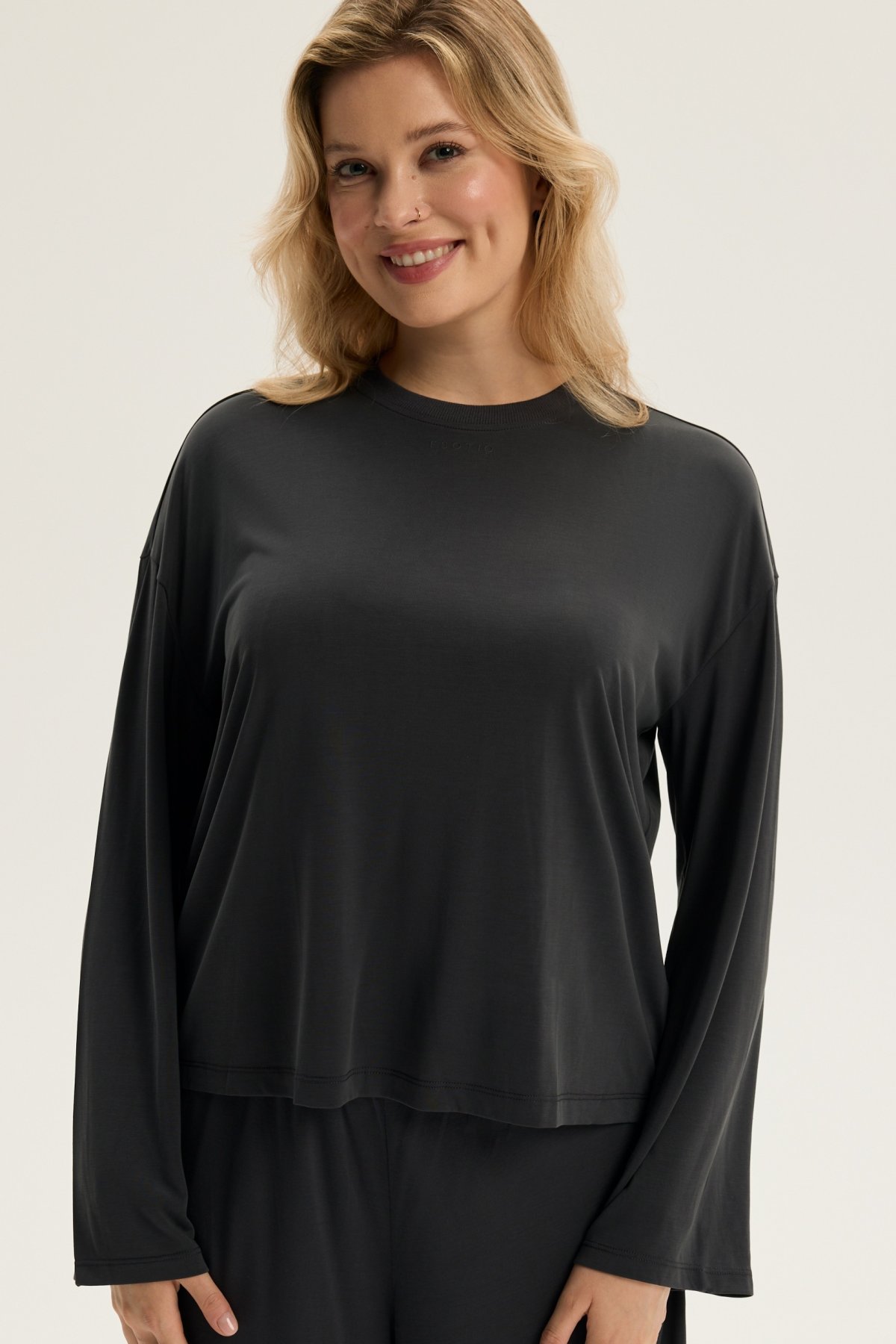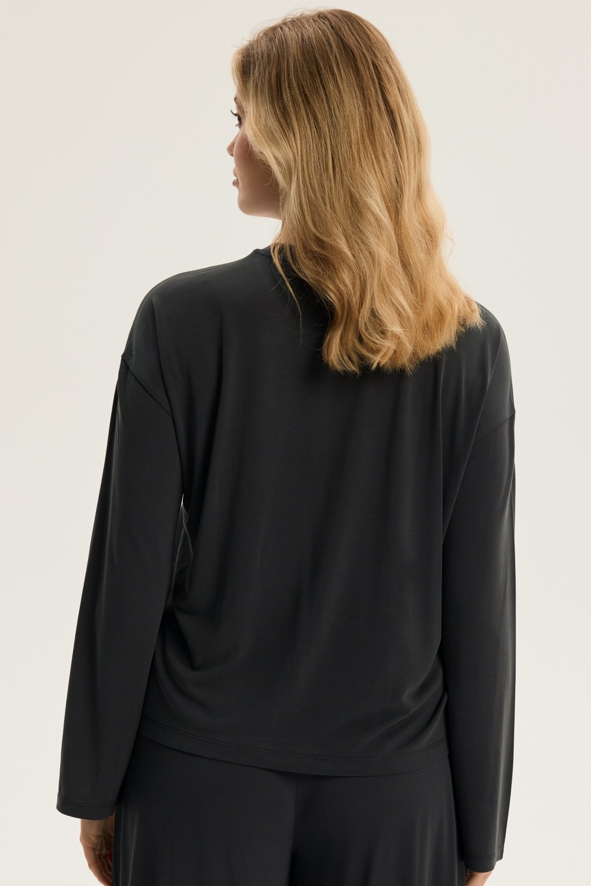 Lehký materiál s podílem modalu příjemně splývá po těle a vytváří měkký, vzdušný efekt. Volnější střih zajišťuje volnost pohybu, zatímco dlouhé rukávy přidávají na ženskosti i univerzálnosti. Navíc příjemně zahřejí. Skvěle se hodí jak na klidné chvíle doma, tak jako základ pro ležérní každodenní outfit.