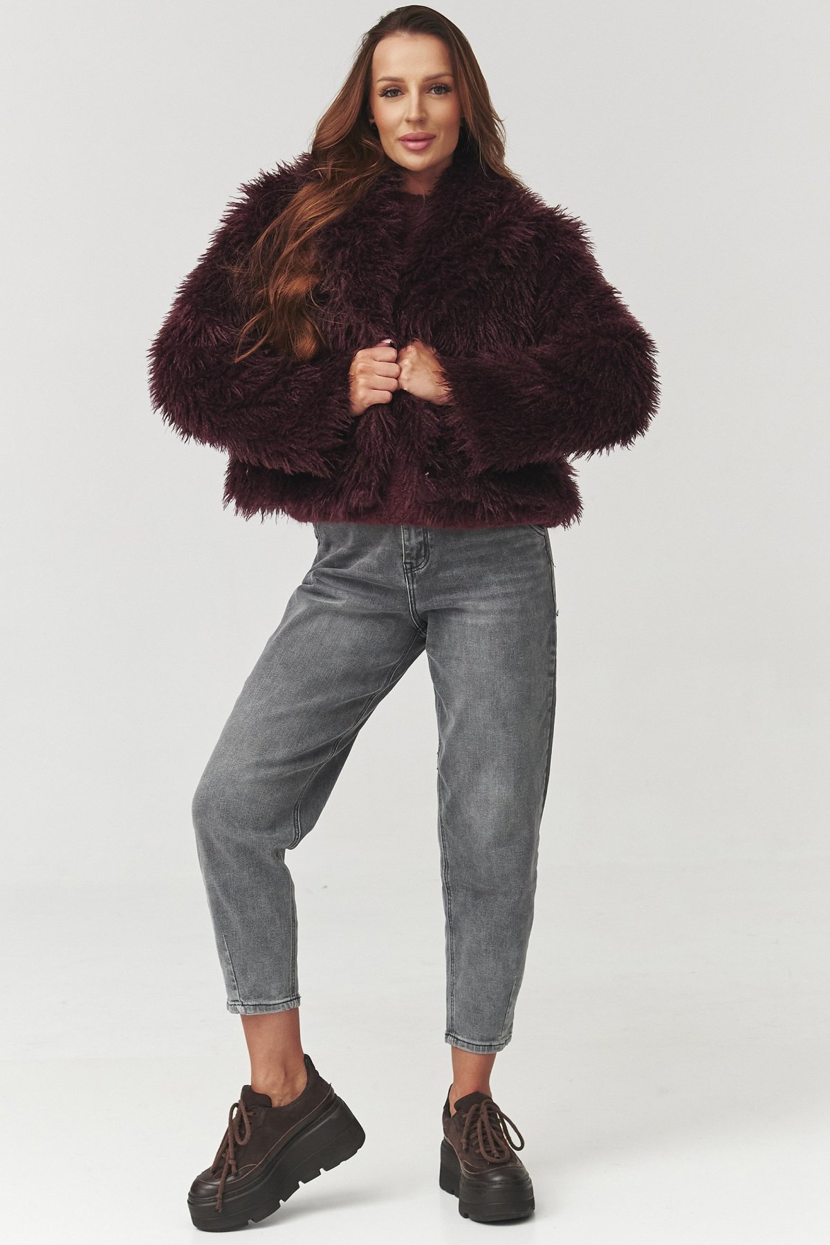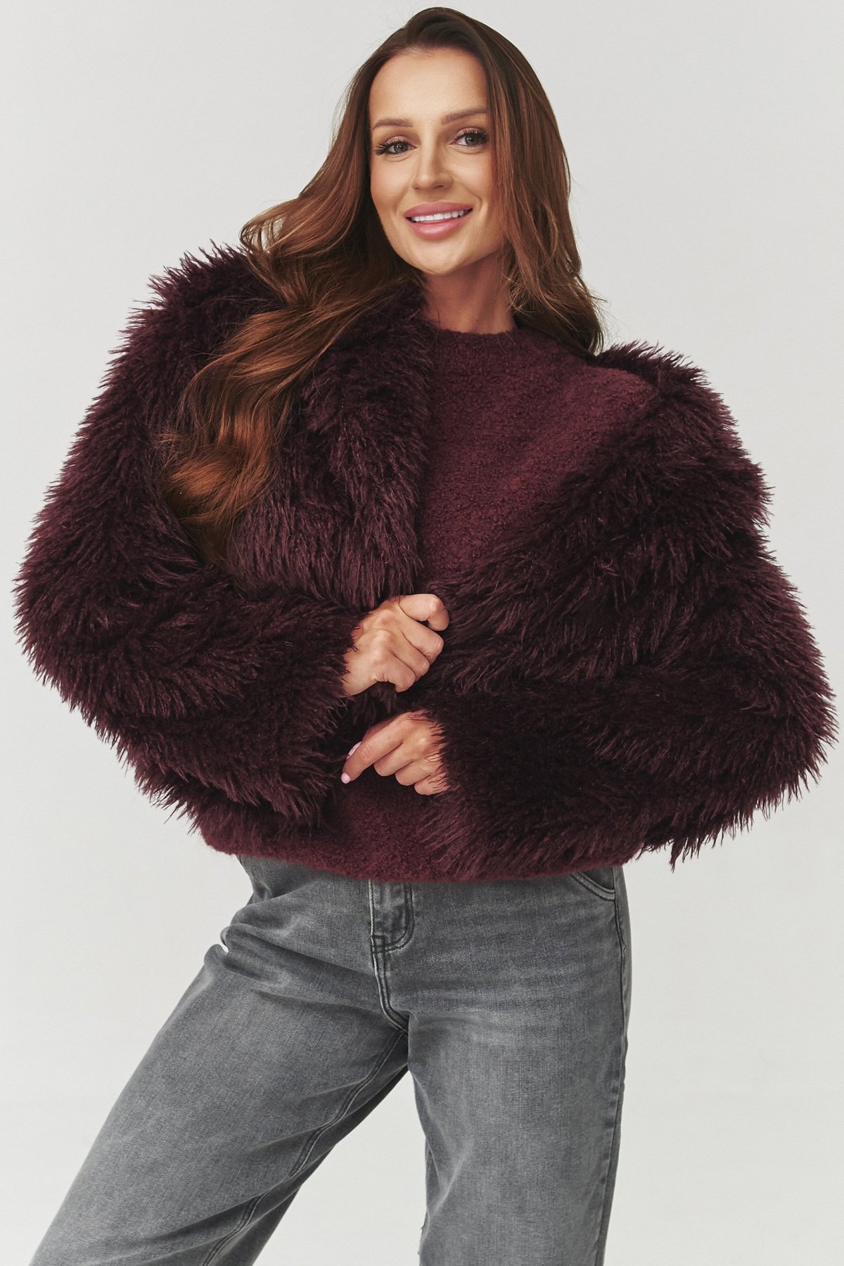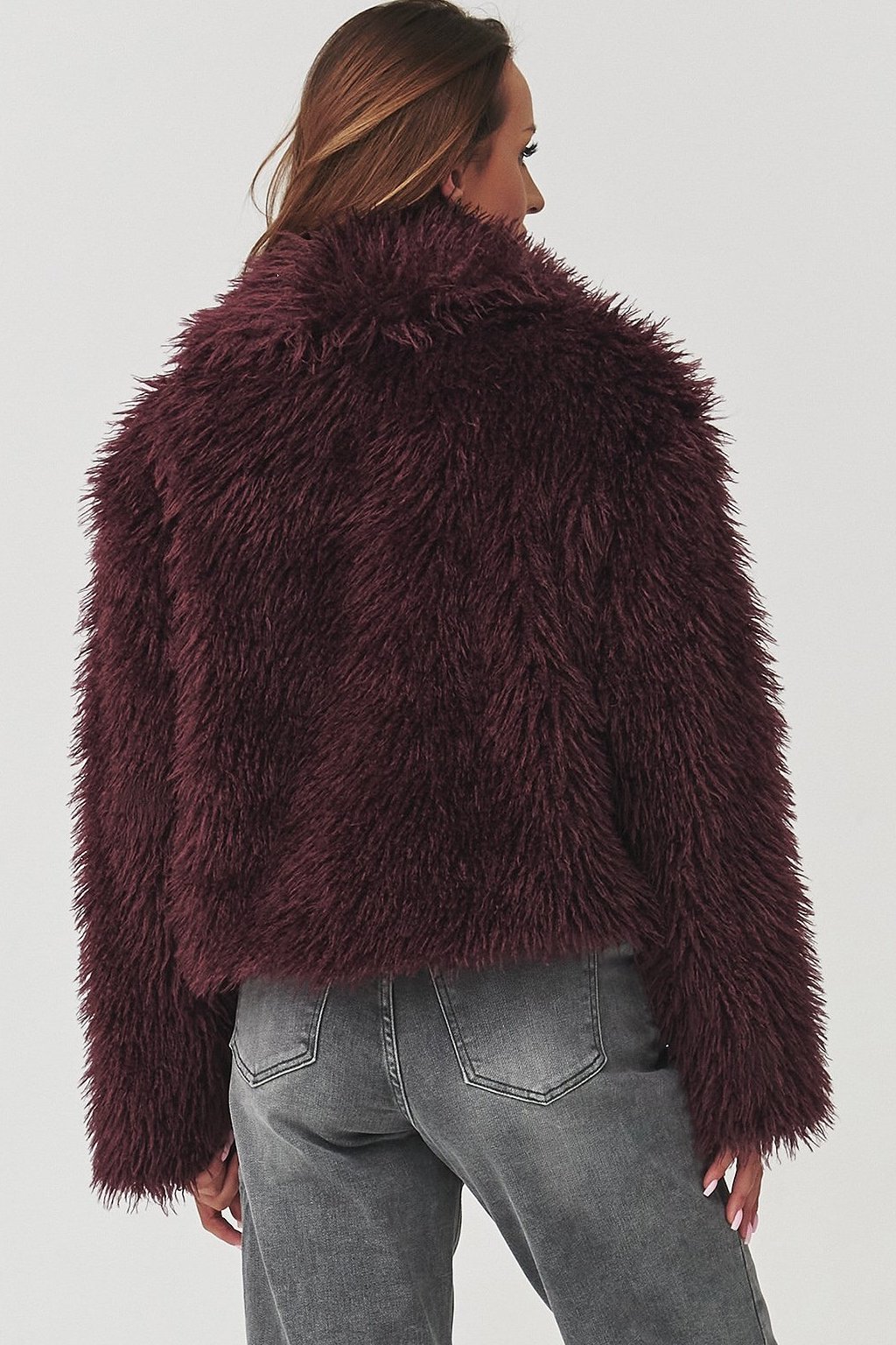 Stylový chlupatý kabátek v atraktivním bordó odstínu. Spojení elegance a zimního šarmu. Vyrobená z mimořádně jemného, nadýchaného umělého kožíšku. Poskytuje příjemné teplo a luxusní vzhled. Kratší střih lichotí postavě a opticky zvýrazňuje pas, zatímco bohatá textura dodává outfitu objem a sofistikovaný vzhled.