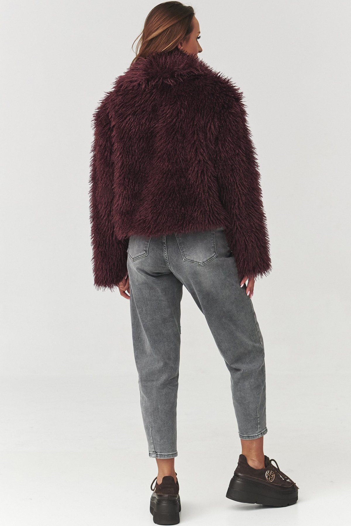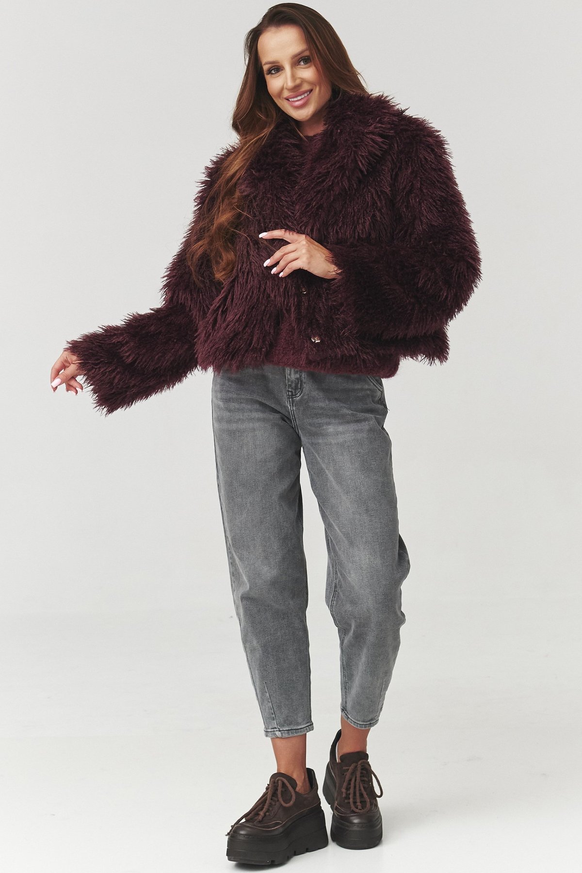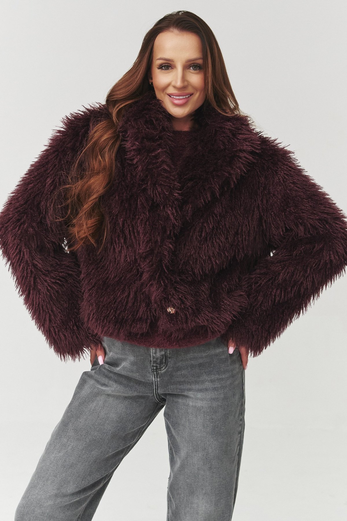 Stylový chlupatý kabátek v atraktivním bordó odstínu. Spojení elegance a zimního šarmu. Vyrobená z mimořádně jemného, nadýchaného umělého kožíšku. Poskytuje příjemné teplo a luxusní vzhled. Kratší střih lichotí postavě a opticky zvýrazňuje pas, zatímco bohatá textura dodává outfitu objem a sofistikovaný vzhled.