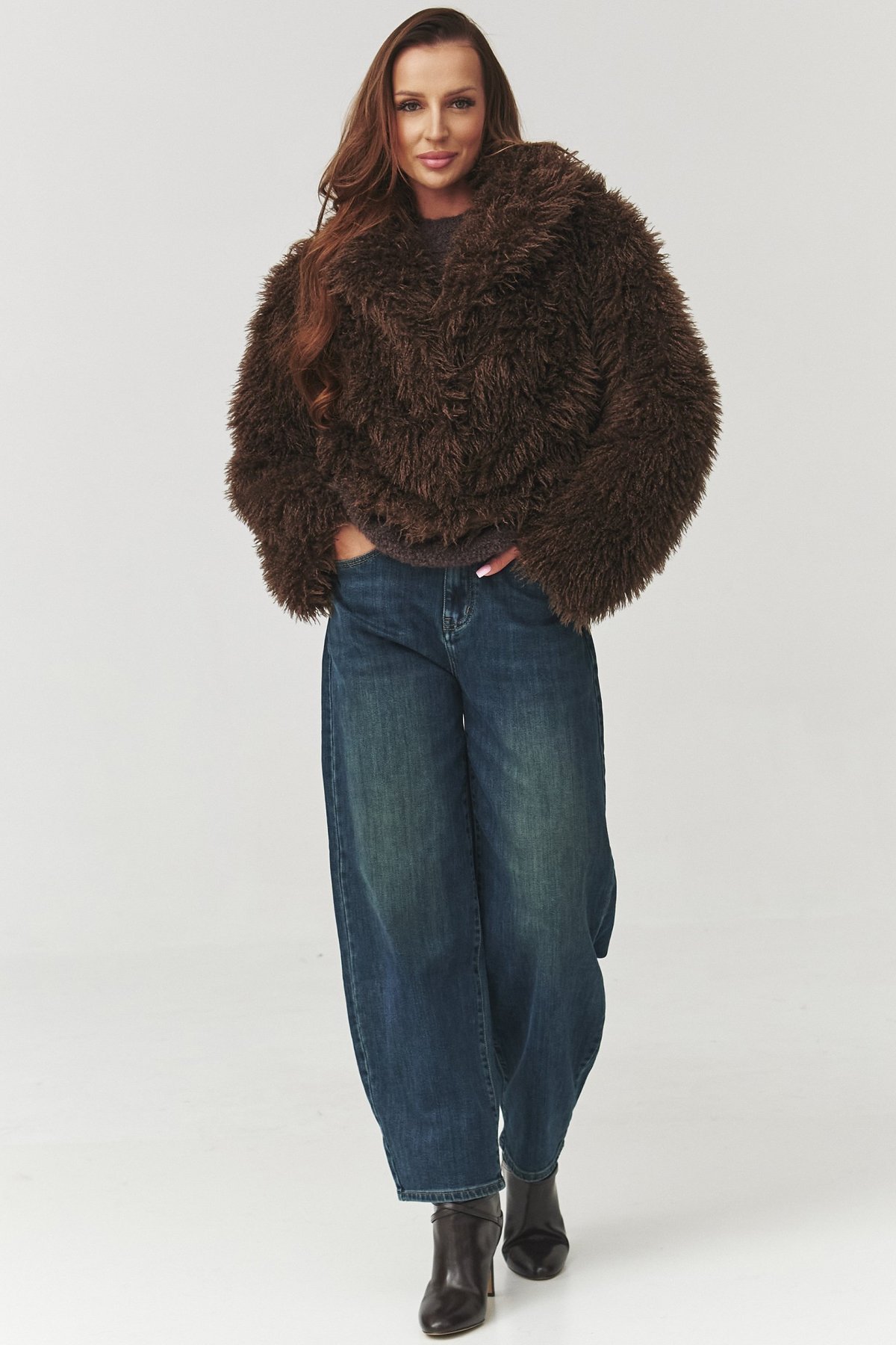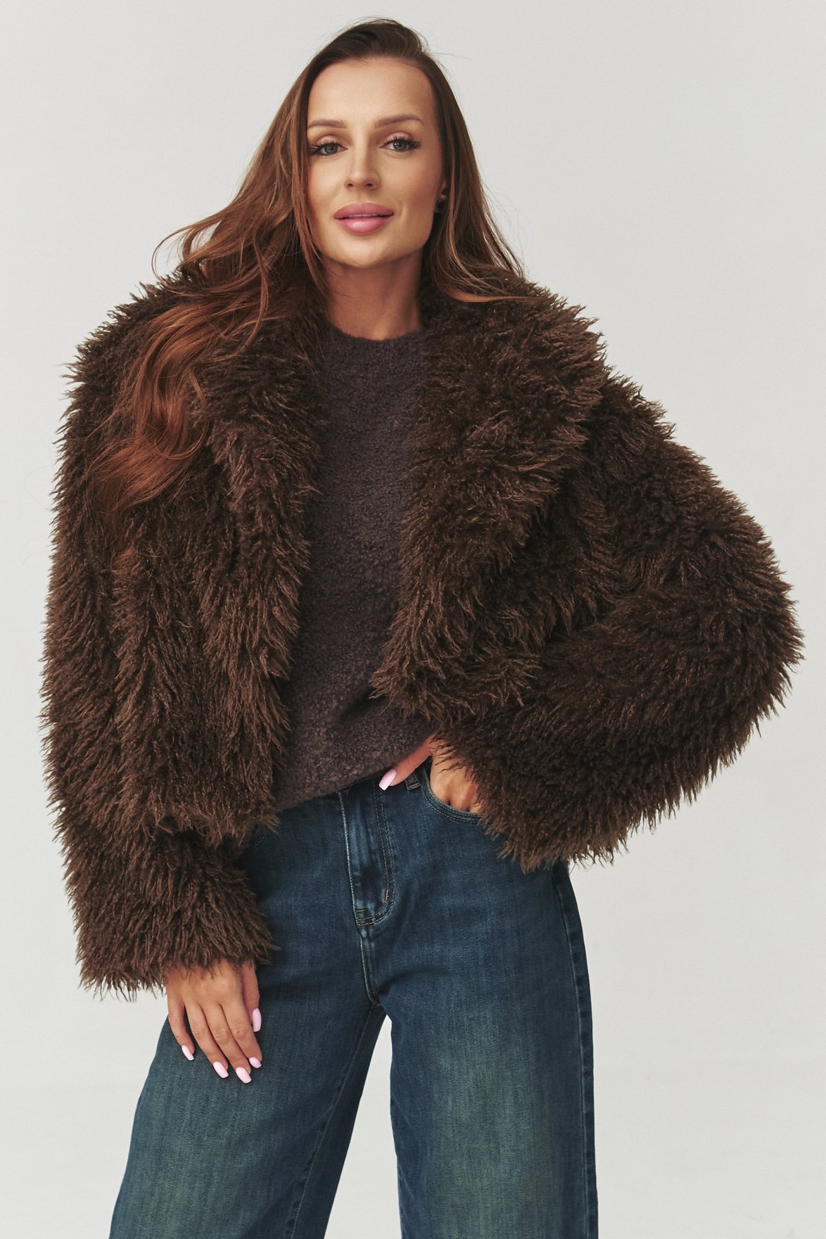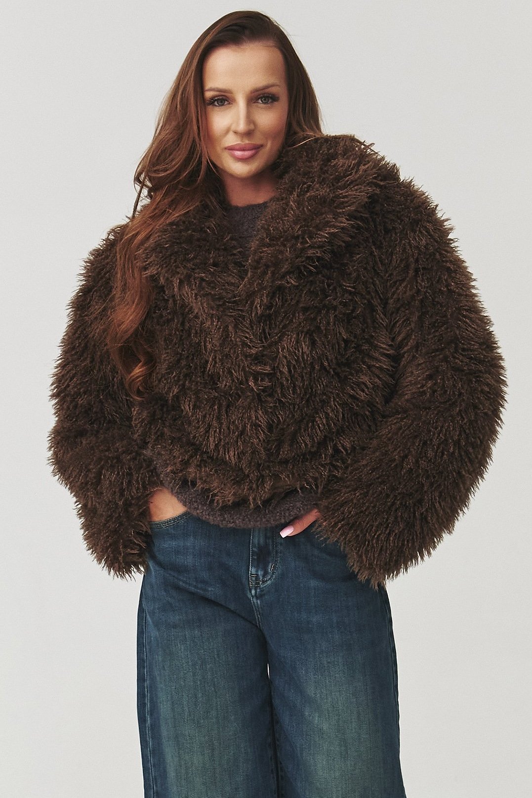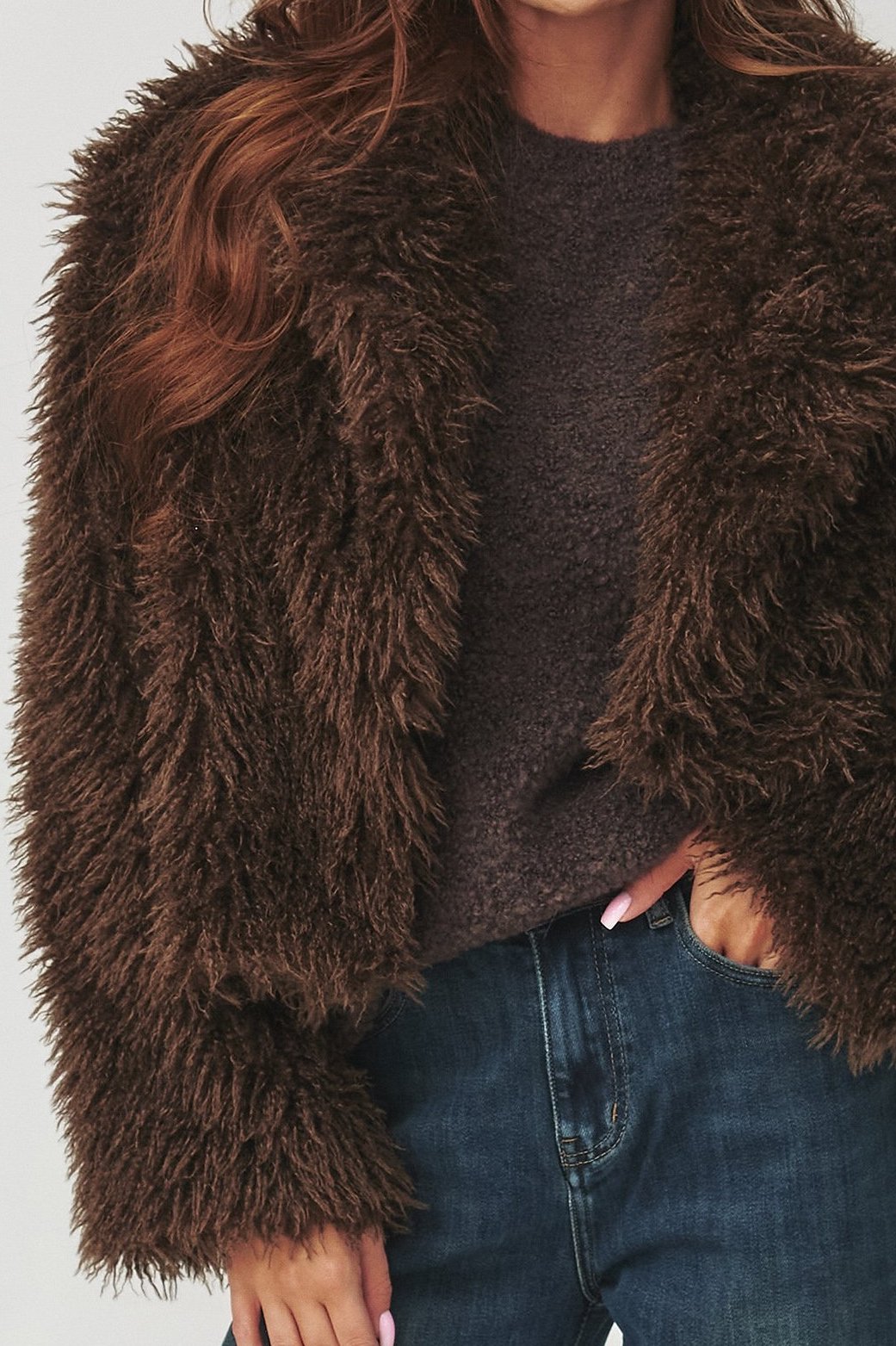 Stylový chlupatý kabátek v atraktivním hnědém odstínu. Spojení elegance a zimního šarmu. Vyrobená z mimořádně jemného, nadýchaného umělého kožíšku. Poskytuje příjemné teplo a luxusní vzhled. Kratší střih lichotí postavě a opticky zvýrazňuje pas, zatímco bohatá textura dodává outfitu objem a sofistikovaný vzhled.