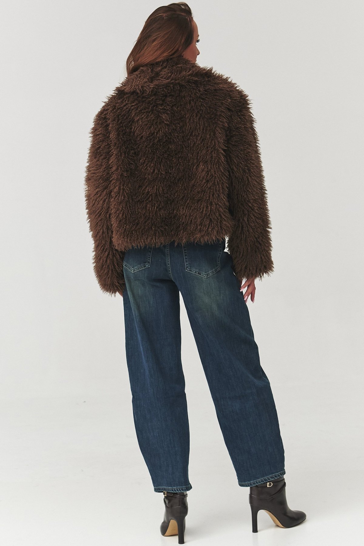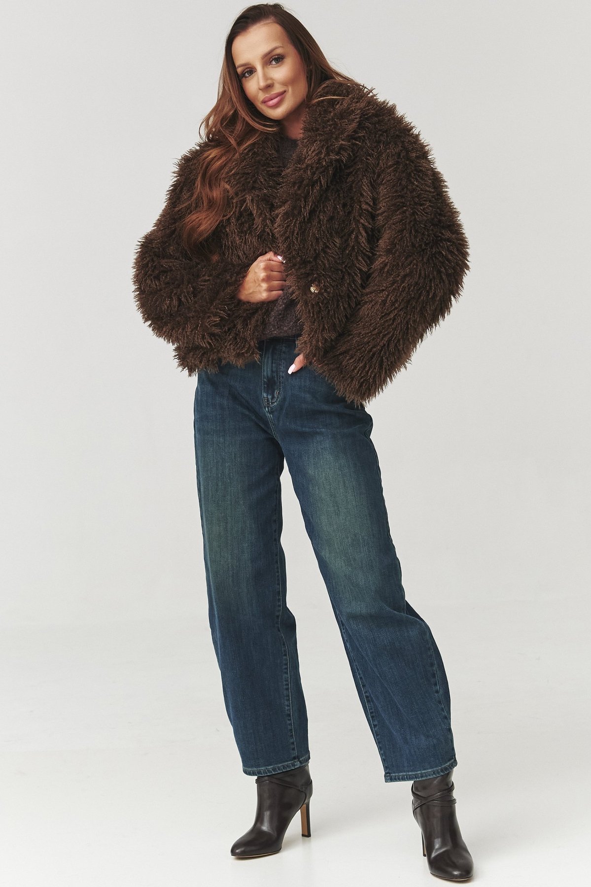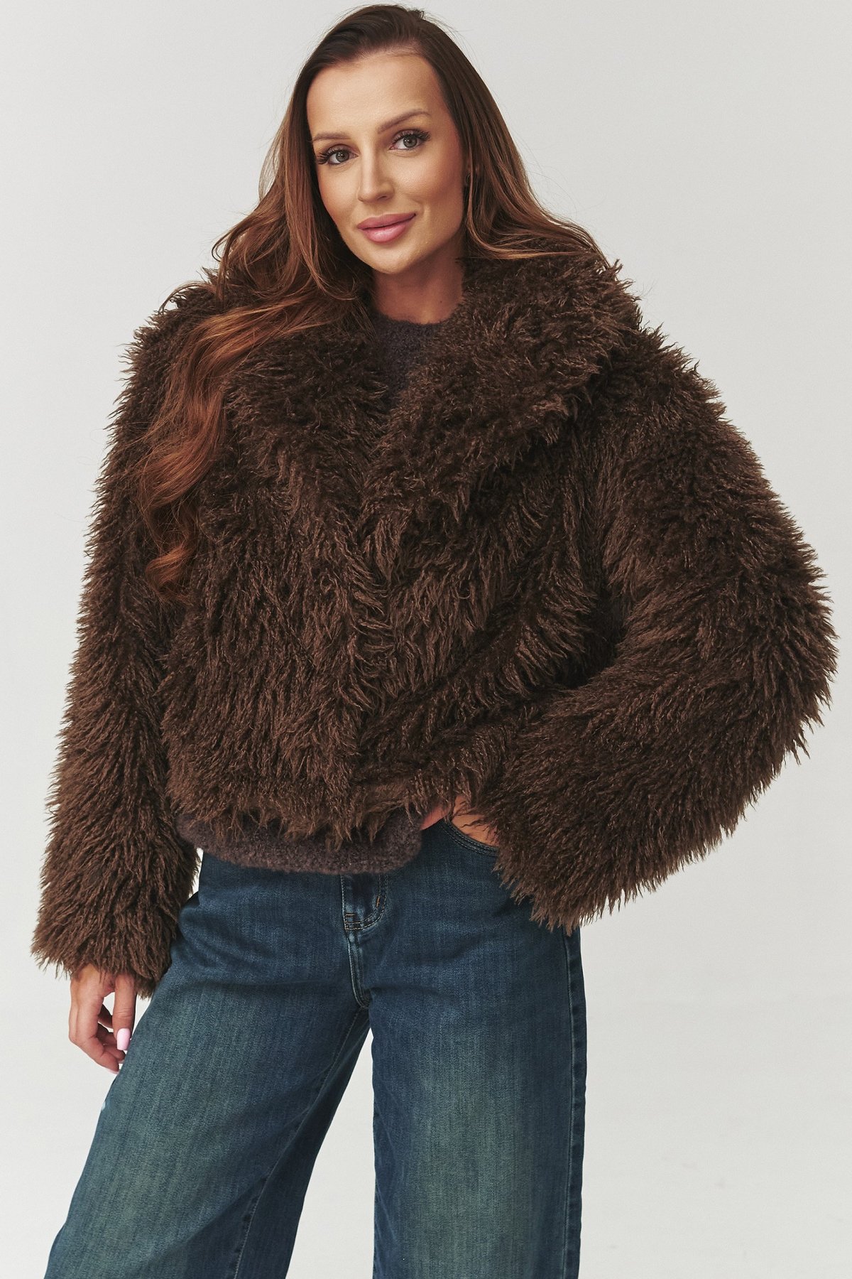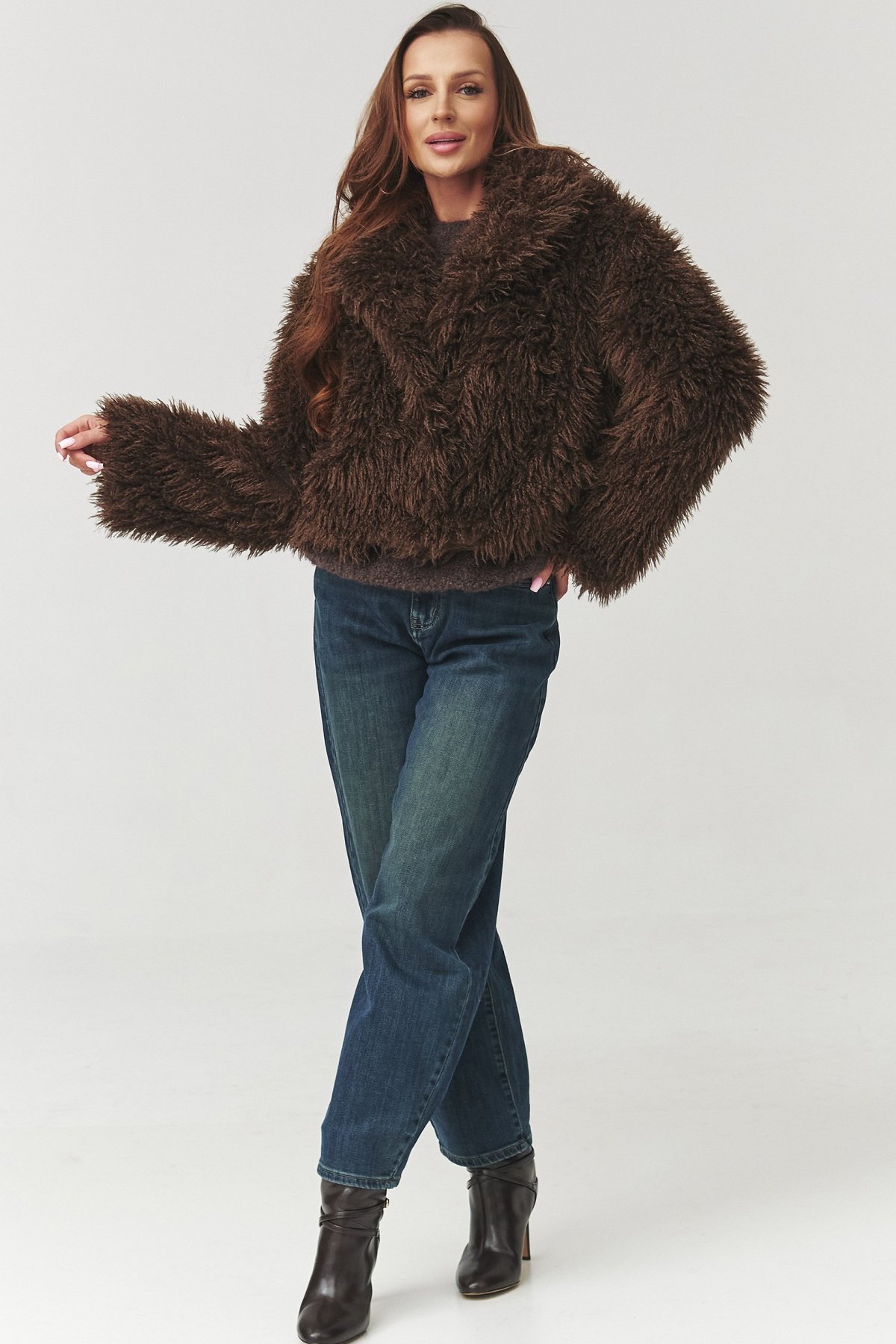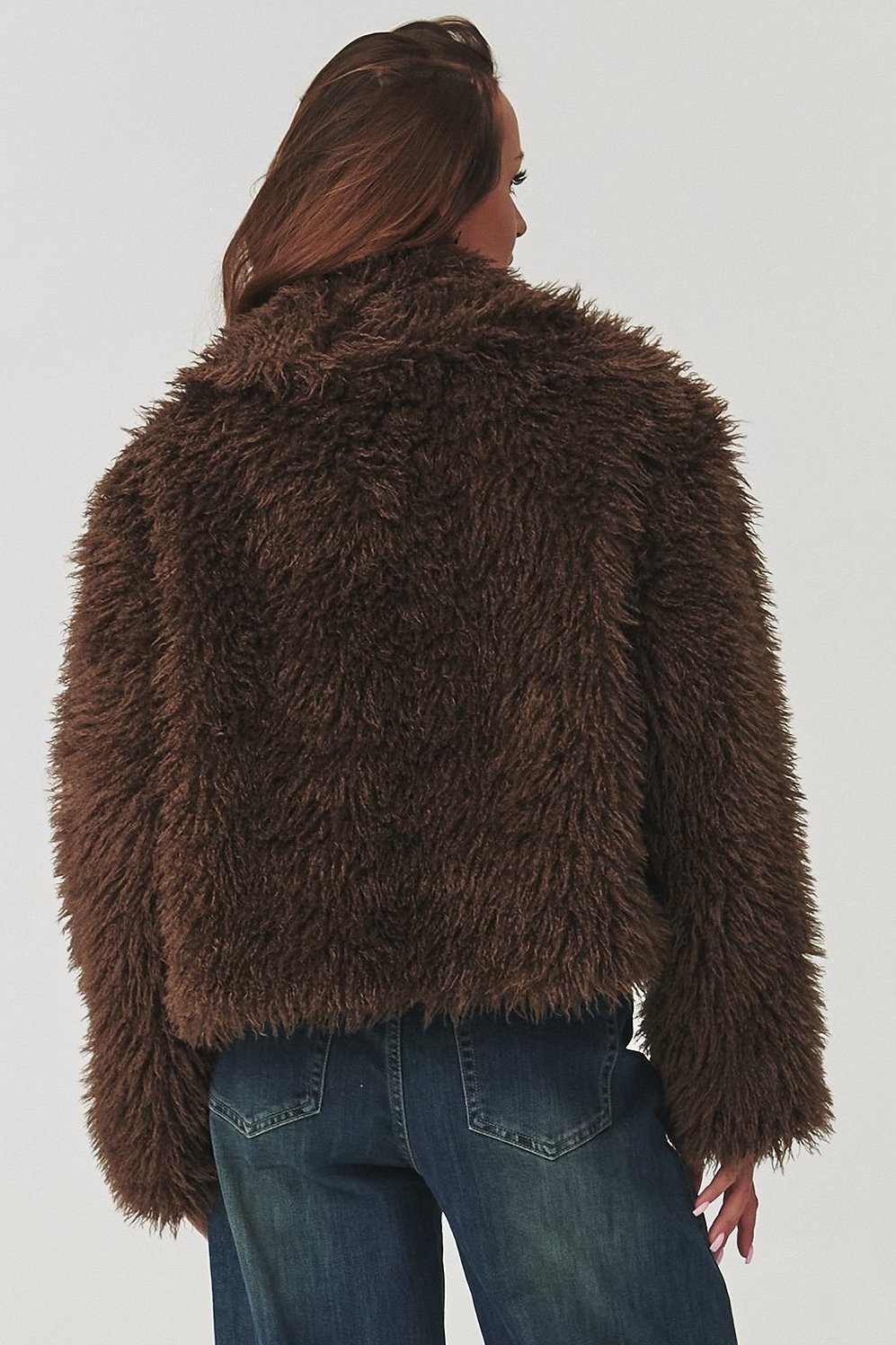 Stylový chlupatý kabátek v atraktivním hnědém odstínu. Spojení elegance a zimního šarmu. Vyrobená z mimořádně jemného, nadýchaného umělého kožíšku. Poskytuje příjemné teplo a luxusní vzhled. Kratší střih lichotí postavě a opticky zvýrazňuje pas, zatímco bohatá textura dodává outfitu objem a sofistikovaný vzhled.