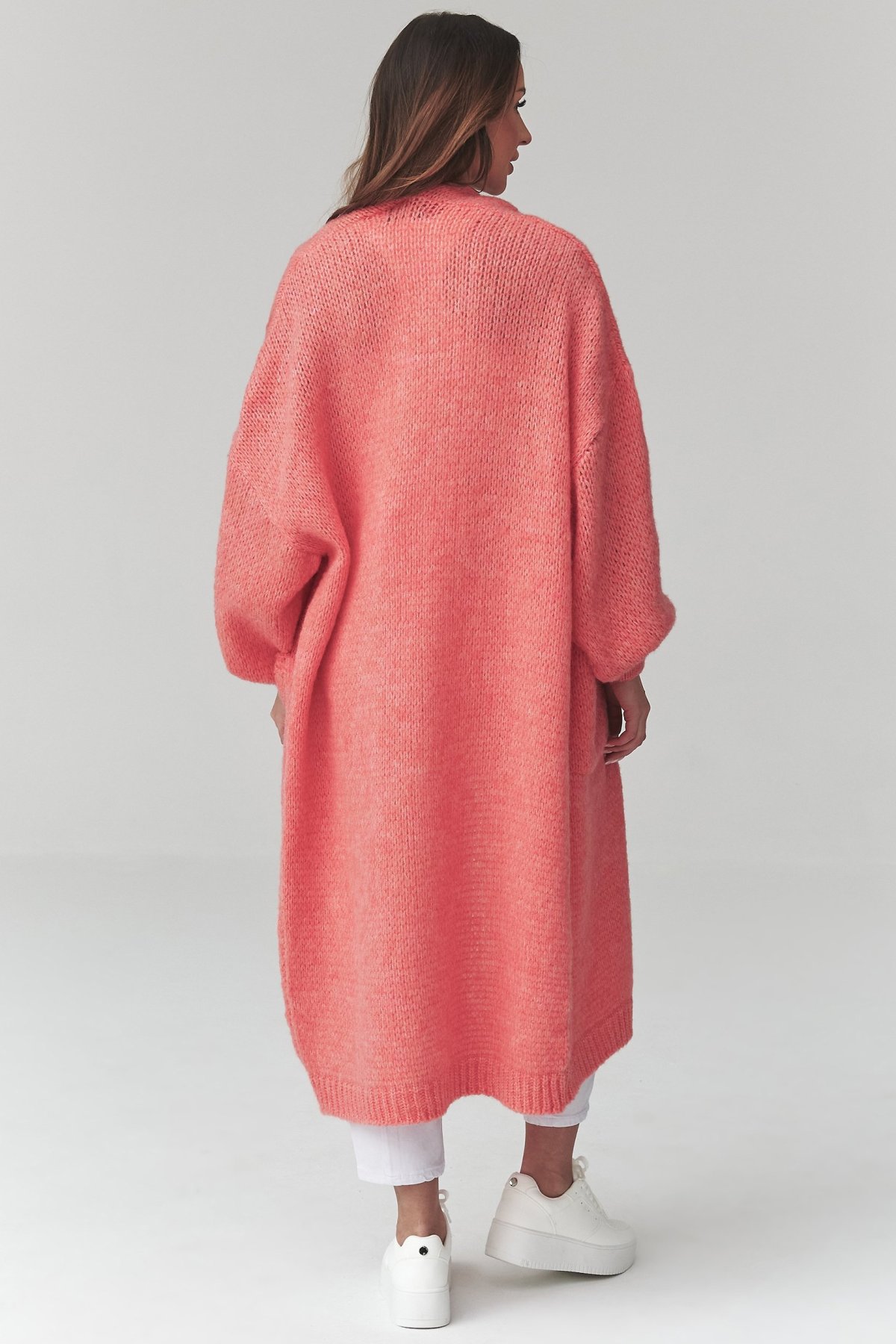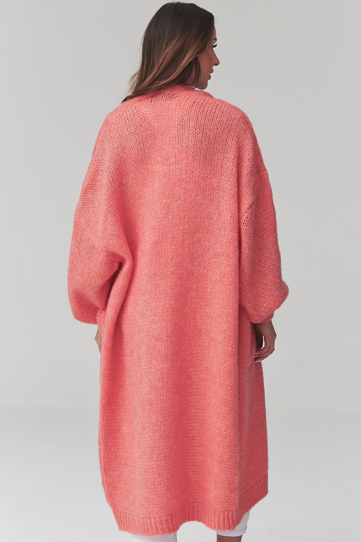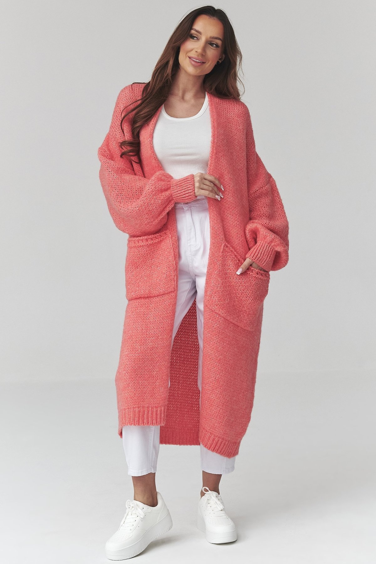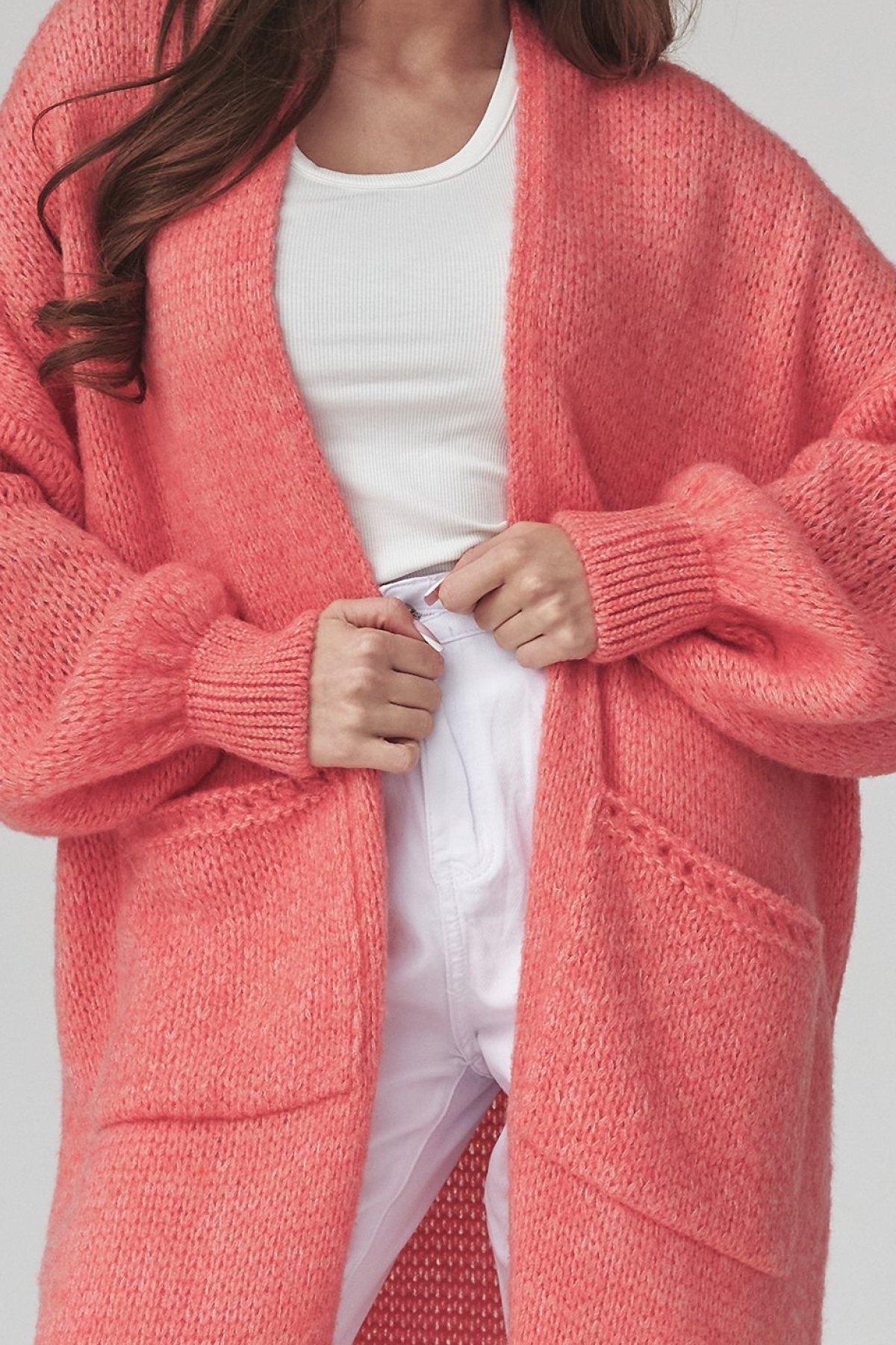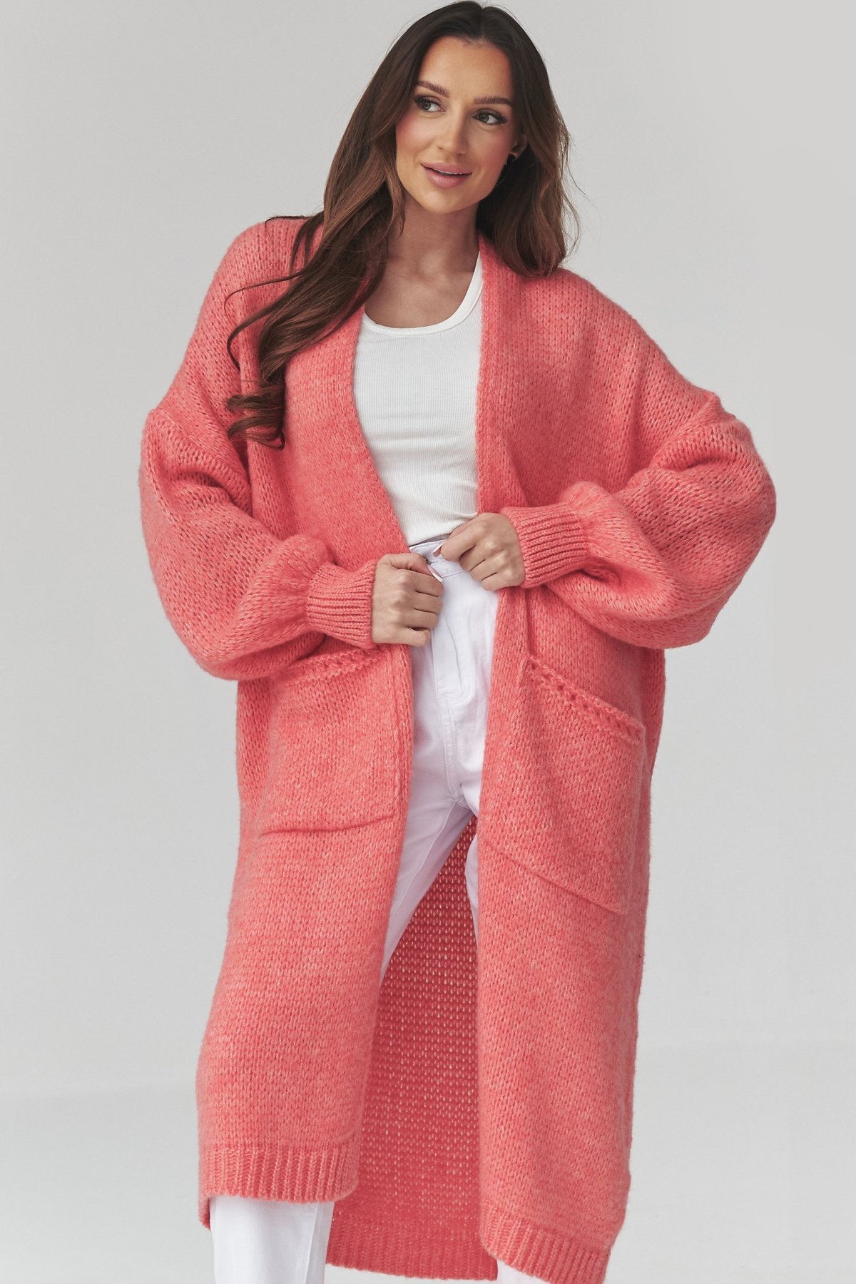 Dlouhý kardigan lososové barvy s kapsami je kousek, po kterém sáhnete ve chvíli, kdy chcete pohodlí i upravený vzhled.