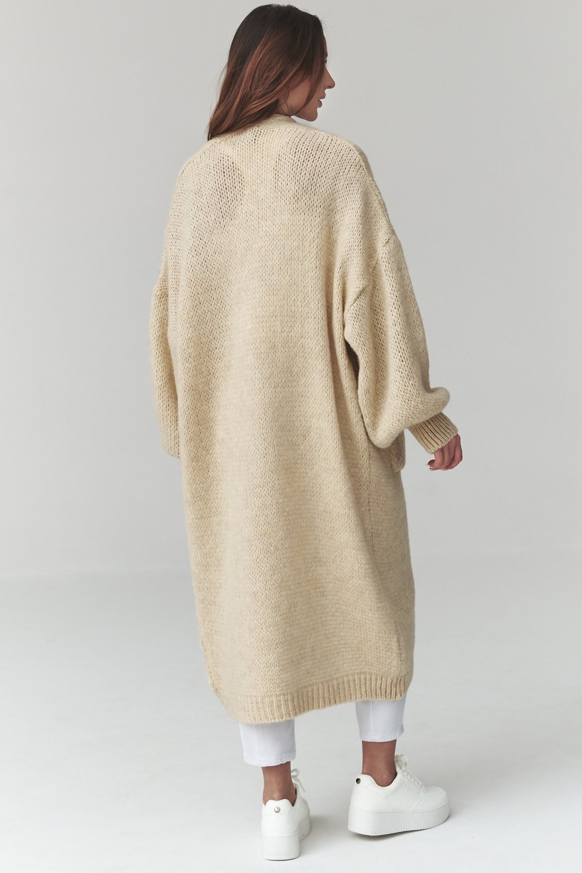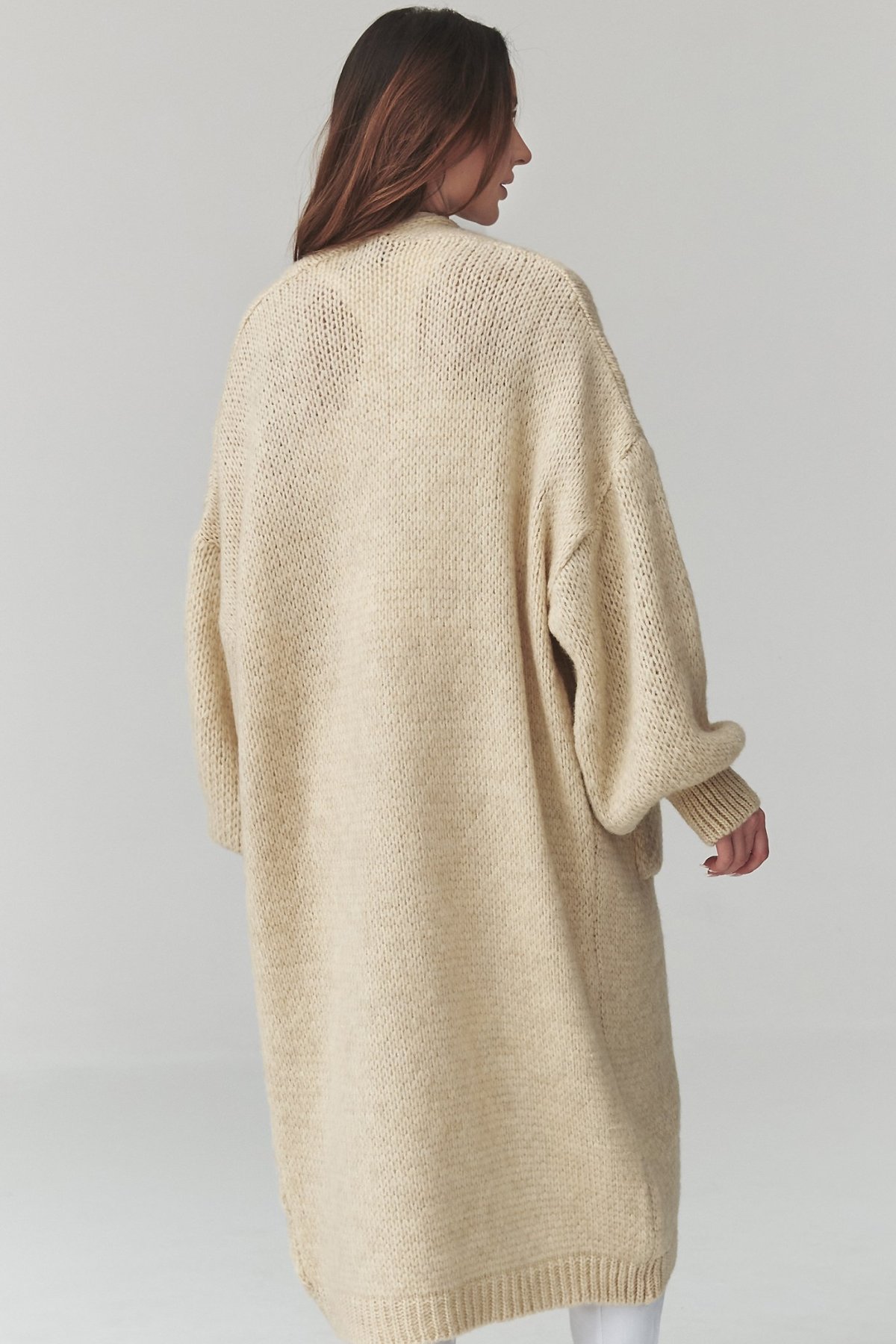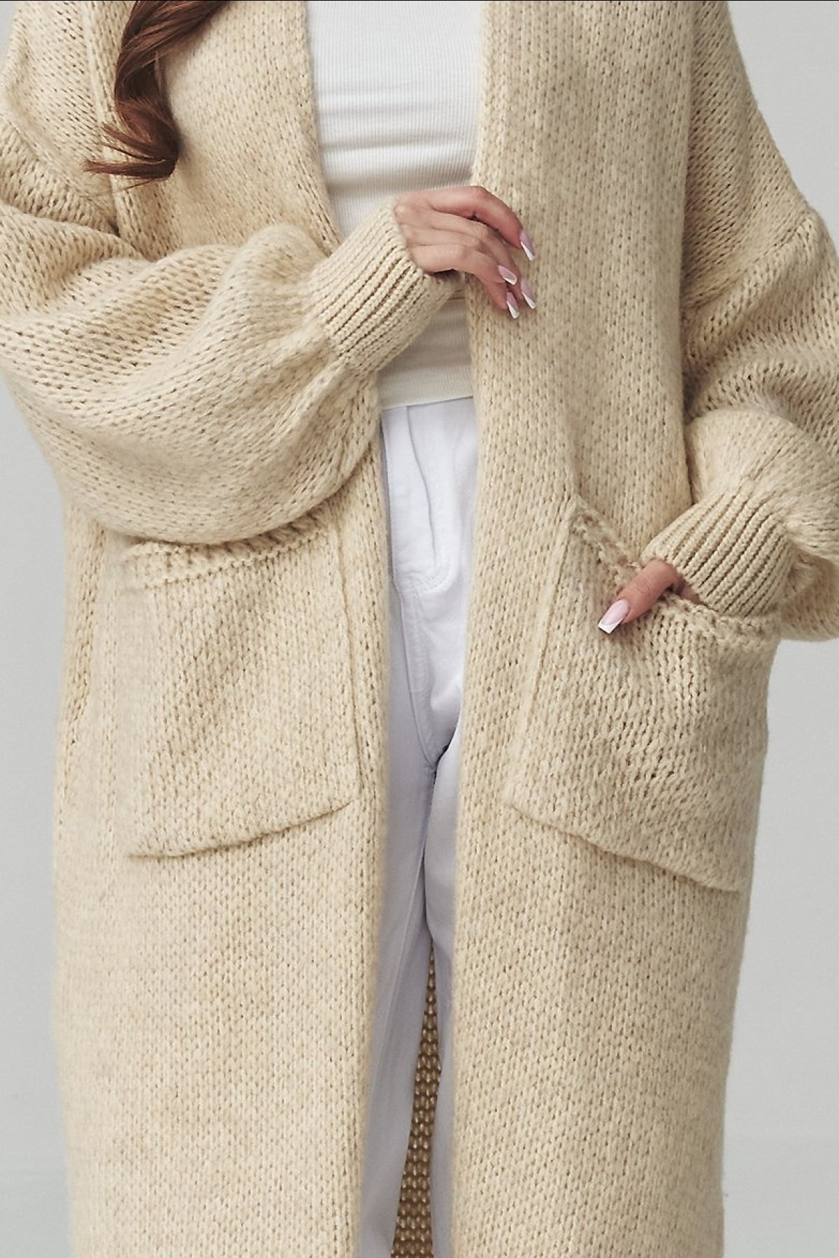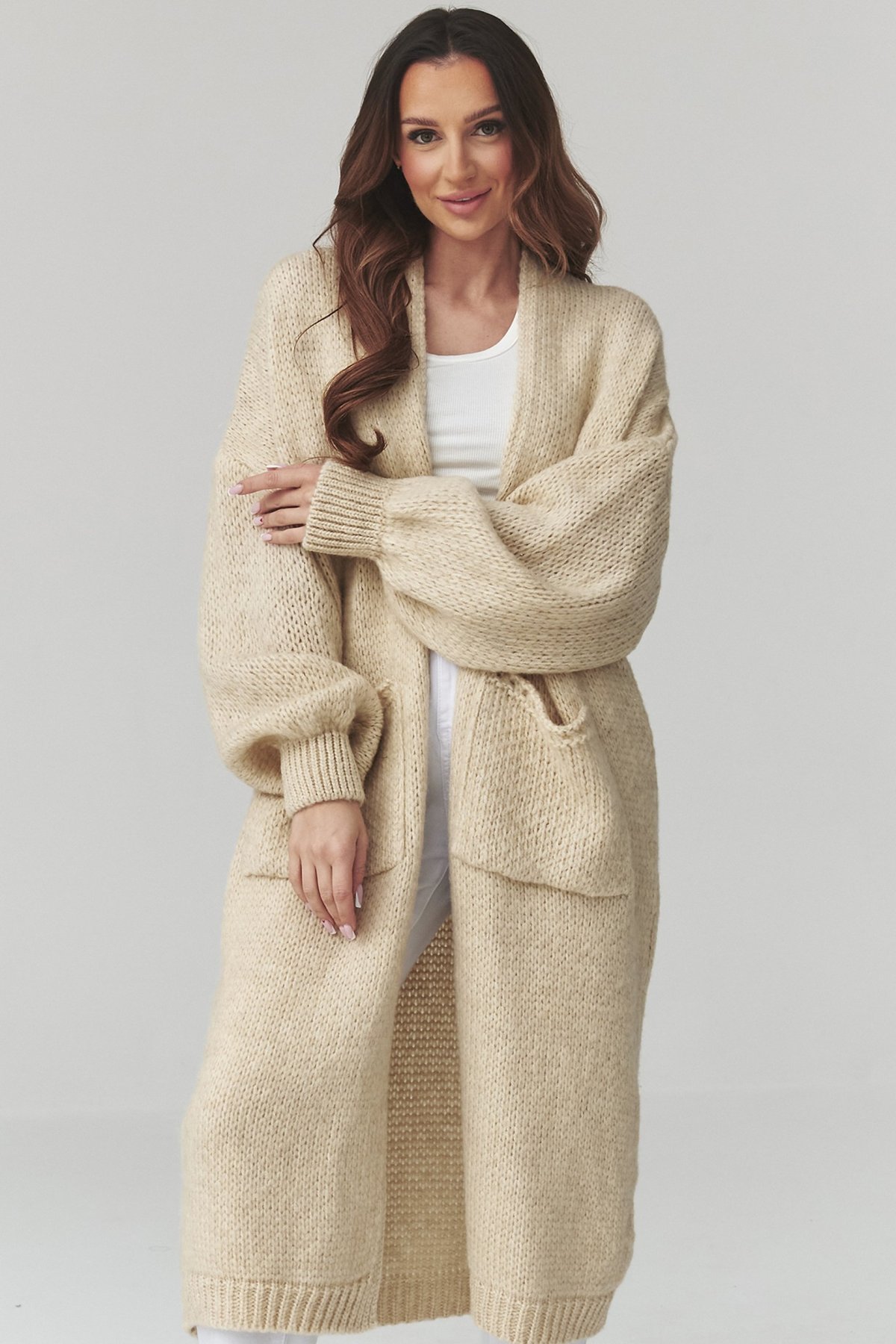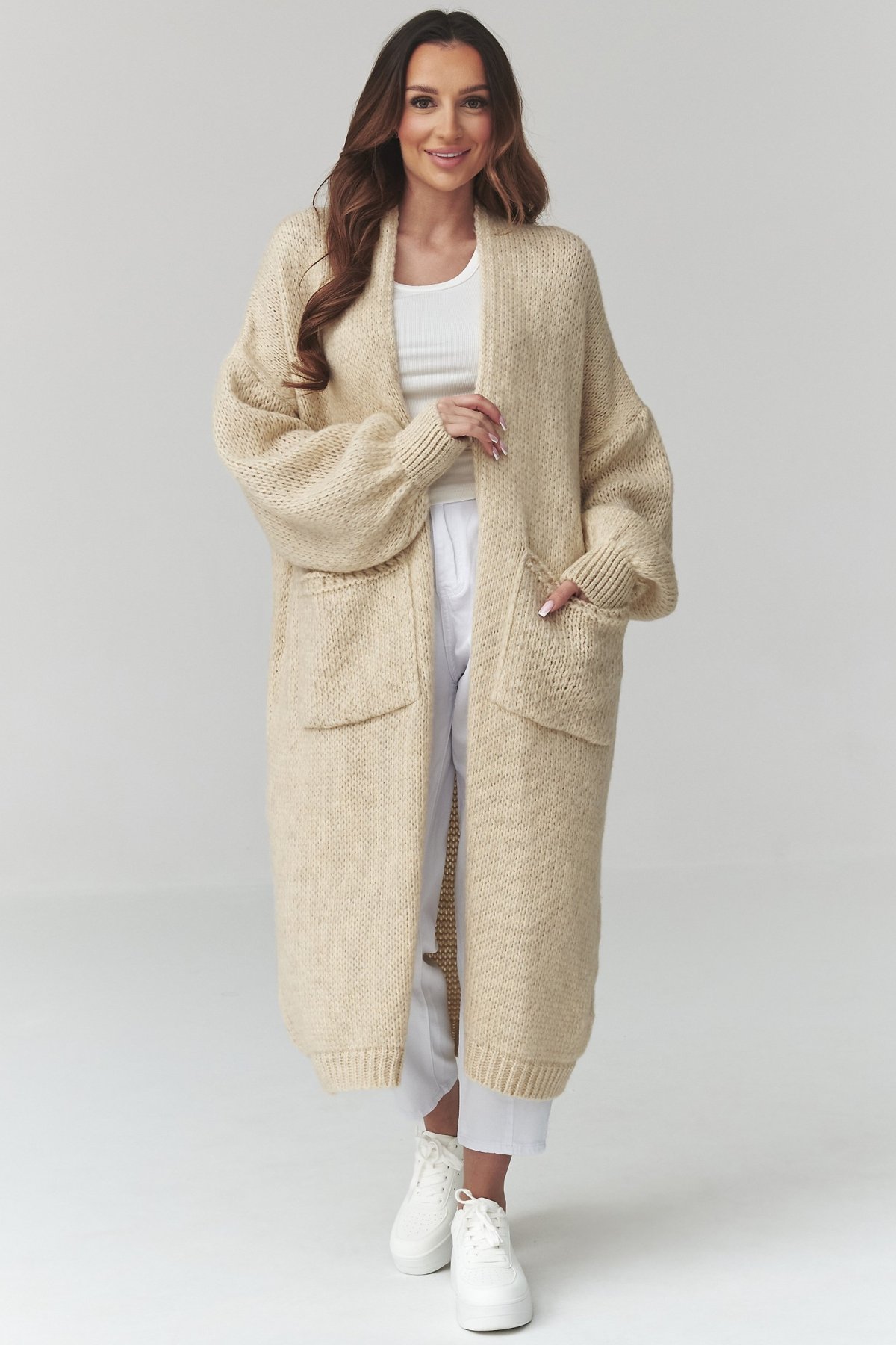 Dlouhý kardigan světle béžové barvy s kapsami je kousek, po kterém sáhnete ve chvíli, kdy chcete pohodlí i upravený vzhled.