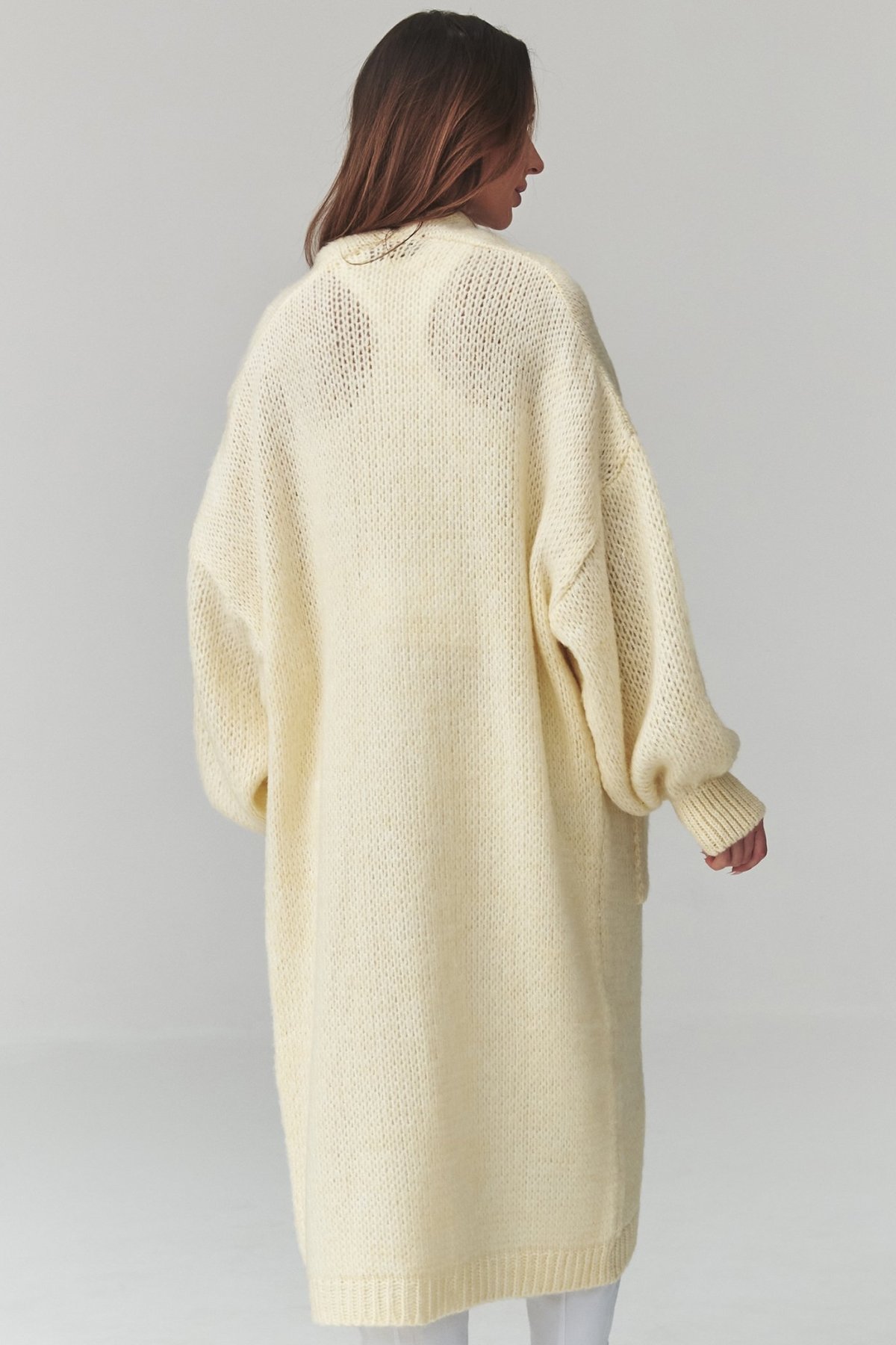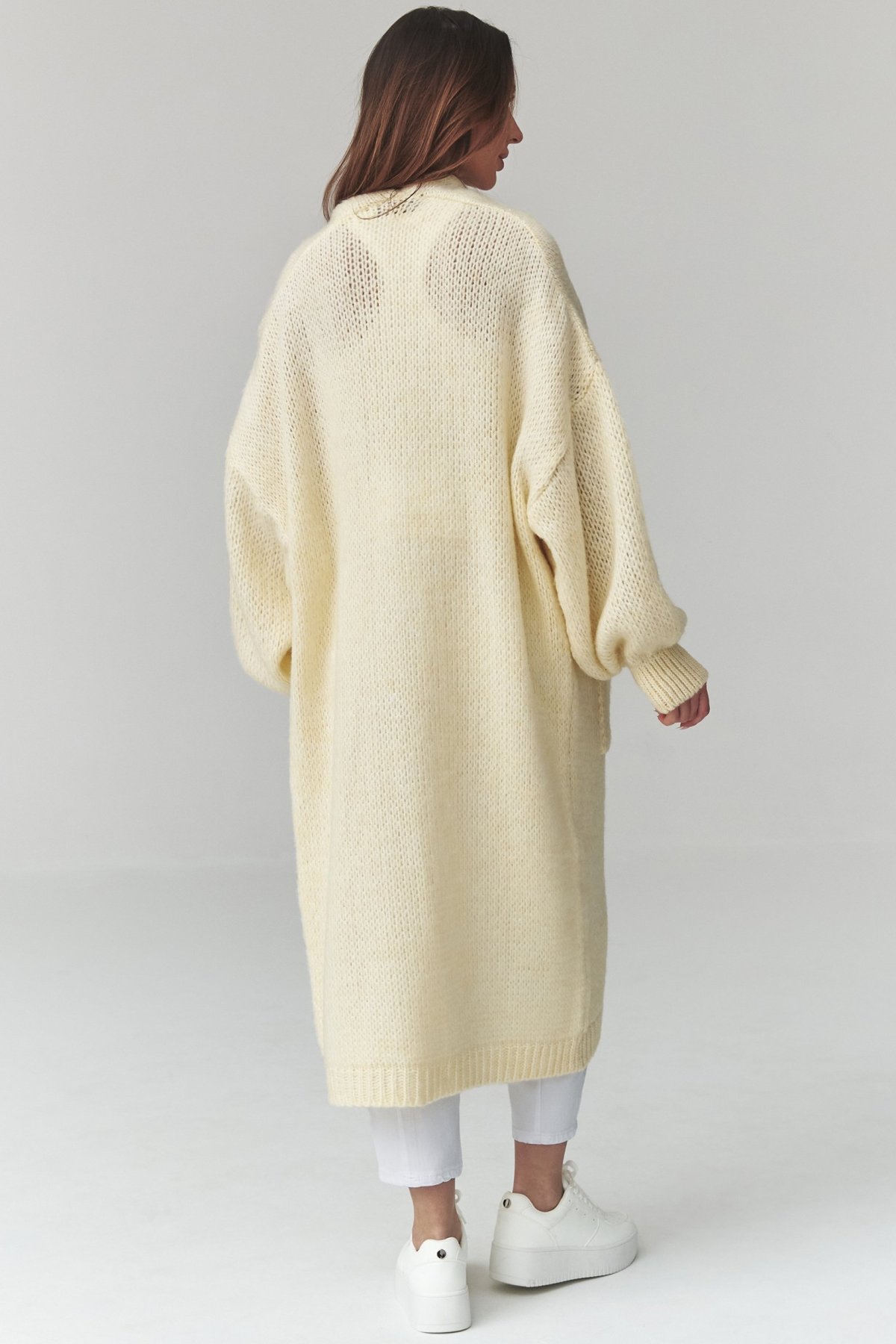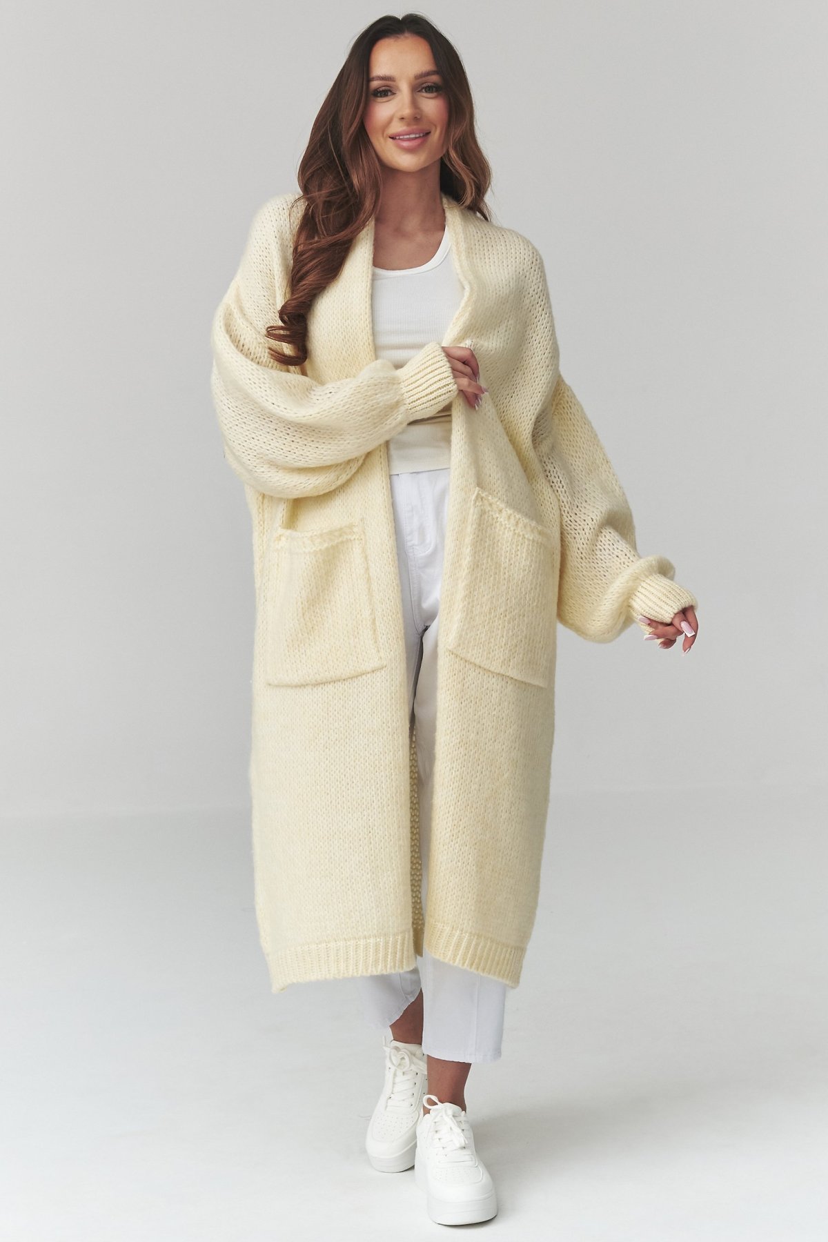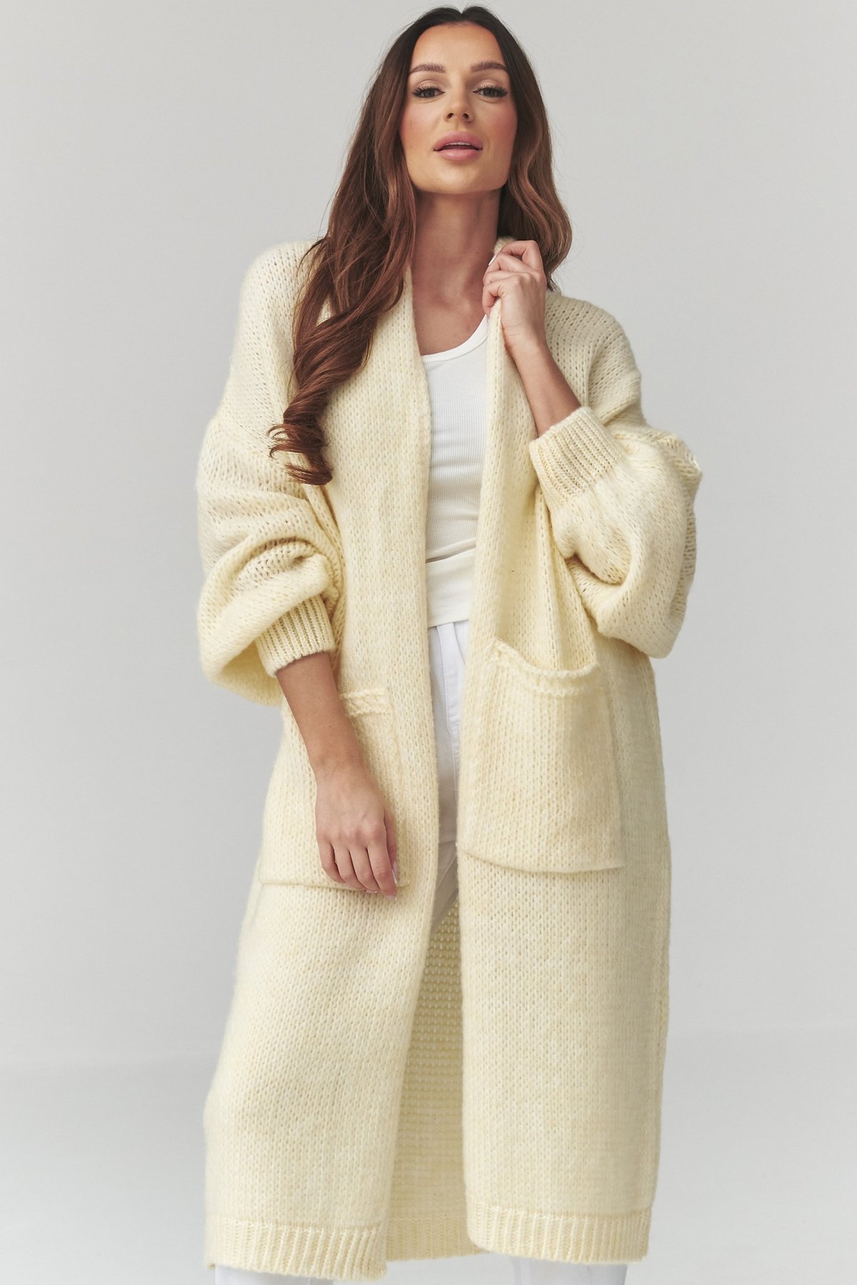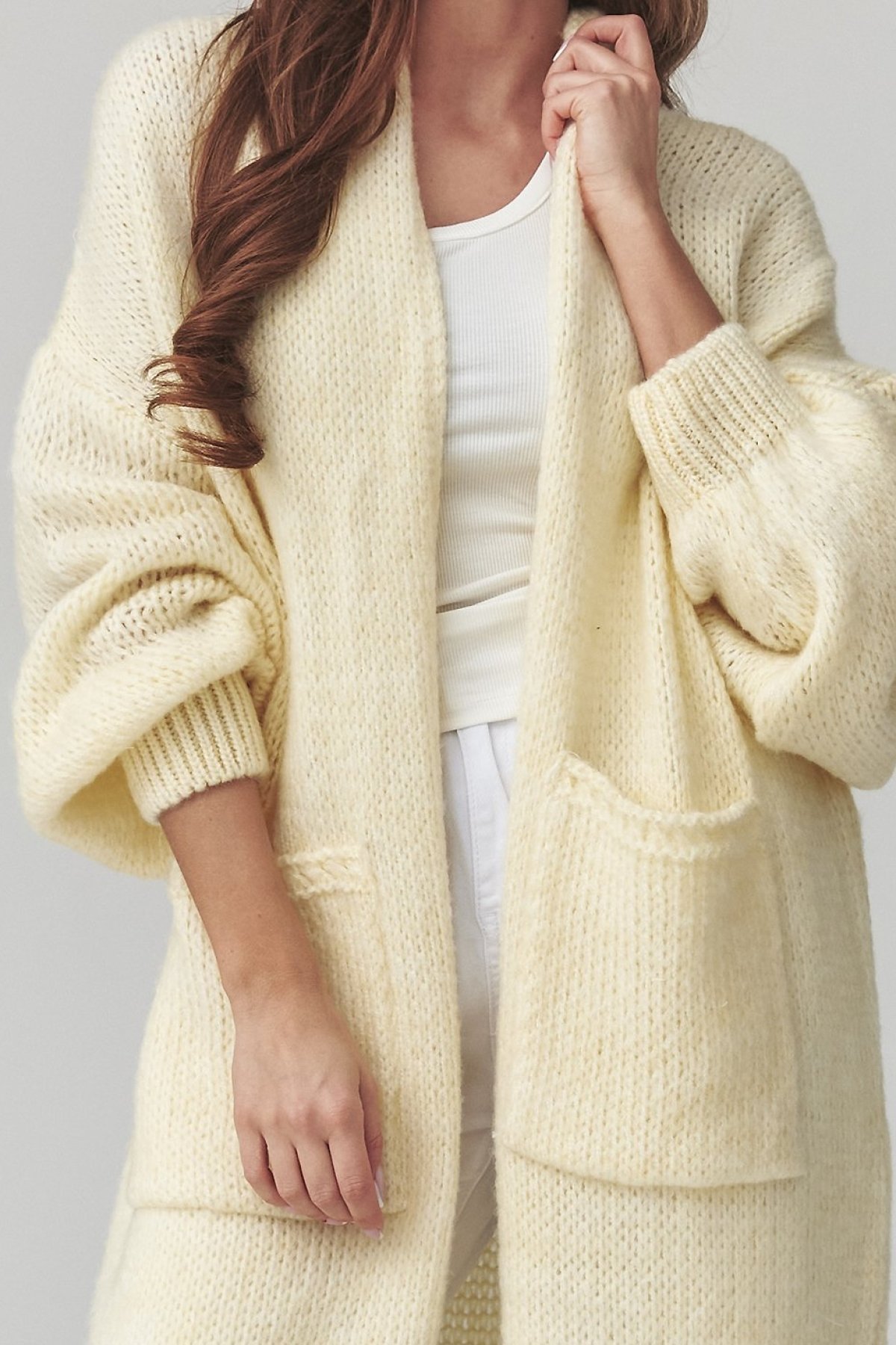 Dlouhý kardigan světle žluté barvy s kapsami je kousek, po kterém sáhnete ve chvíli, kdy chcete pohodlí i upravený vzhled.