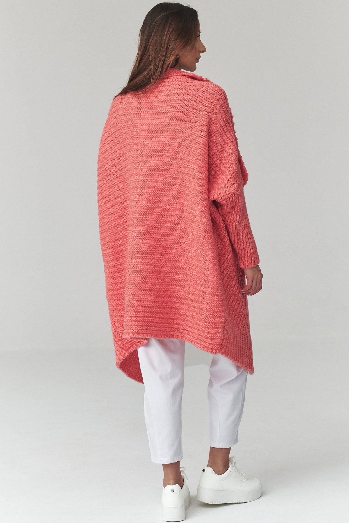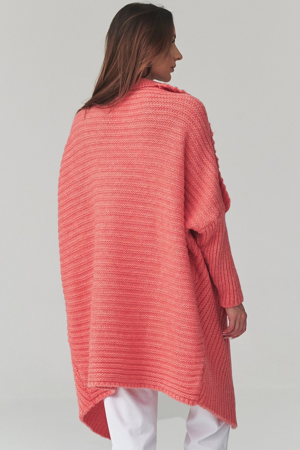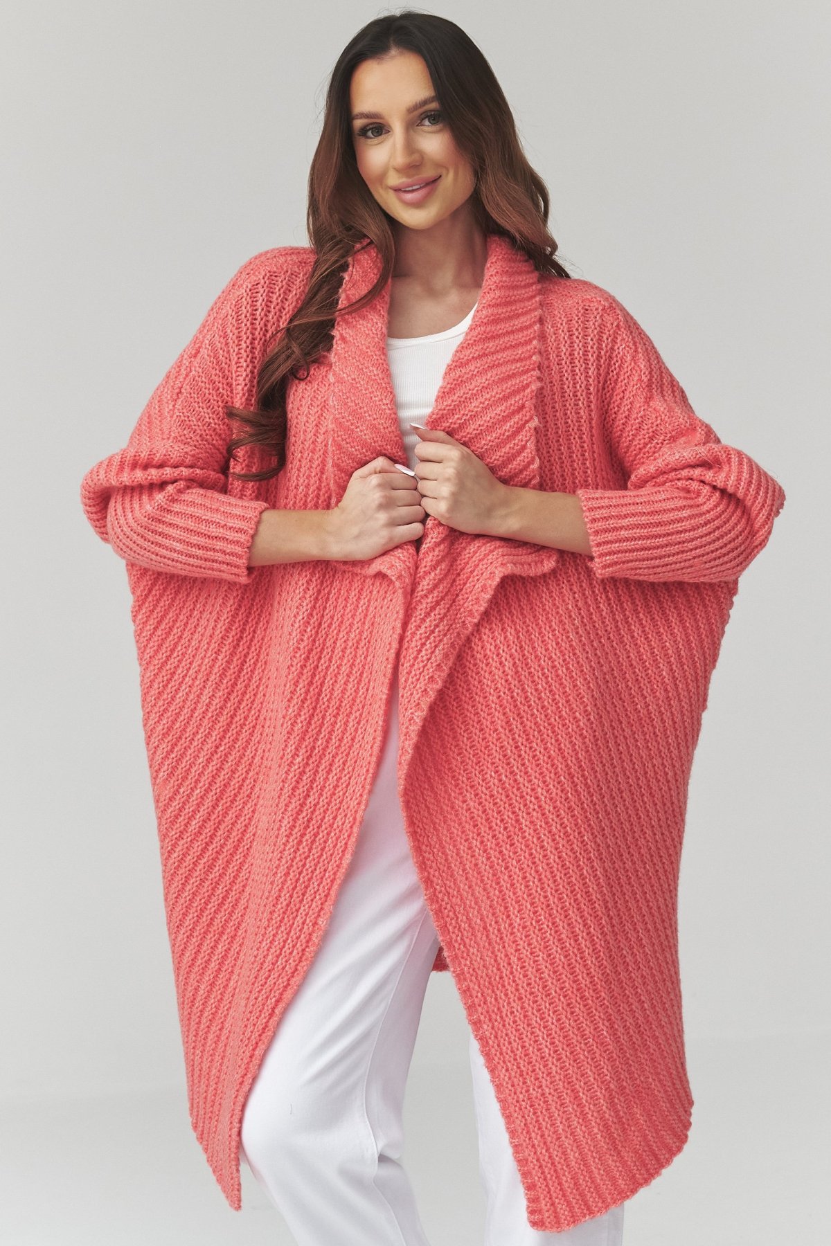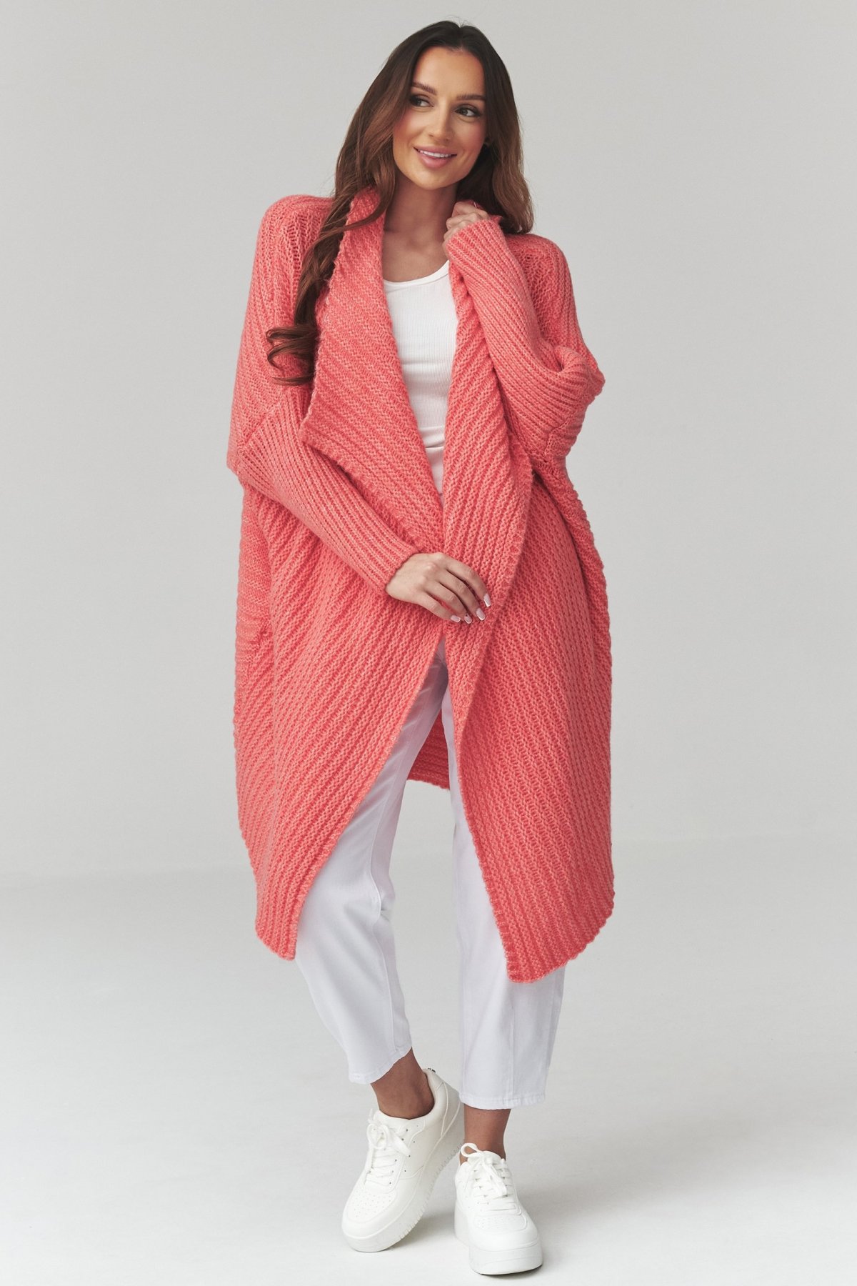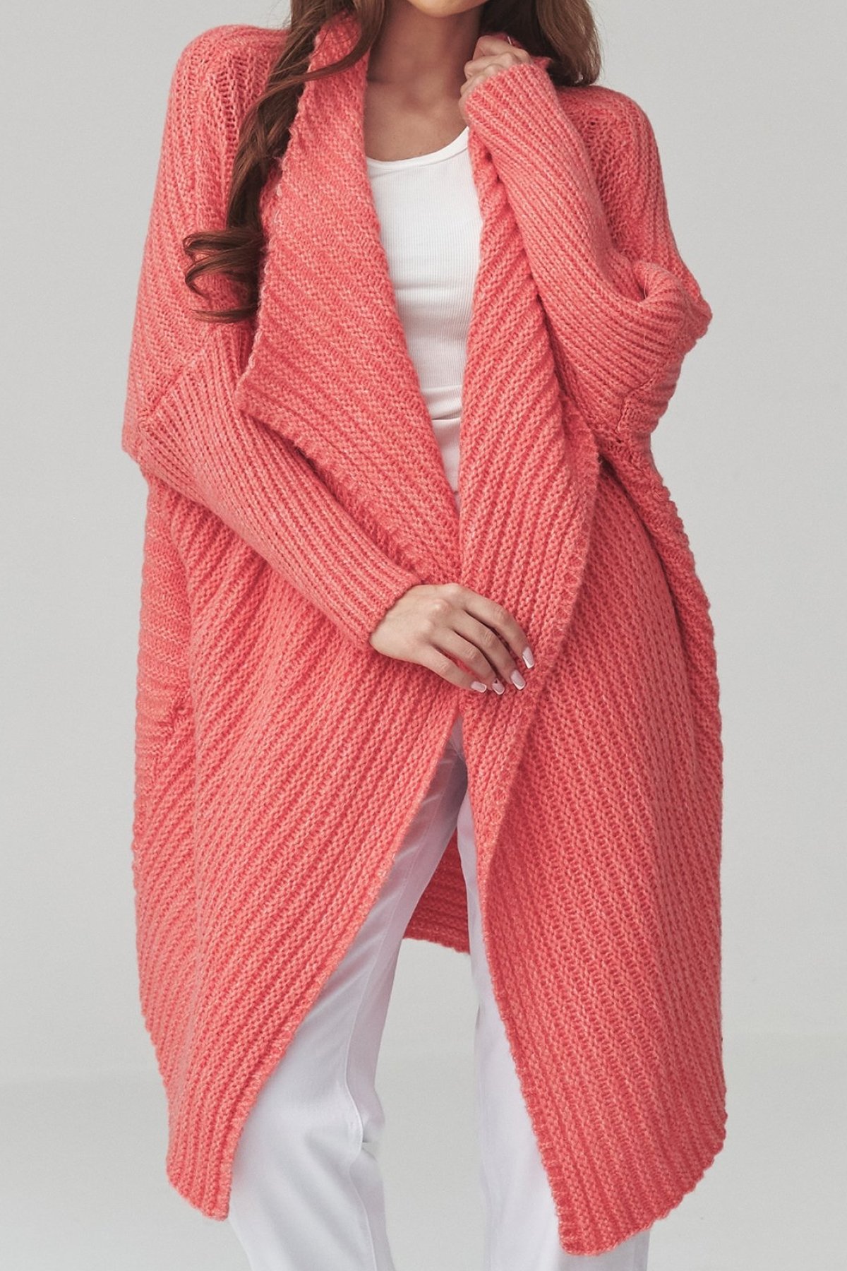 Dlouhý dámský kardigan korálové barvy. Kousek, který spojuje pohodlí s uvolněnou elegancí.