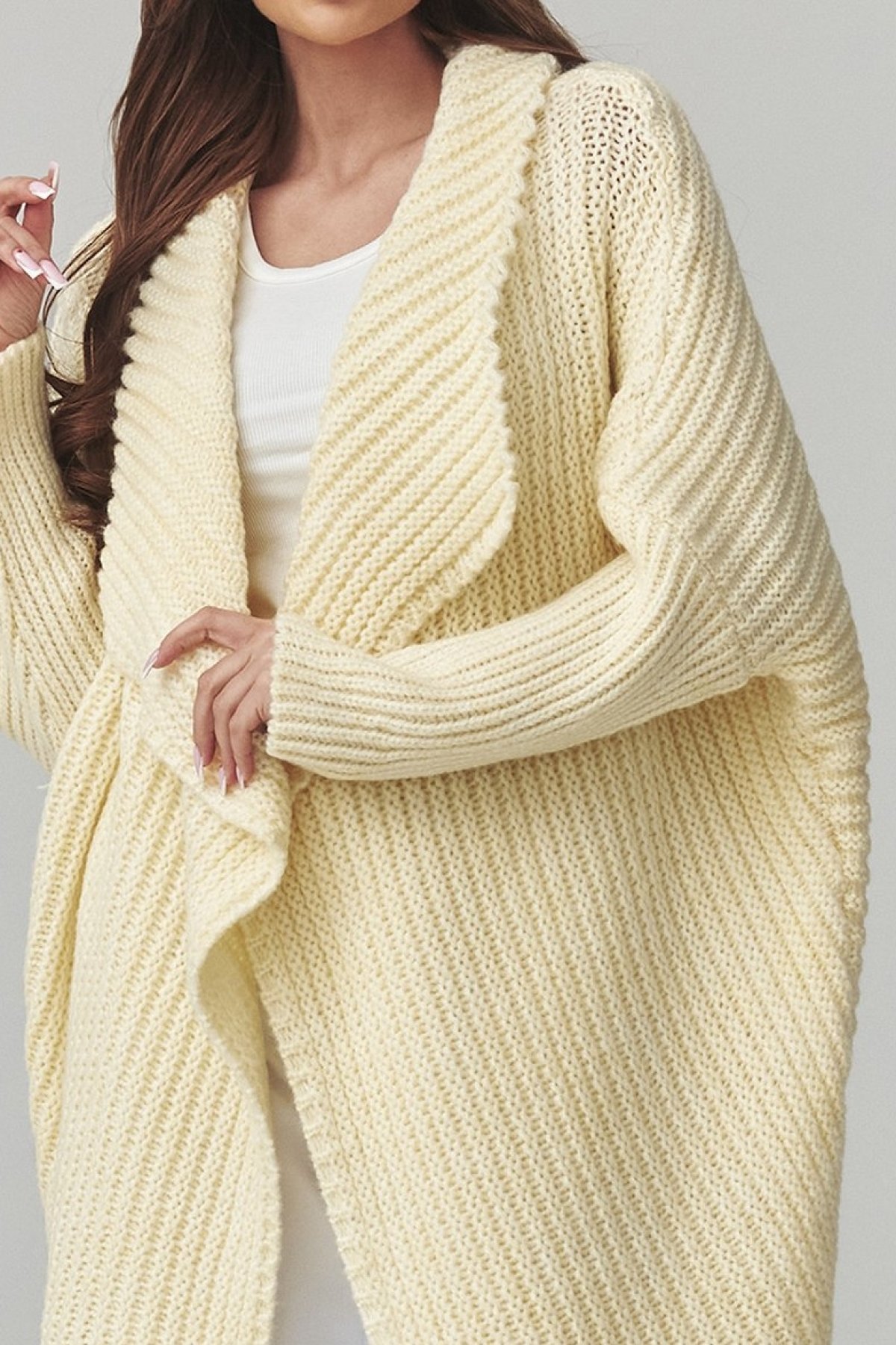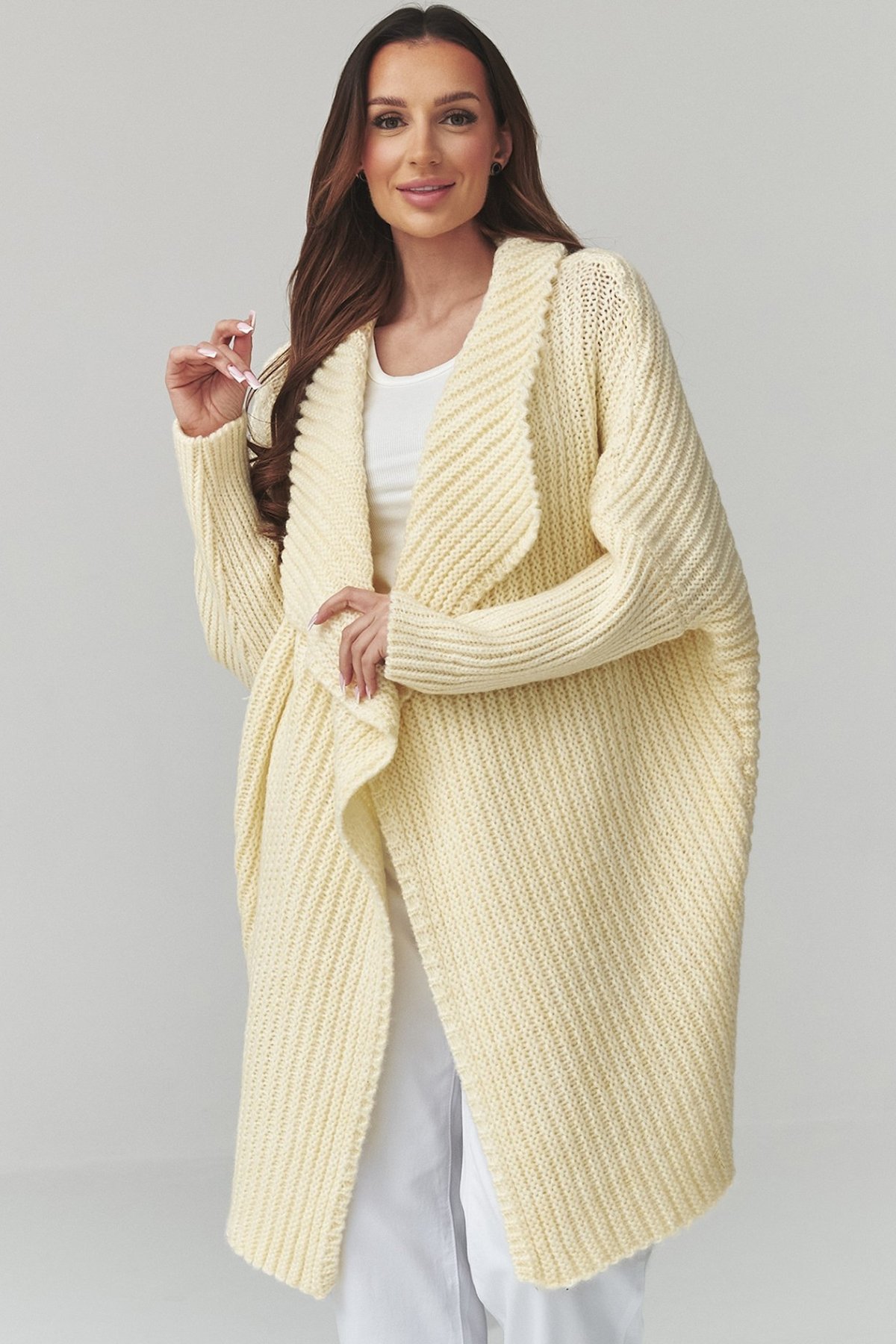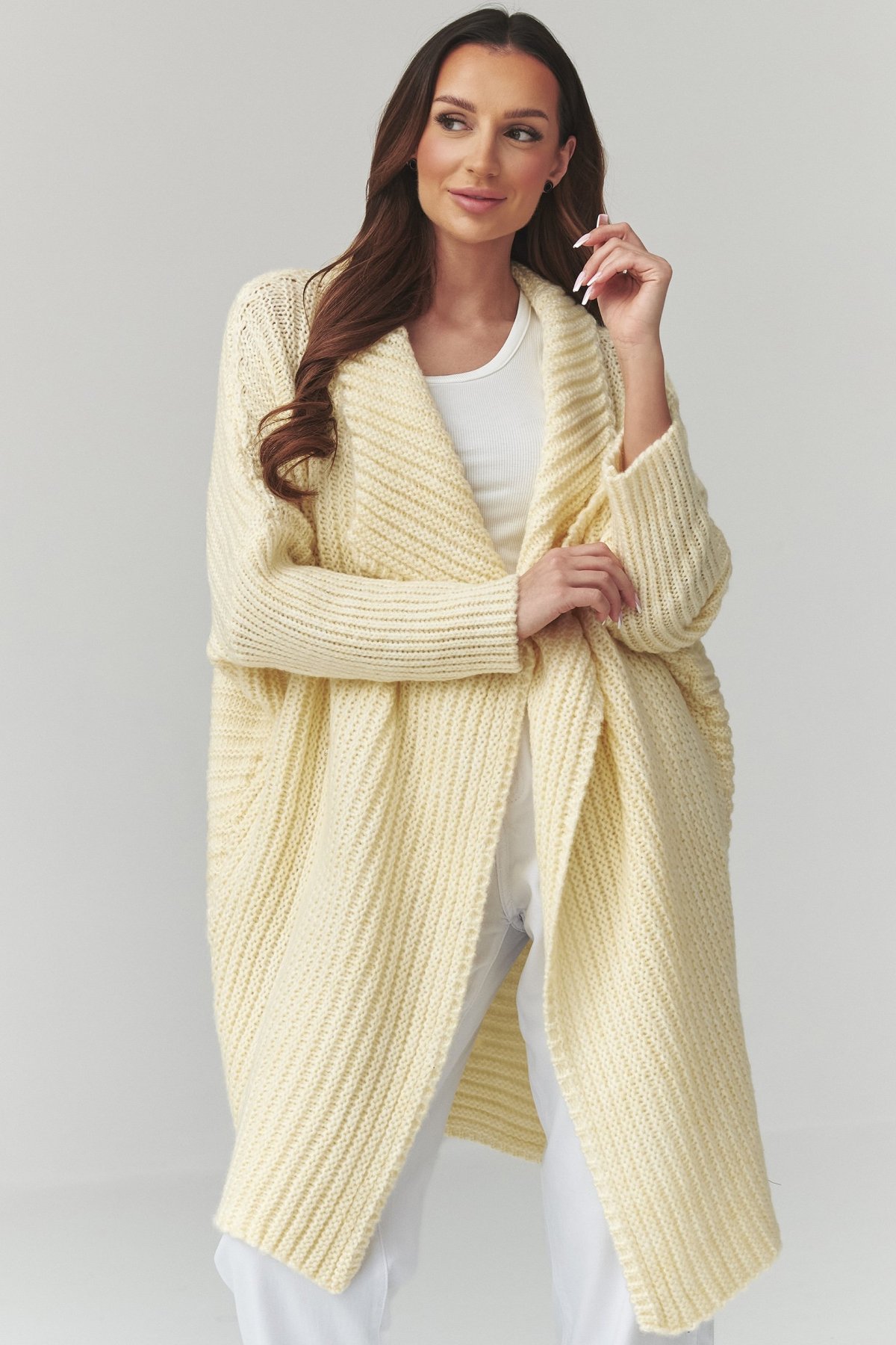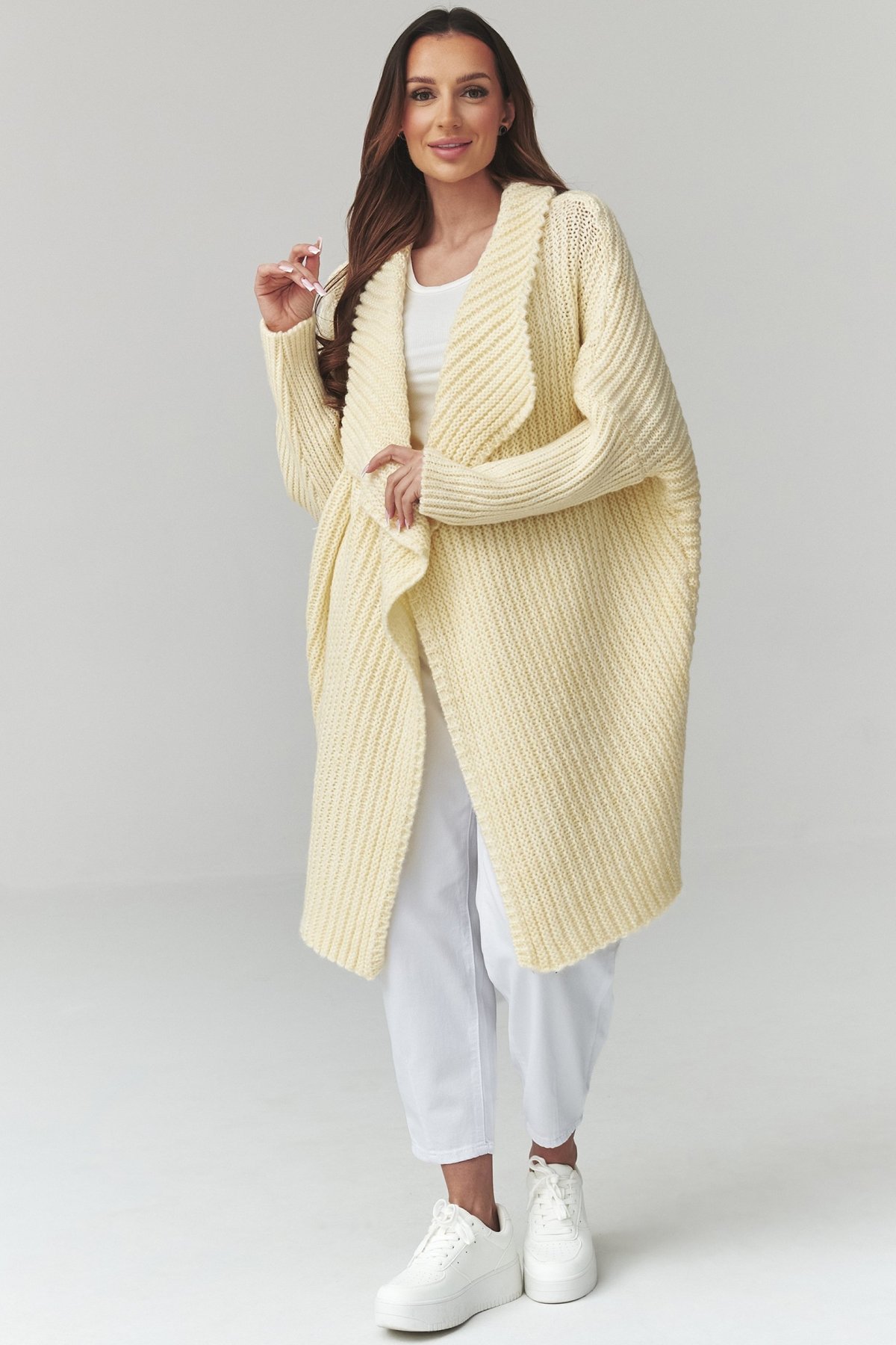 Dlouhý dámský kardigan světle žluté barvy. Kousek, který spojuje pohodlí s uvolněnou elegancí.