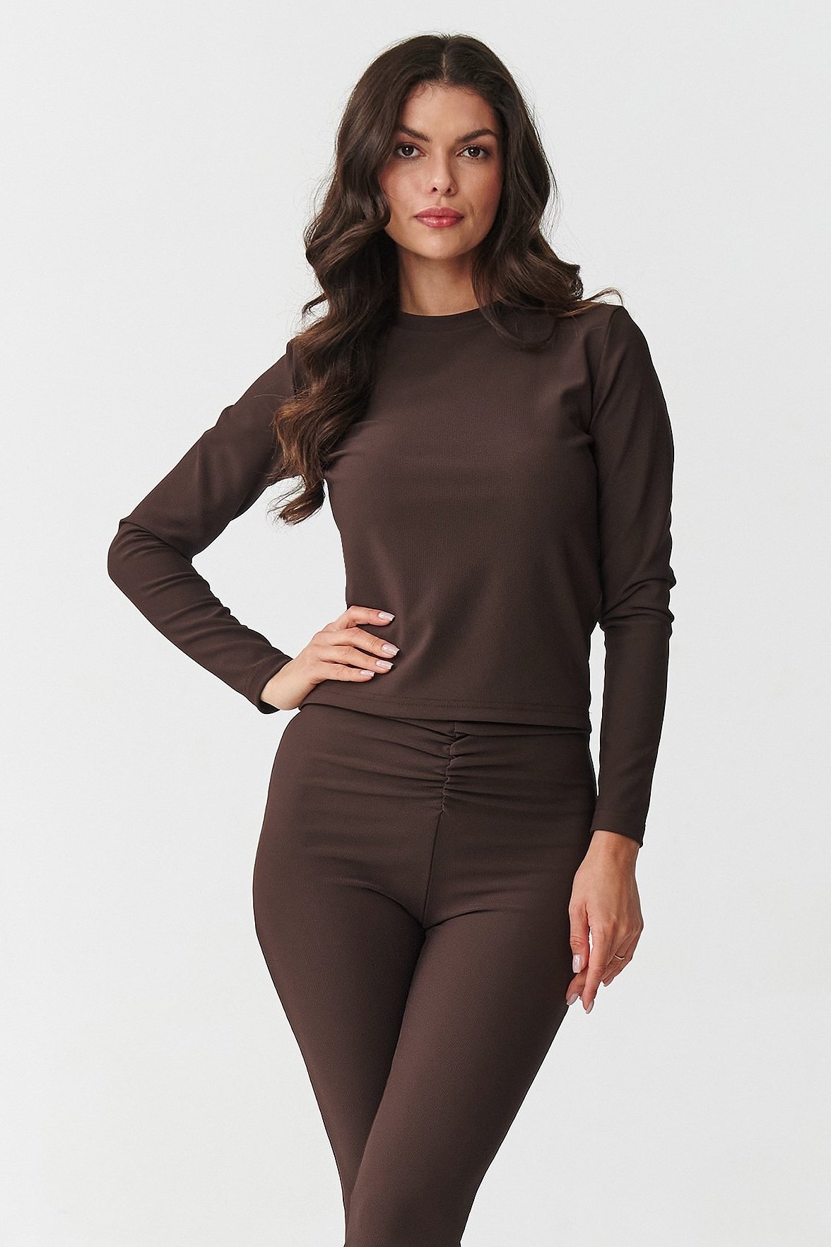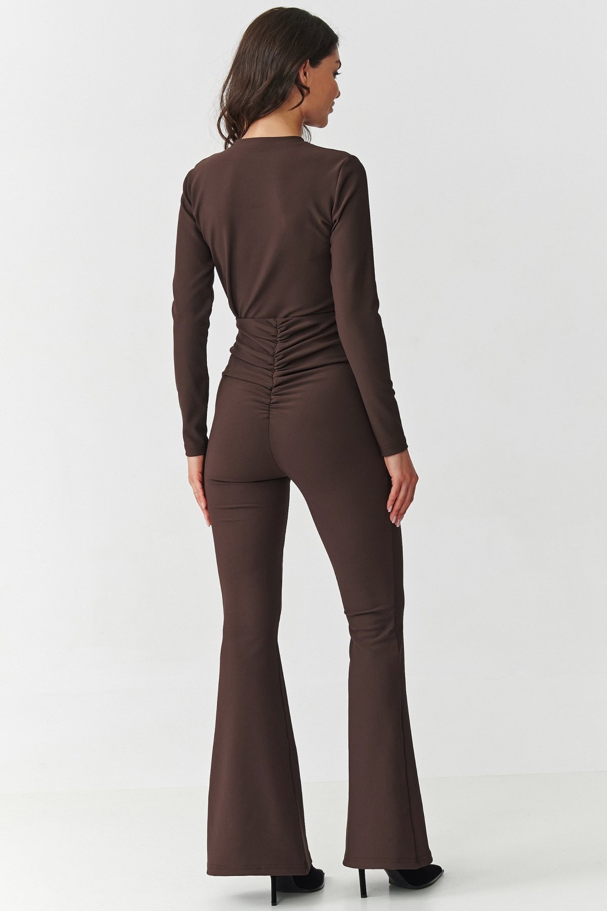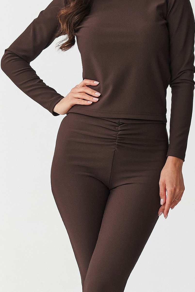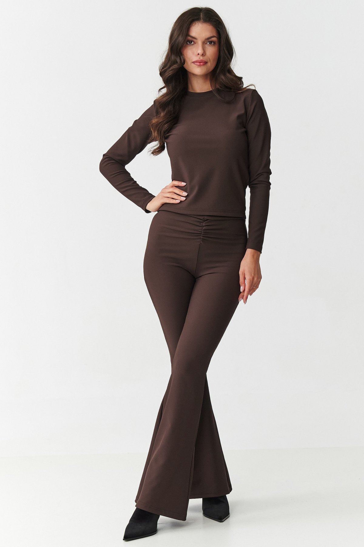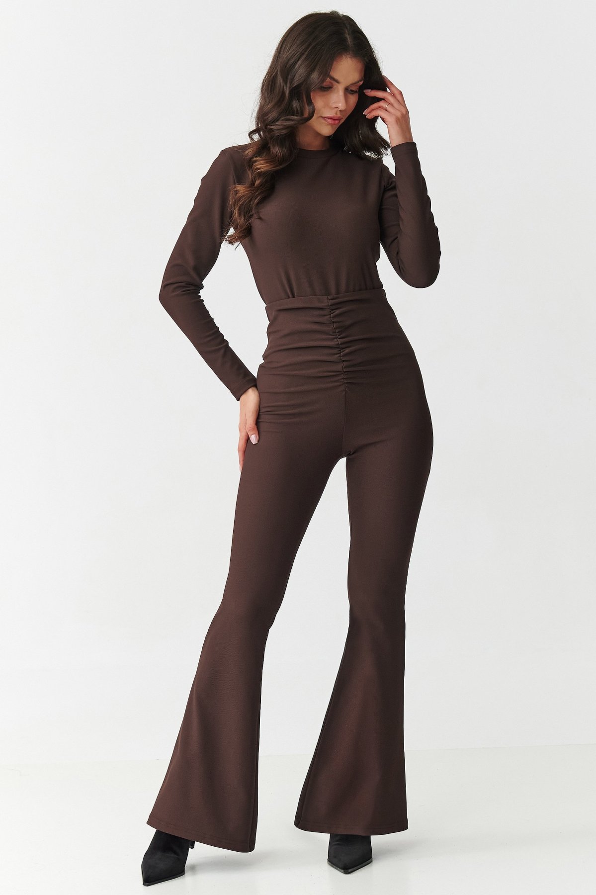 Vsaďte na vzhled, který spojuje eleganci a pohodlí! Tento jedinečný dámský komplet se skládá z přiléhavé halenky s dlouhým rukávem a kalhot s vysokým pasem a rozšířenými nohavicemi. Je vyroben z vysoce kvalitního žebrovaného materiálu, který krásně zdůrazňuje postavu a zajišťuje pohodlí po celý den. Halenka má klasický střih s uzavřeným výstřihem a zapíná se vzadu na zip, což ji dělá pohodlnou a zároveň velmi elegantní. Kalhoty s vysokým pasem zdůrazňují pas a modelují postavu, a díky řasení v pase dodávají postavě správný tvar, zatímco rozšířené nohavice typu flare opticky prodlužují nohy. K dispozici ve čtyřech nadčasových barvách: bordó – ženská a smyslná, černá – klasika, která se hodí ke všemu, čokoládová – moderní a výrazná, béžová – elegantní a jemná. Jedná se o komplet, který se hodí pro různé příležitosti – od večerních setkání přes slavnostní události až po obchodní schůzky. Stačí přidat oblíbené boty na podpatku a šperky a vytvoříte efektní a moderní look.