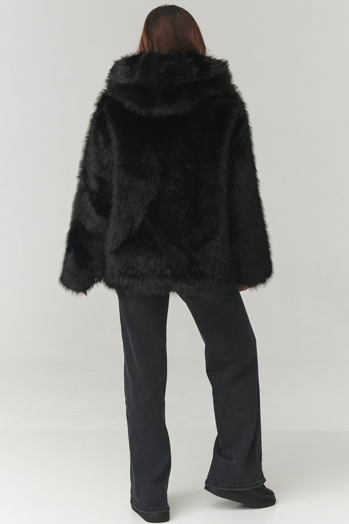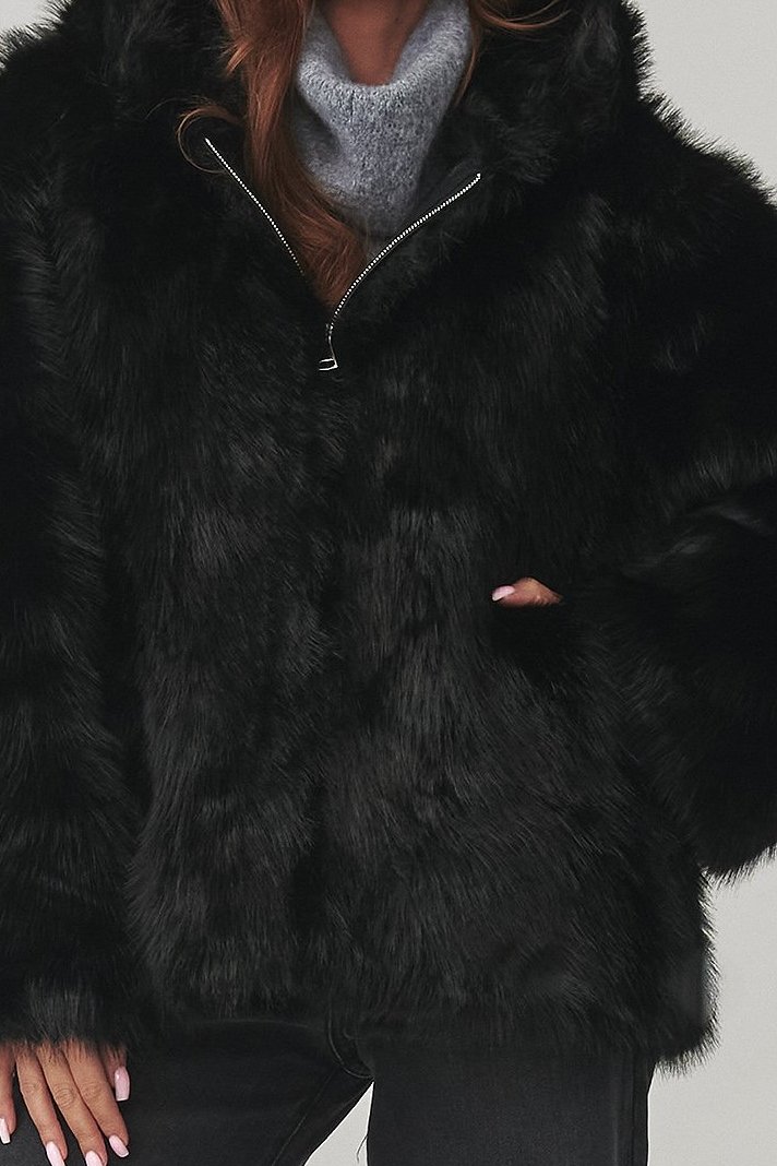 Dámský umělý kožíšek s kapucí v univerzální černé barvě. Luxusní vzhled a maximum pohodlím.