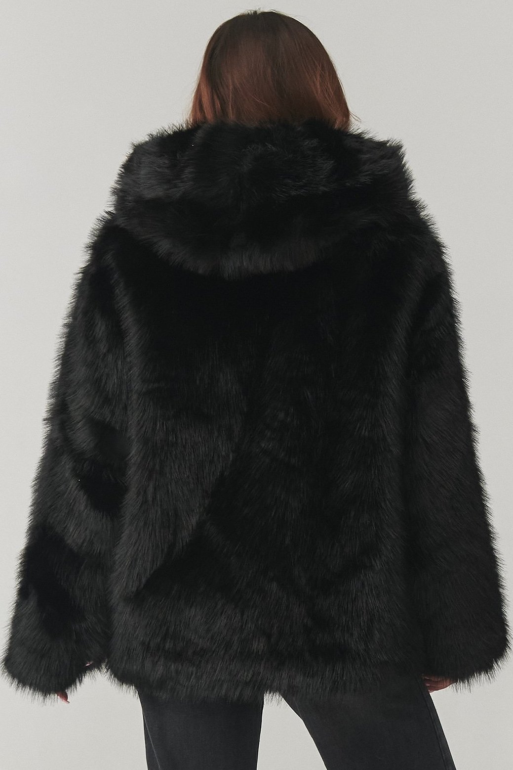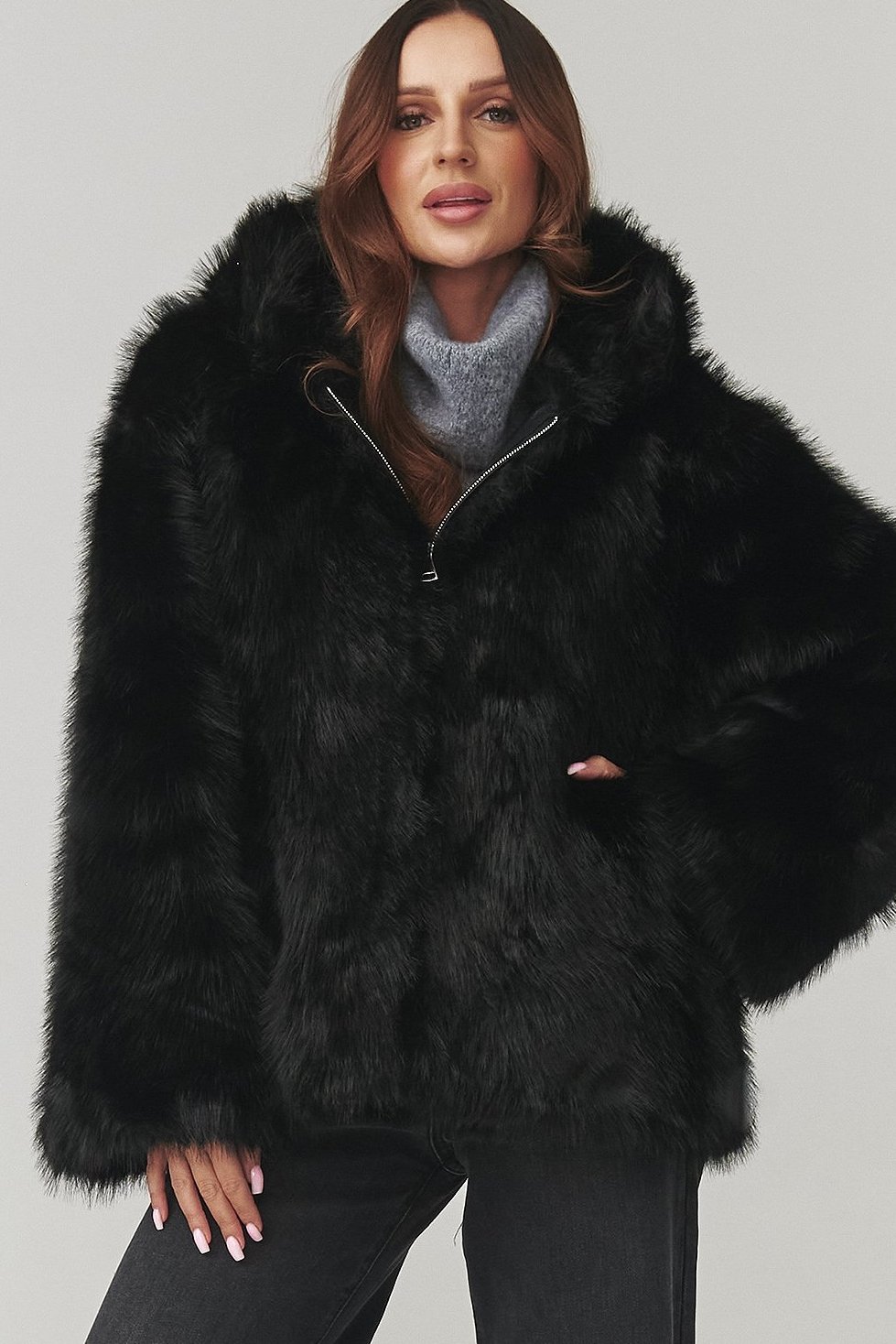 - dámský kabátek z eko kožešiny s kapucí