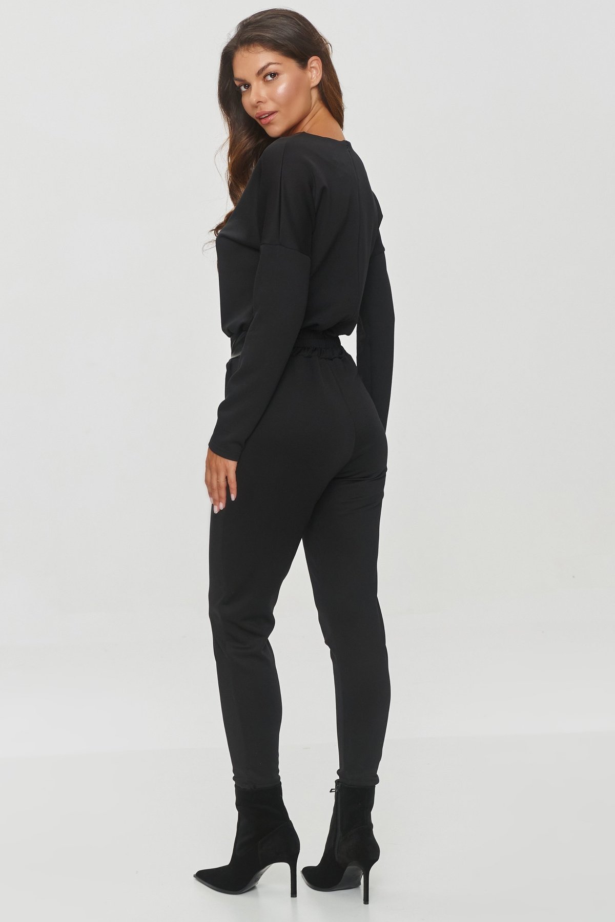 Díky měkkému, lehce pružnému materiálu je overal mimořádně pohodlný a přitom dokonale drží tvar. Dlouhé rukávy, zúžené nohavice a diskrétní zip na zádech vytvářejí elegantní linii, ideální na večerní akce, společenská setkání nebo stylové pracovní schůzky.
