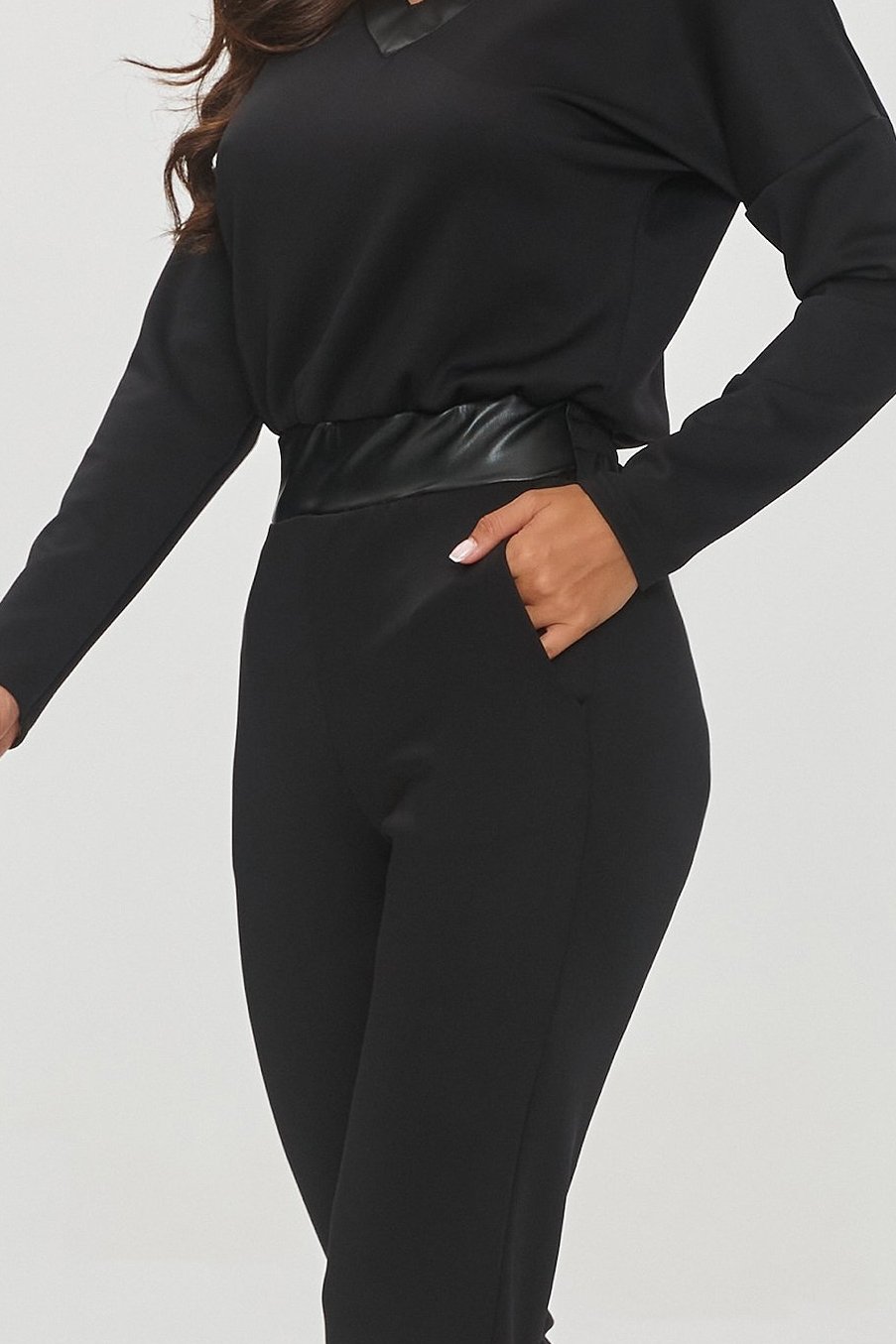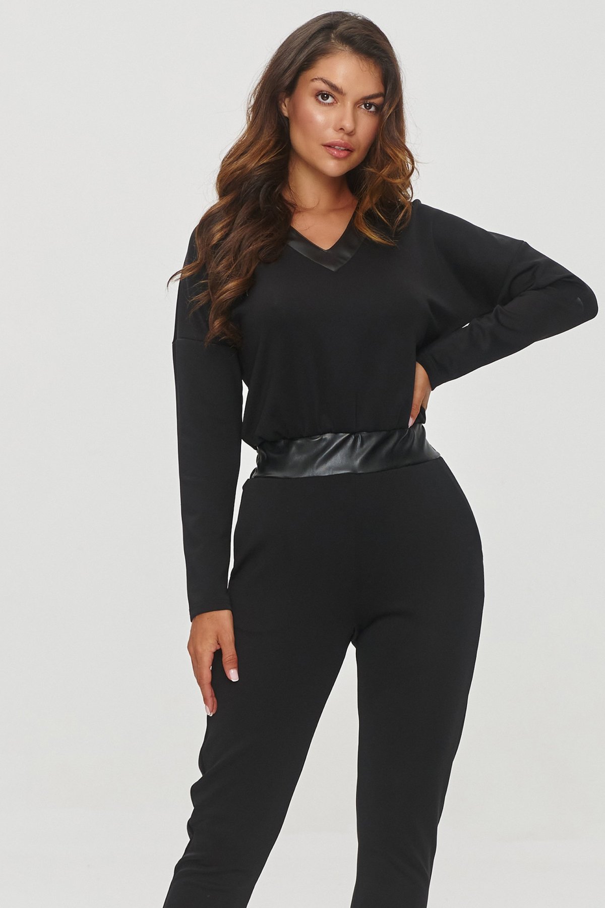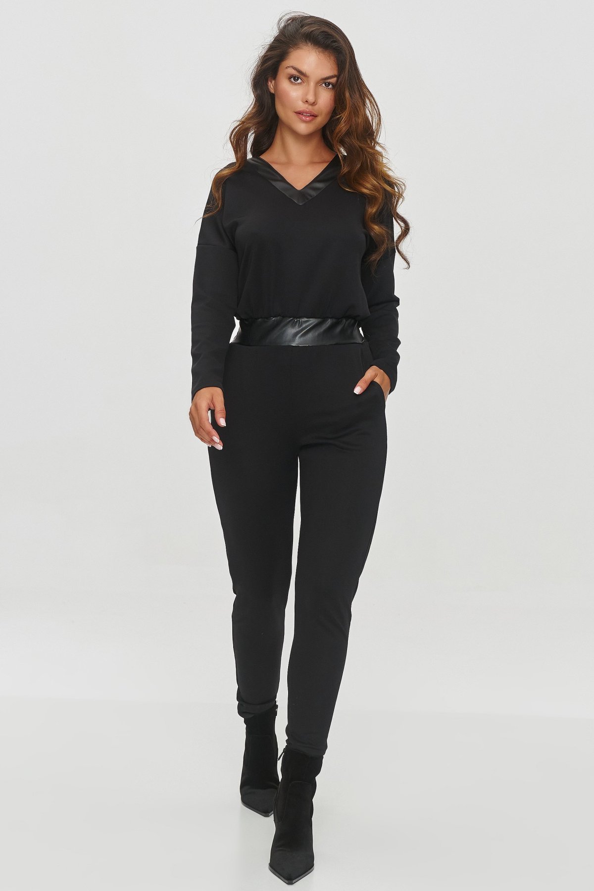 Overal Makadamia M850 je spojením elegance a moderního designu. Černé provedení působí sofistikovaně, zatímco detaily z eko-kůže dodávají celku jemný nádech luxusu. Výstřih do „V“ opticky prodlužuje krk, a pásek v pase krásně zvýrazňuje ženskou siluetu.