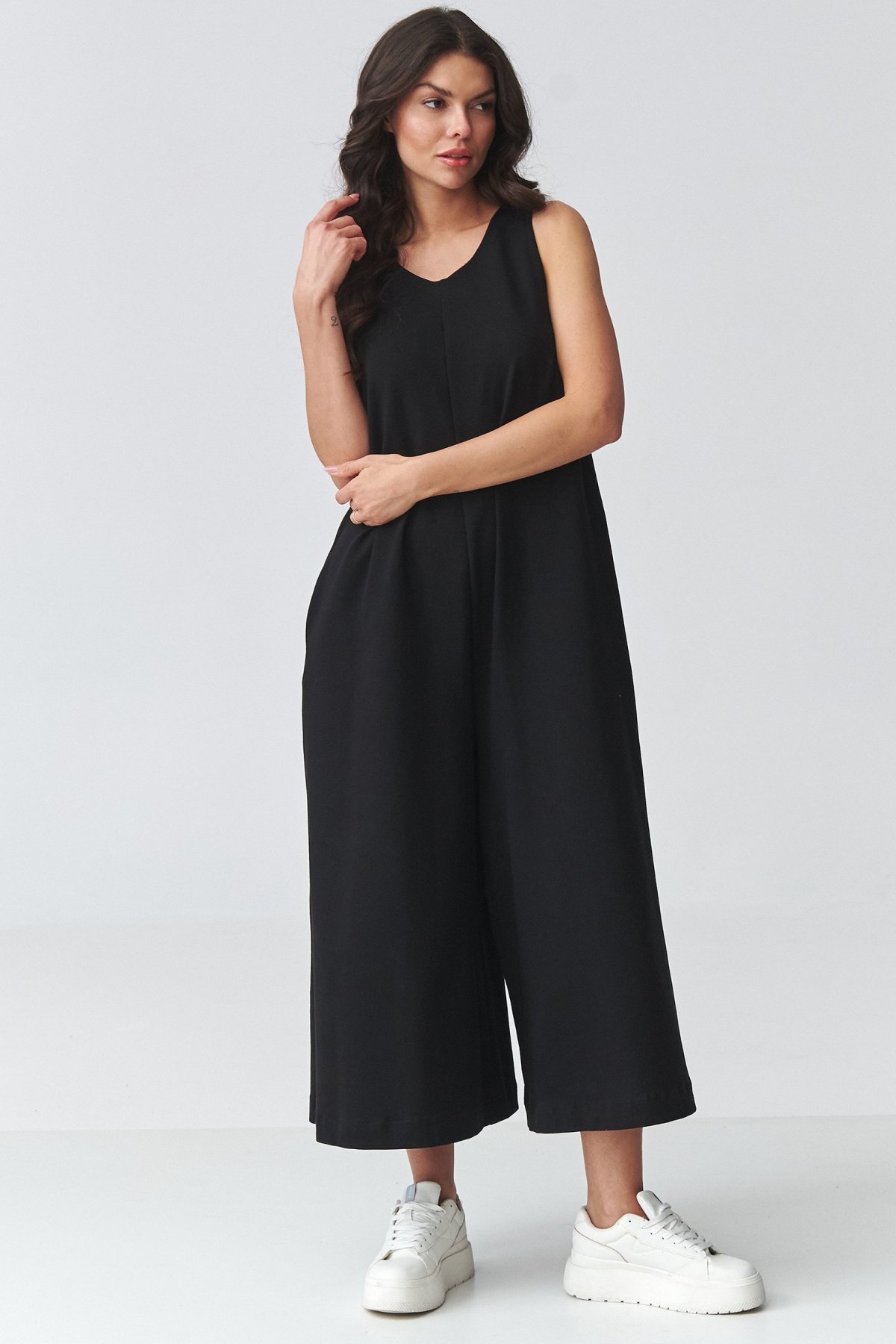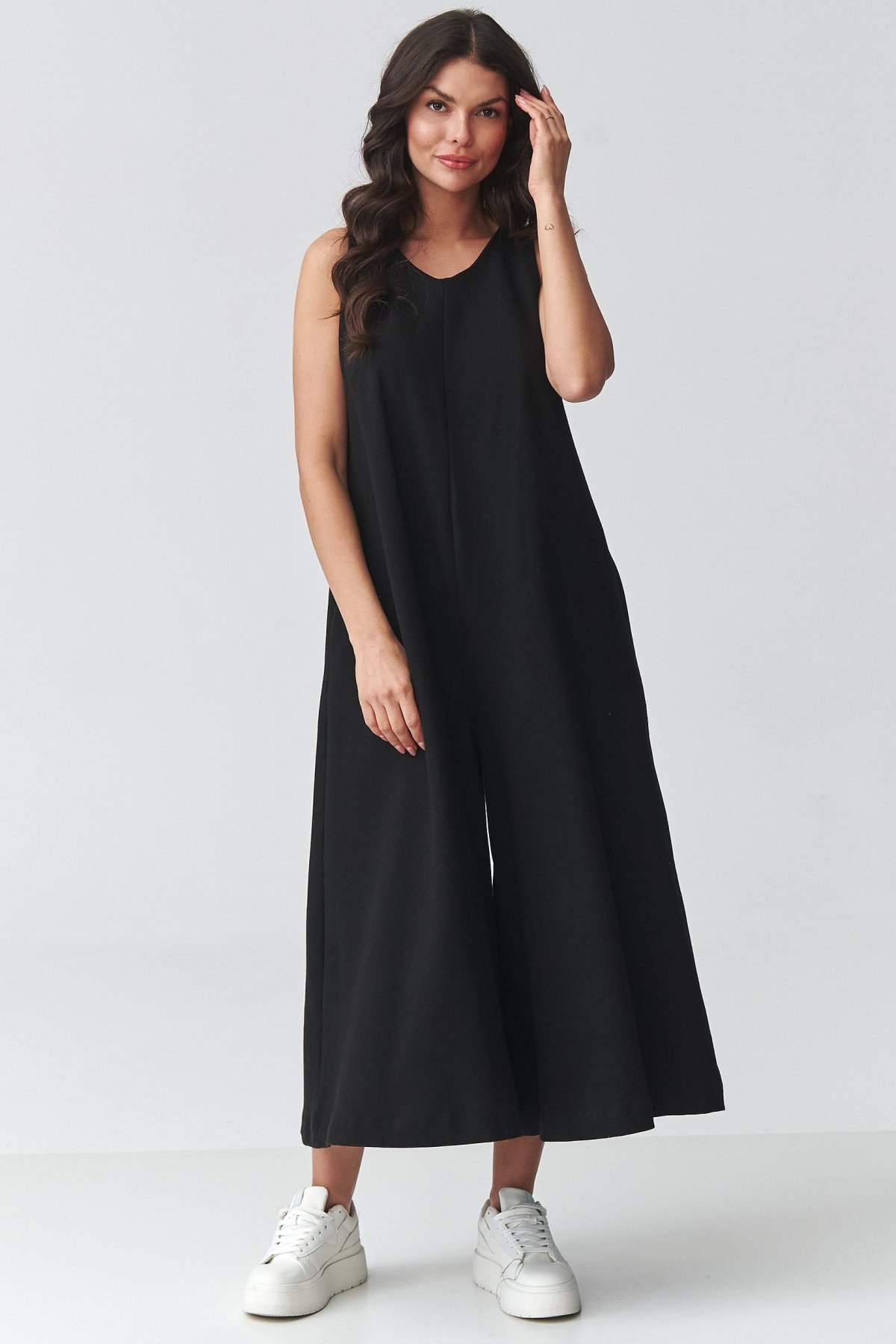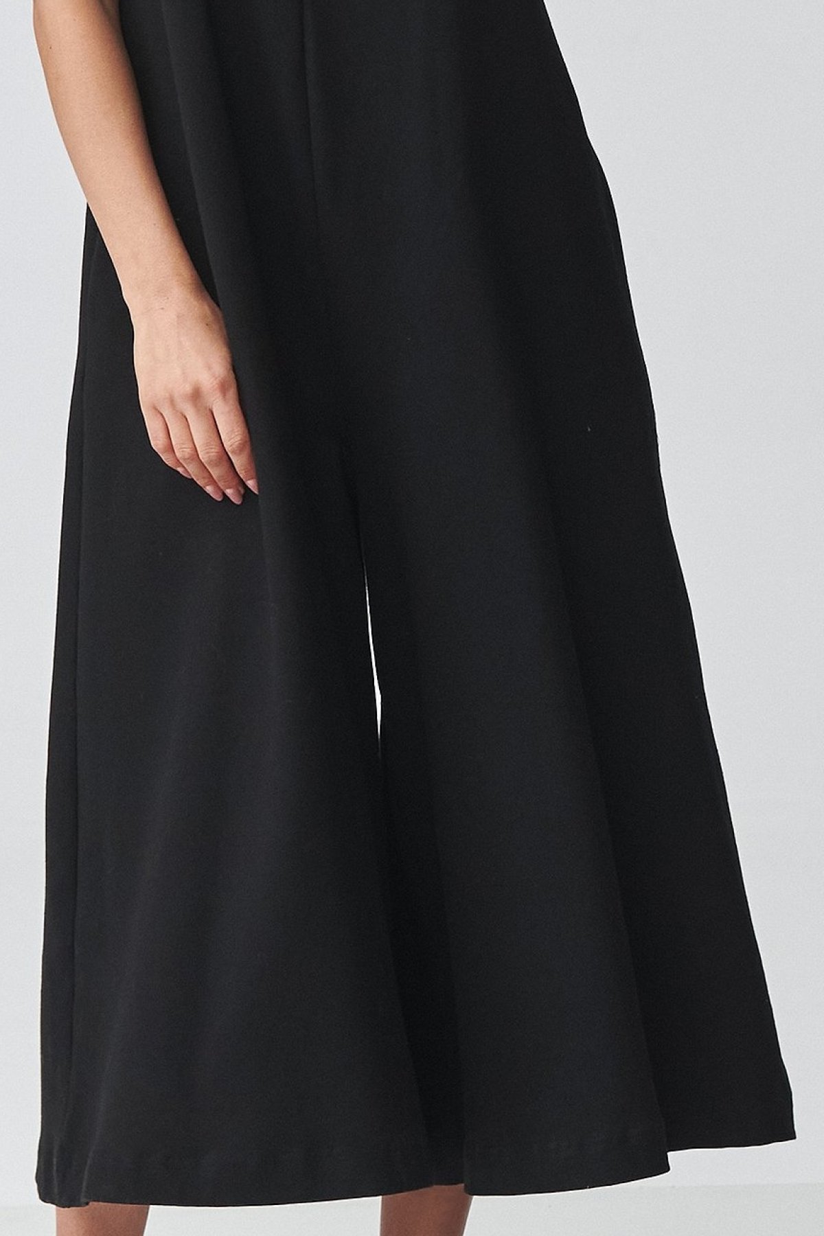 Tento černý dámský overal s širokými nohavicemi spojuje čistý vzhled, pohodlí a nadčasový styl.