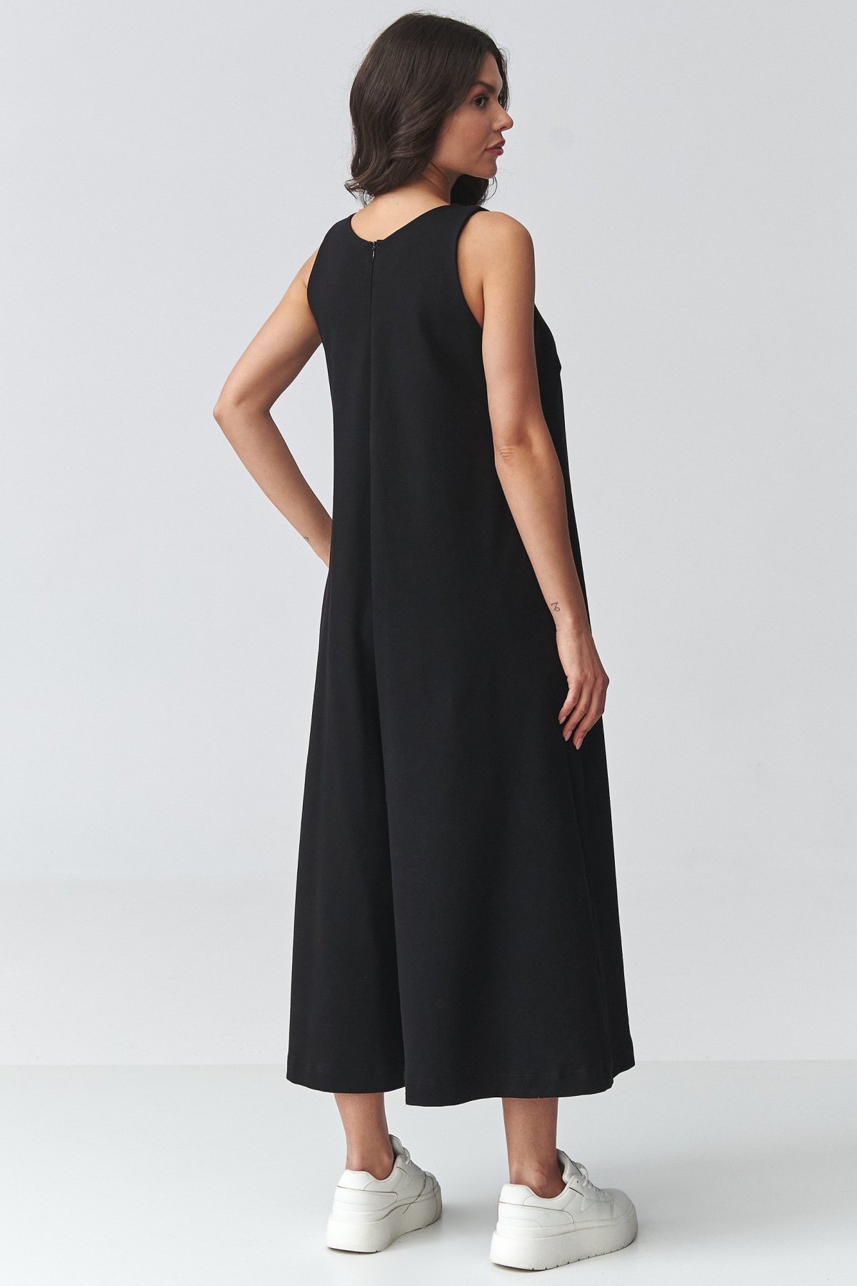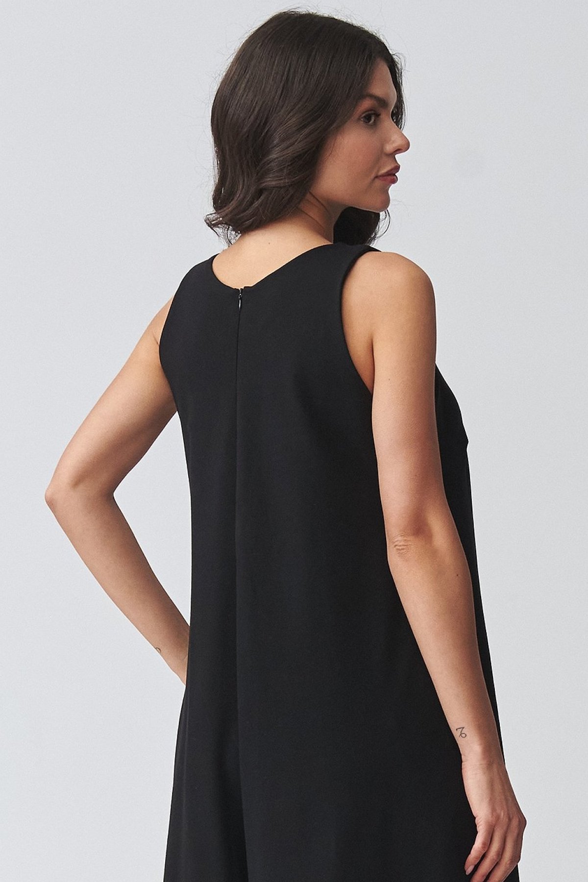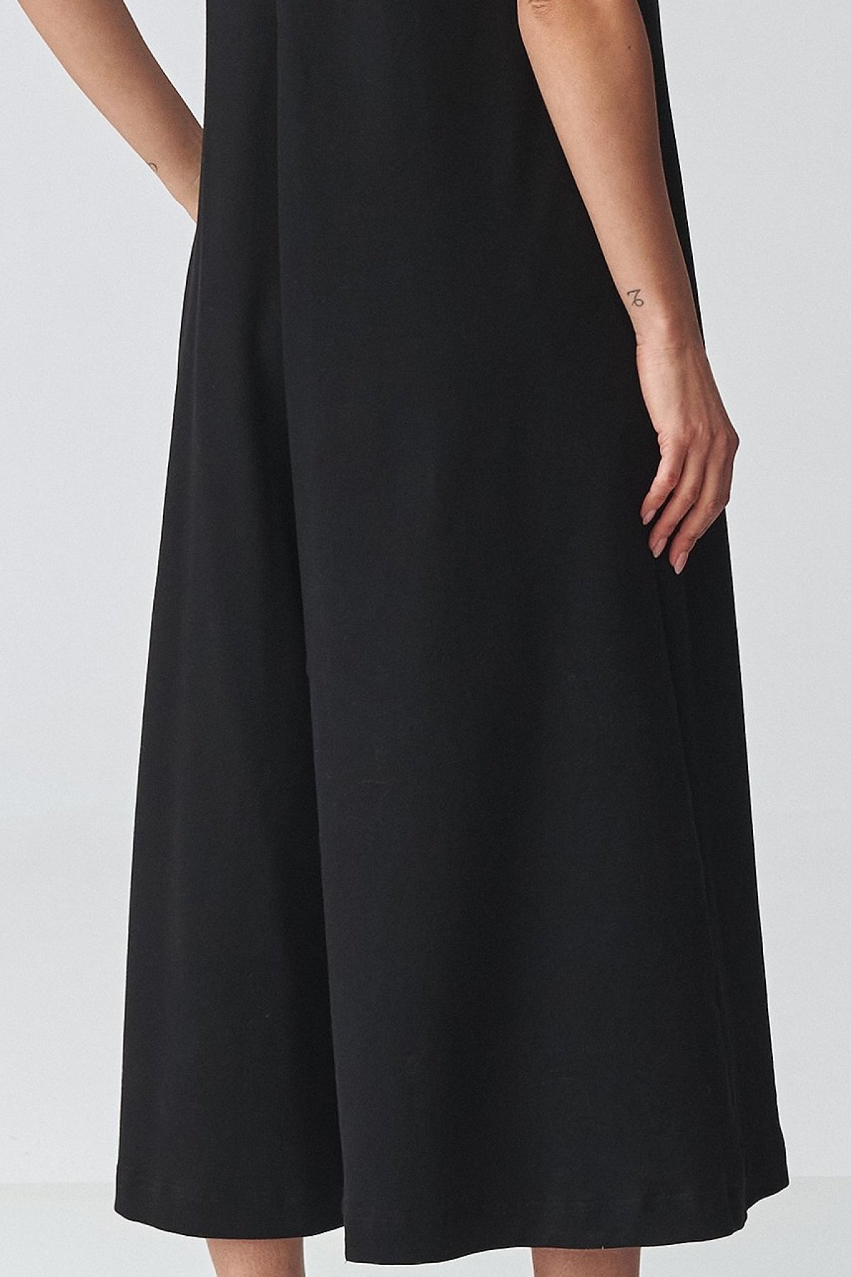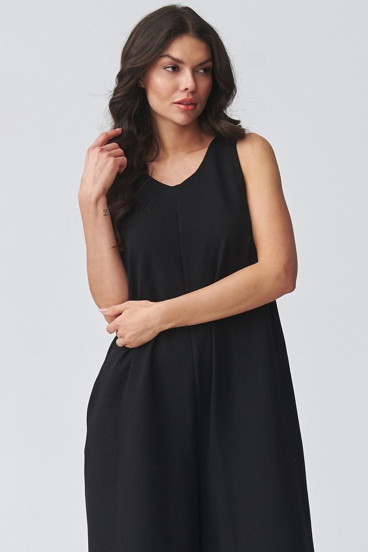Tento černý dámský overal s širokými nohavicemi spojuje čistý vzhled, pohodlí a nadčasový styl.