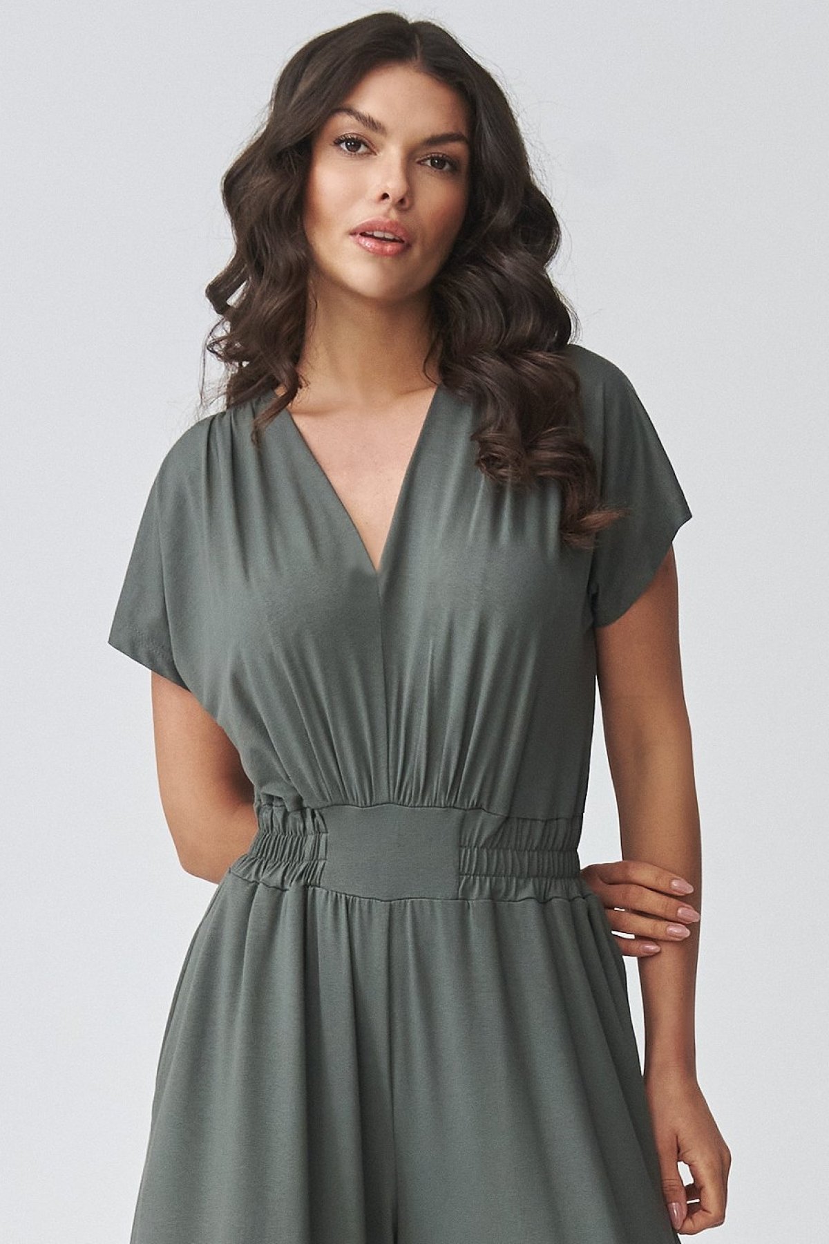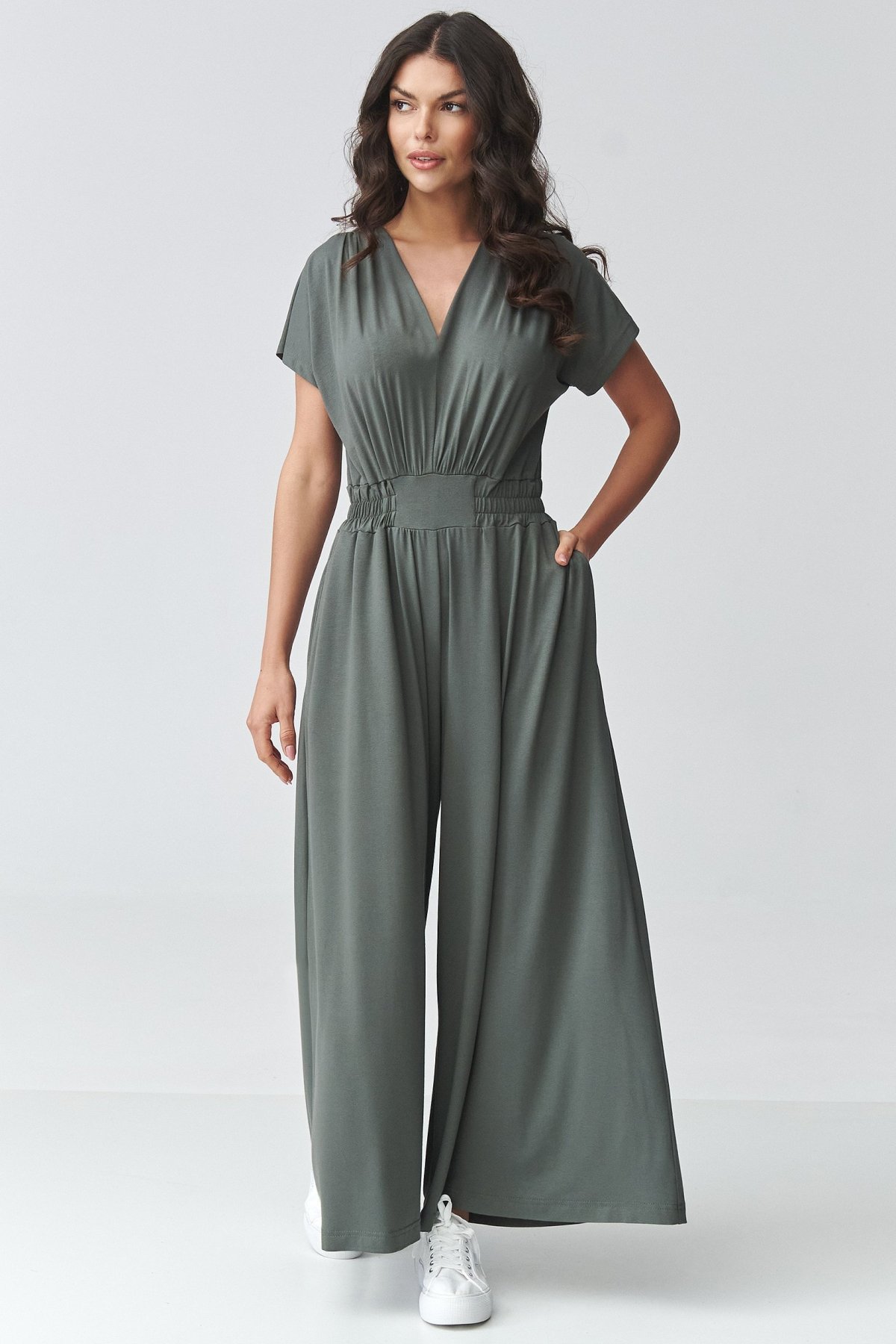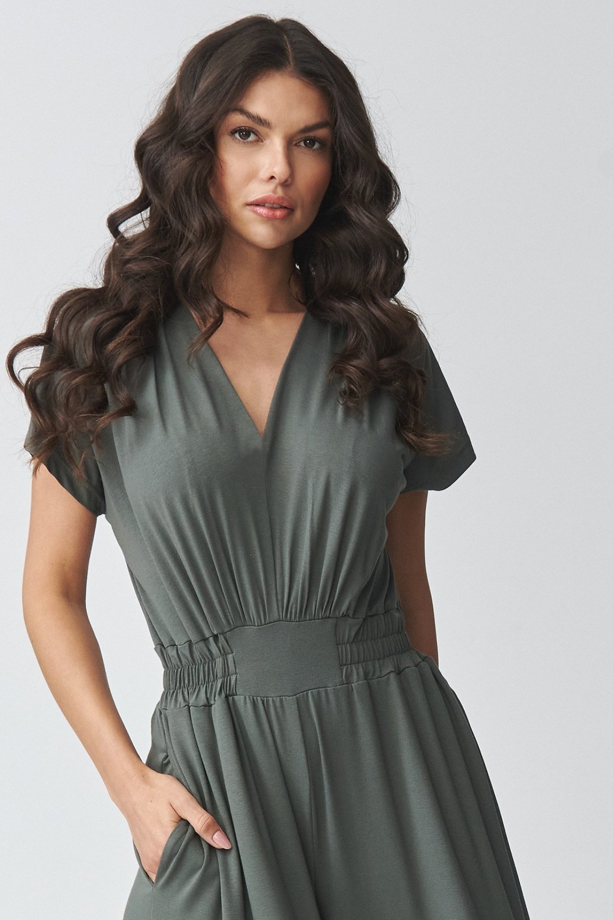 Model overalu v khaki odstínu je stylovou alternativou k šatům. Volnější, splývavý střih se přirozeně přizpůsobí postavě a vytváří elegantní siluetu. Řasení v pase jemně zvýrazní ženské křivky a dodá proporcím vyváženost. Hlubší výstřih do V opticky prodlužuje krk a dodává outfitu ženský, sofistikovaný výraz. Široké nohavice krásně splývají při chůzi, prodlužují nohy a zároveň zajišťují maximální pohodlí.