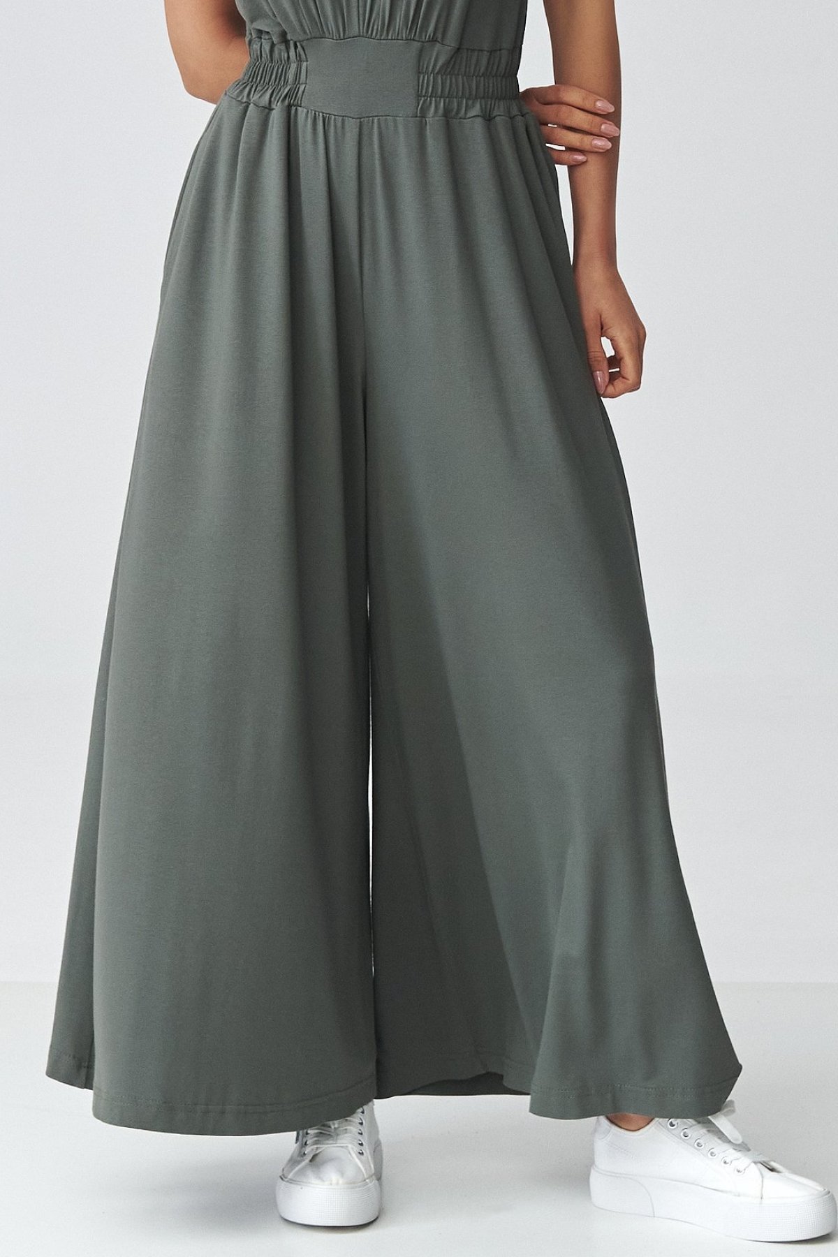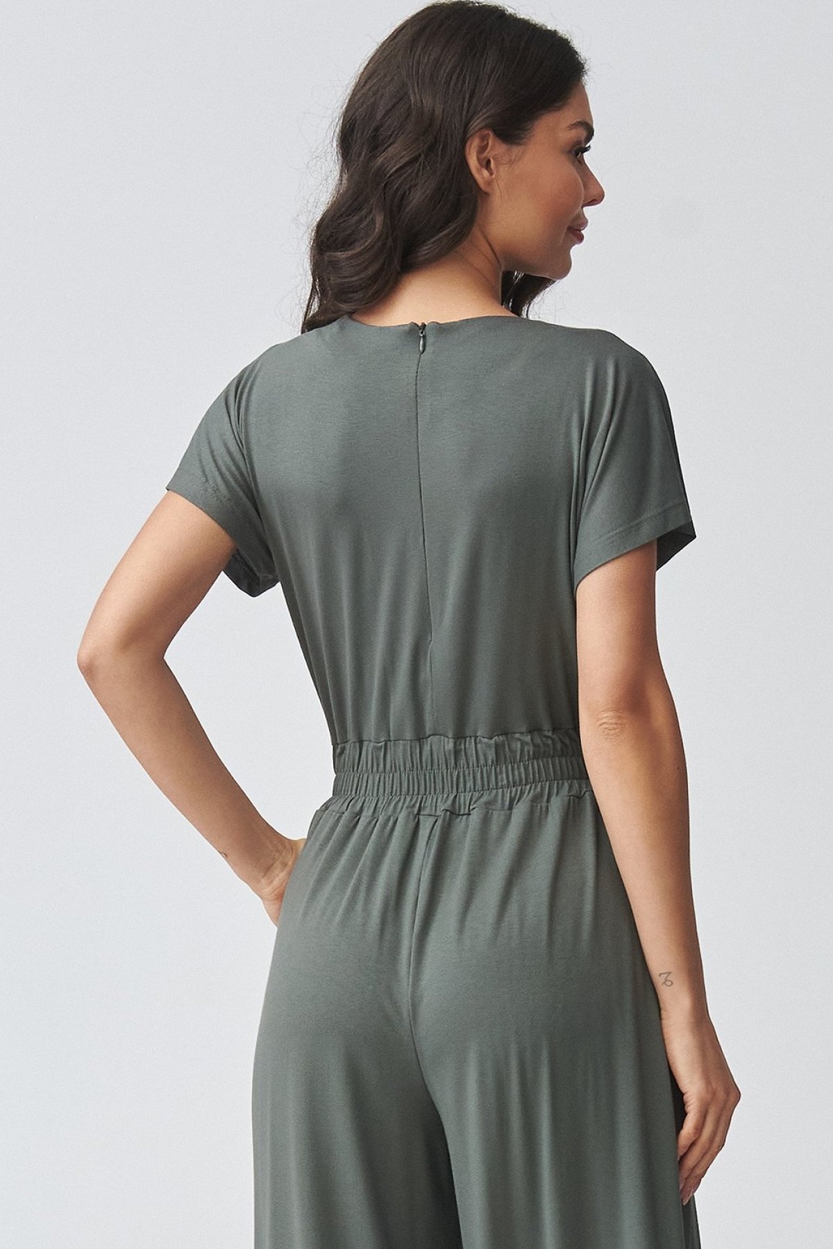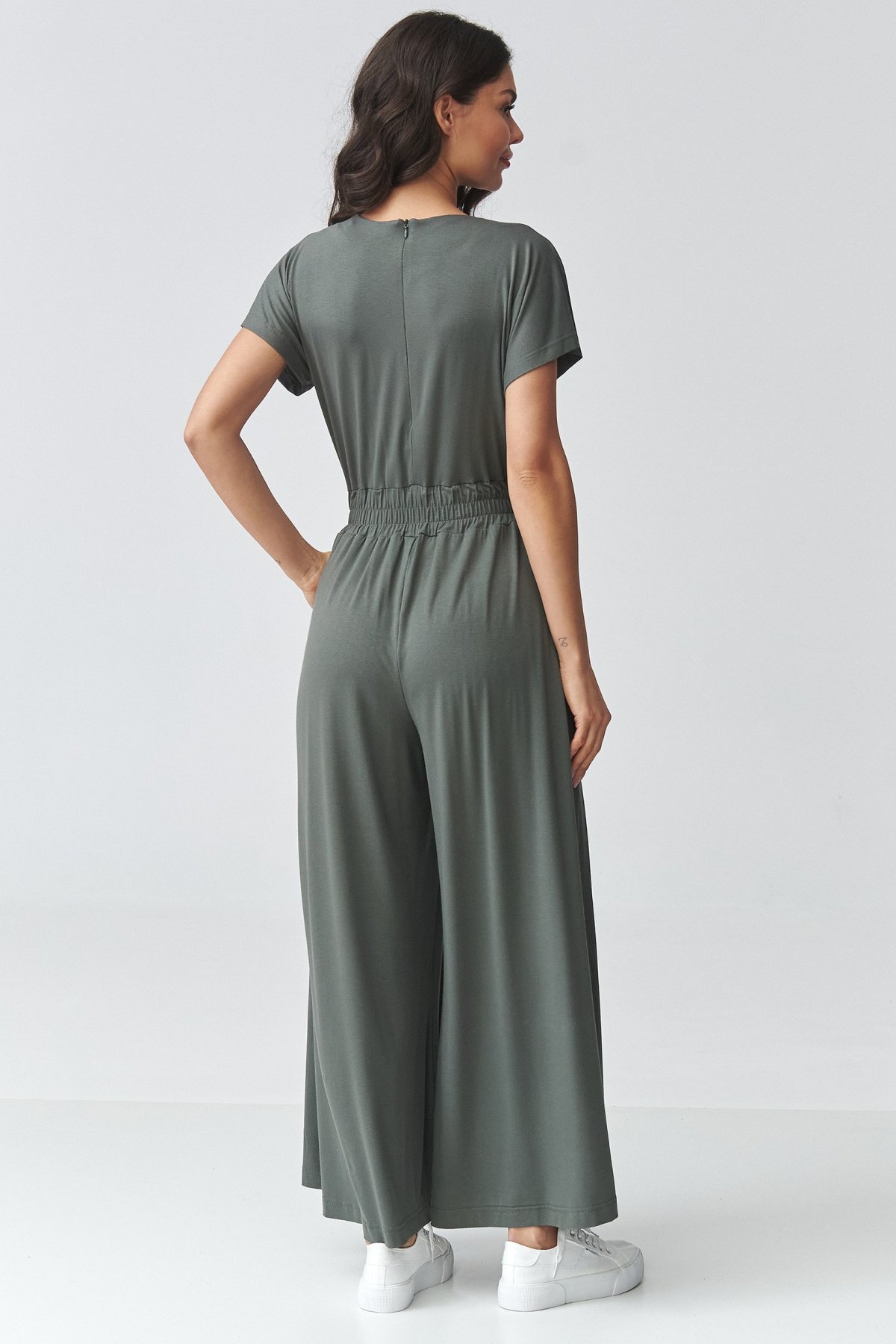 Model overalu v khaki odstínu je stylovou alternativou k šatům. Volnější, splývavý střih se přirozeně přizpůsobí postavě a vytváří elegantní siluetu. Řasení v pase jemně zvýrazní ženské křivky a dodá proporcím vyváženost. Hlubší výstřih do V opticky prodlužuje krk a dodává outfitu ženský, sofistikovaný výraz. Široké nohavice krásně splývají při chůzi, prodlužují nohy a zároveň zajišťují maximální pohodlí.